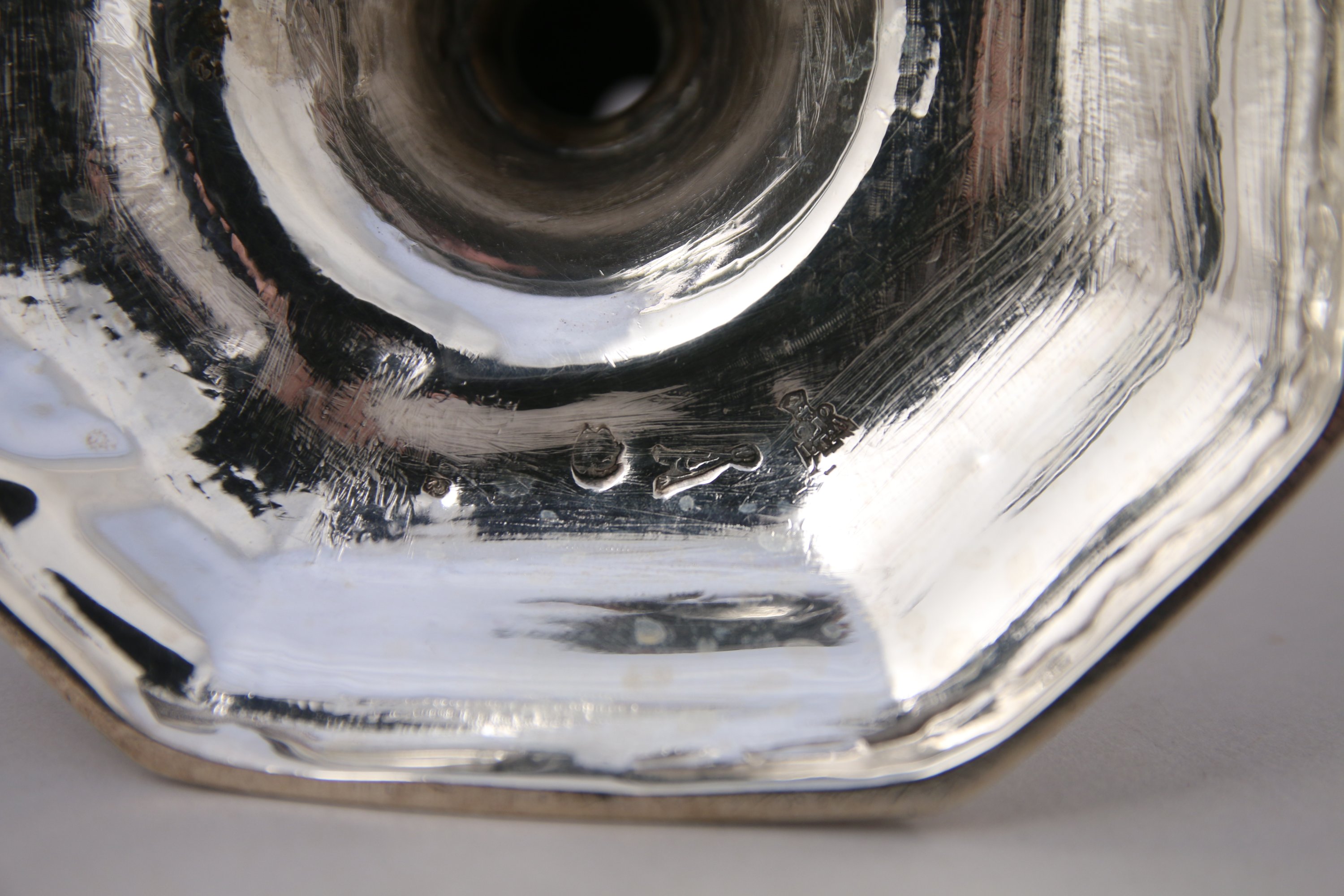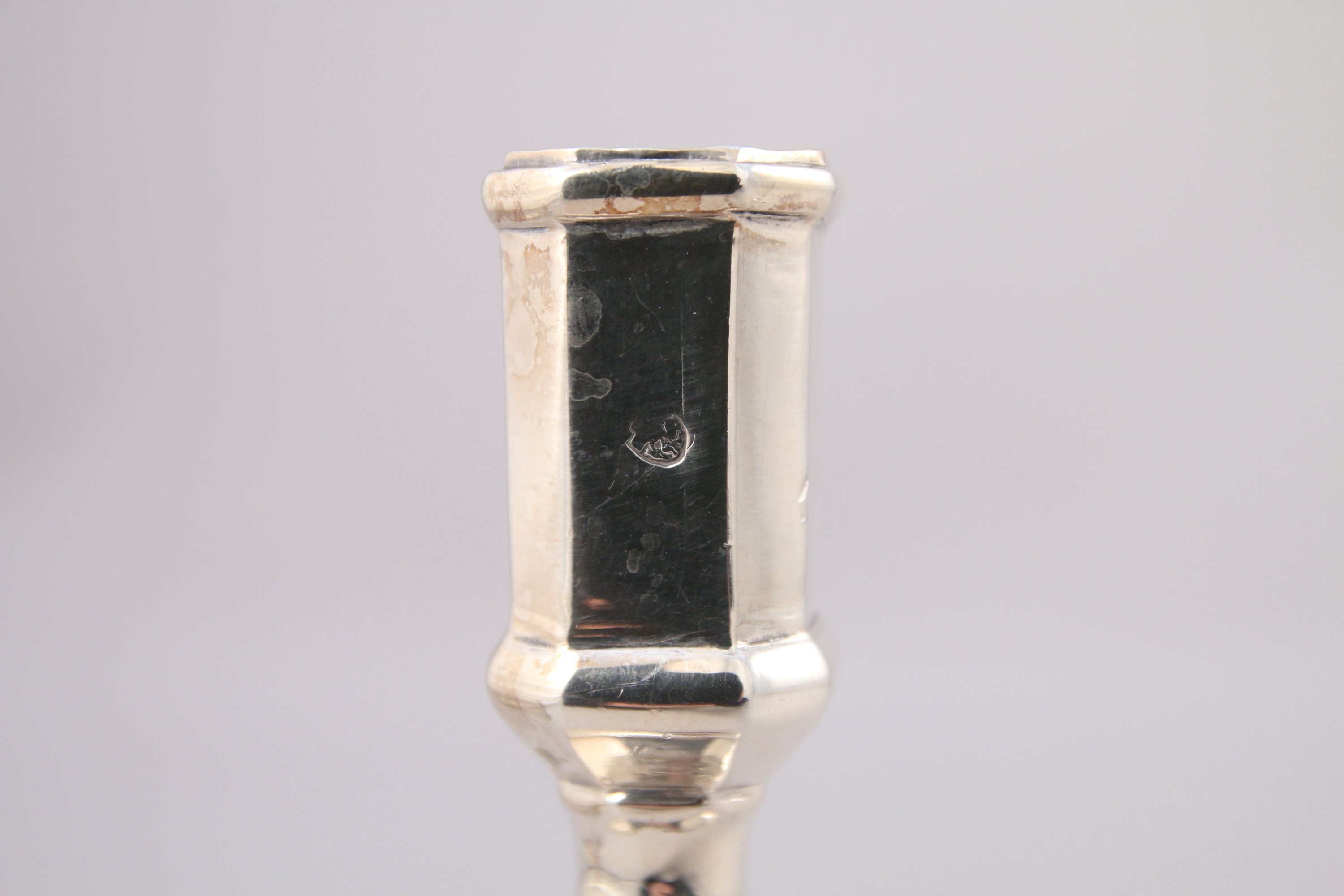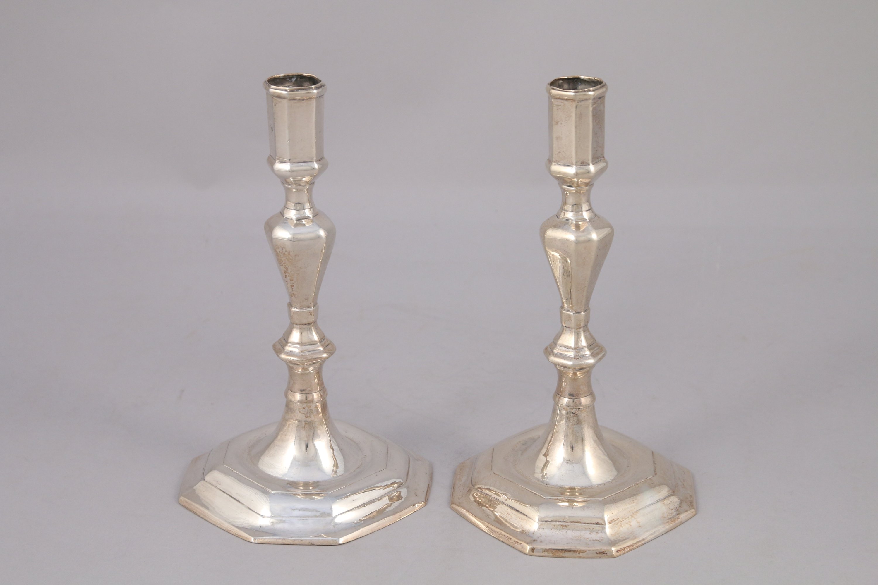 PAIRE de FLAMBEAUX en argent. Fût balustre à pans coupés, base à doucine à huit pans.