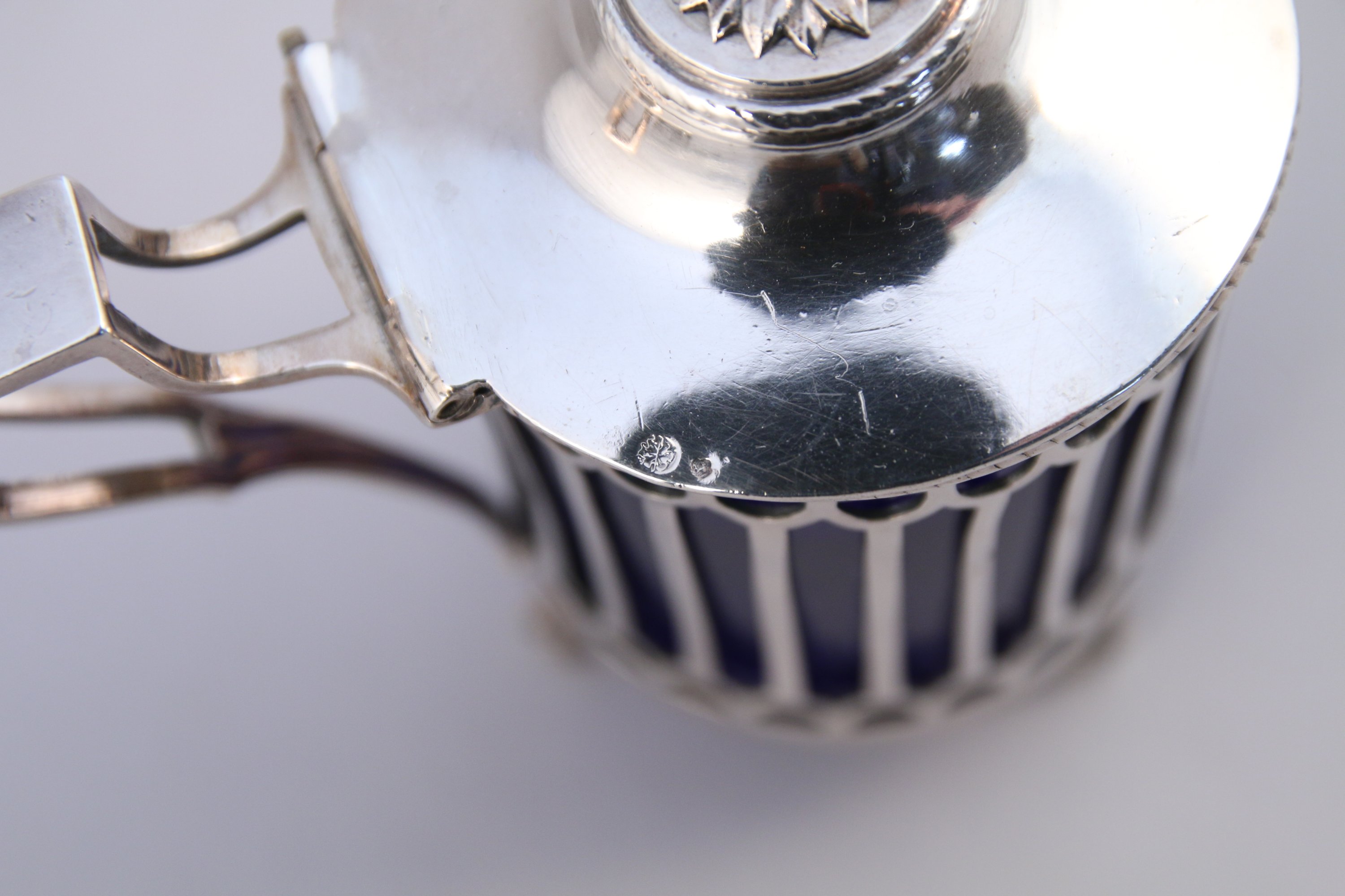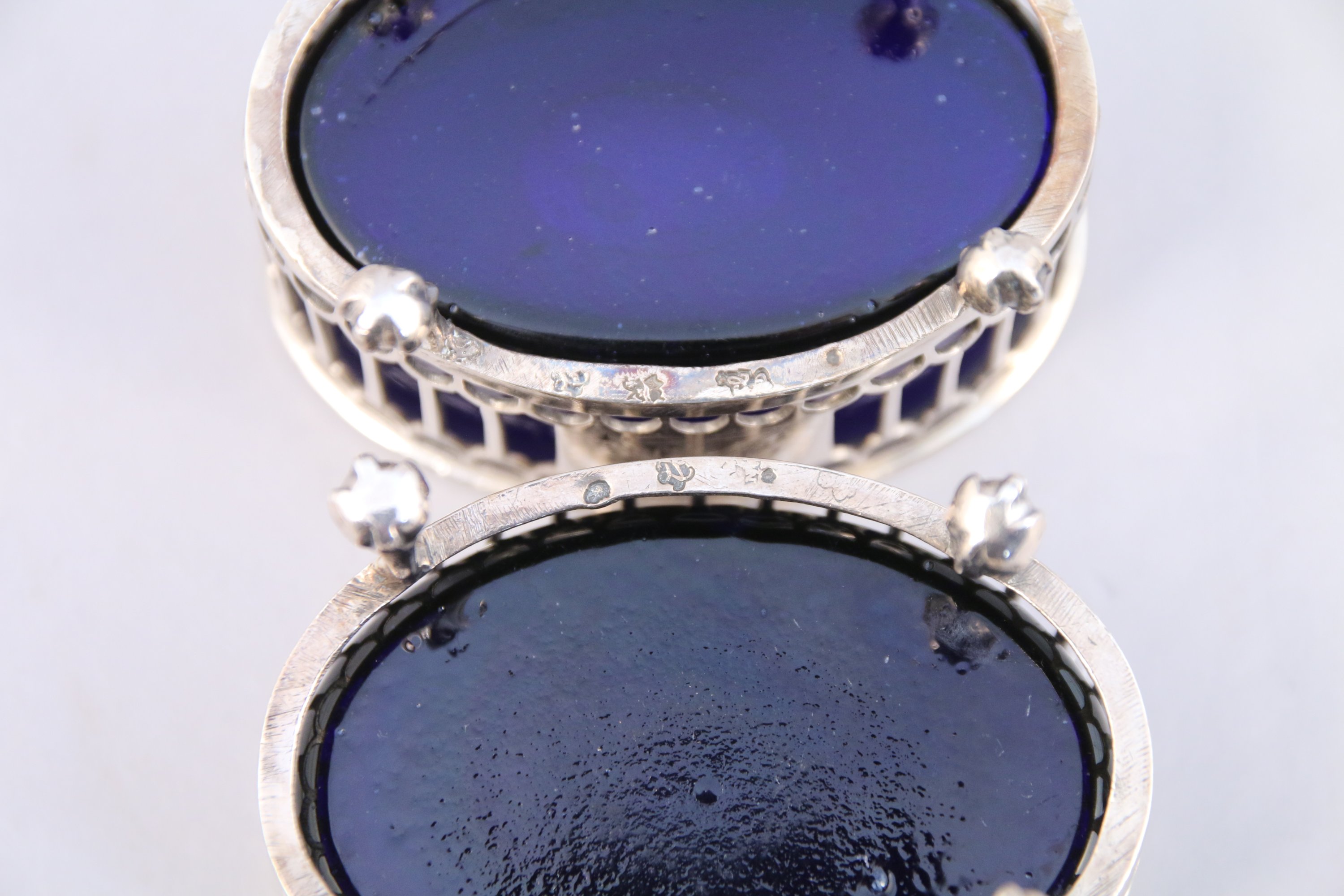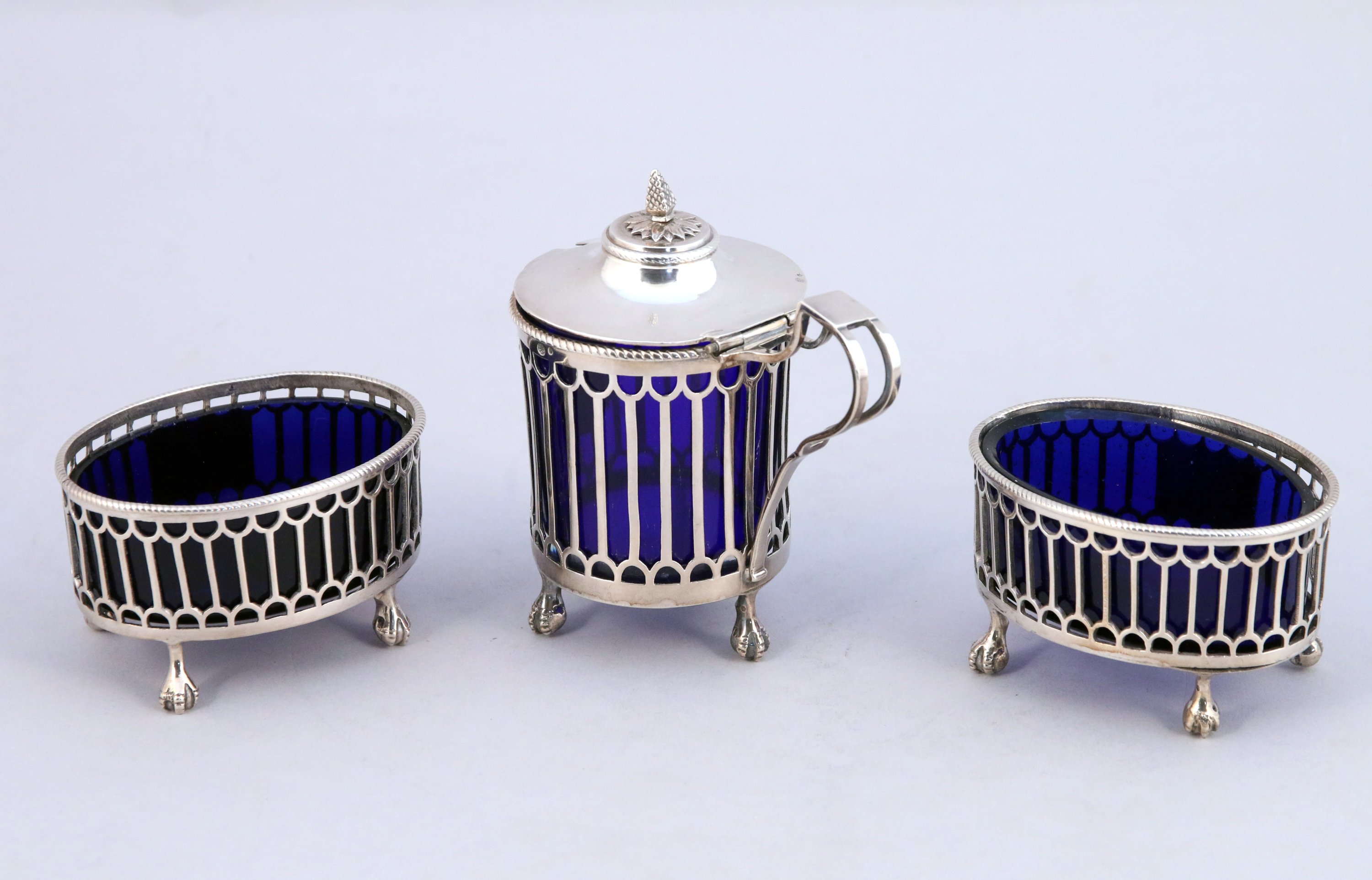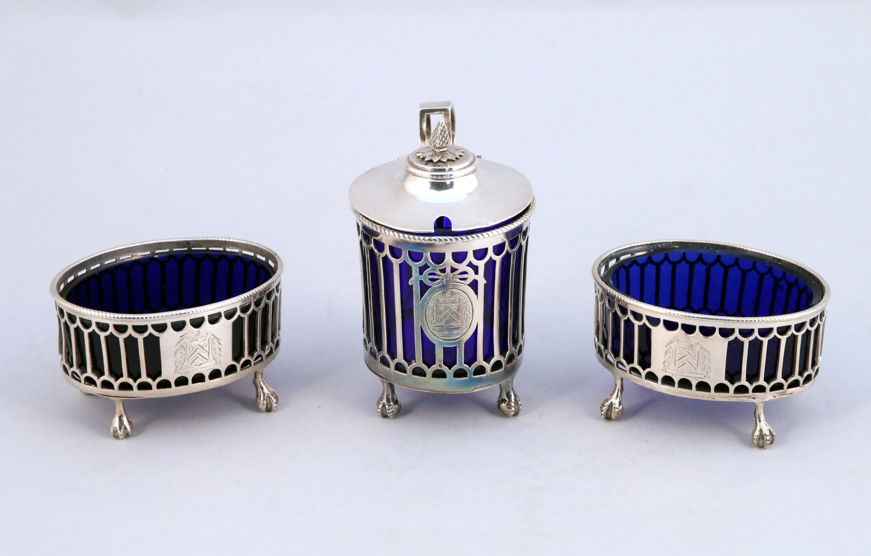 MOUTARDIER et PAIRE de SALERONS en argent, de style Directoire. Modèle à arcatures, pieds griffe. Armoiries.