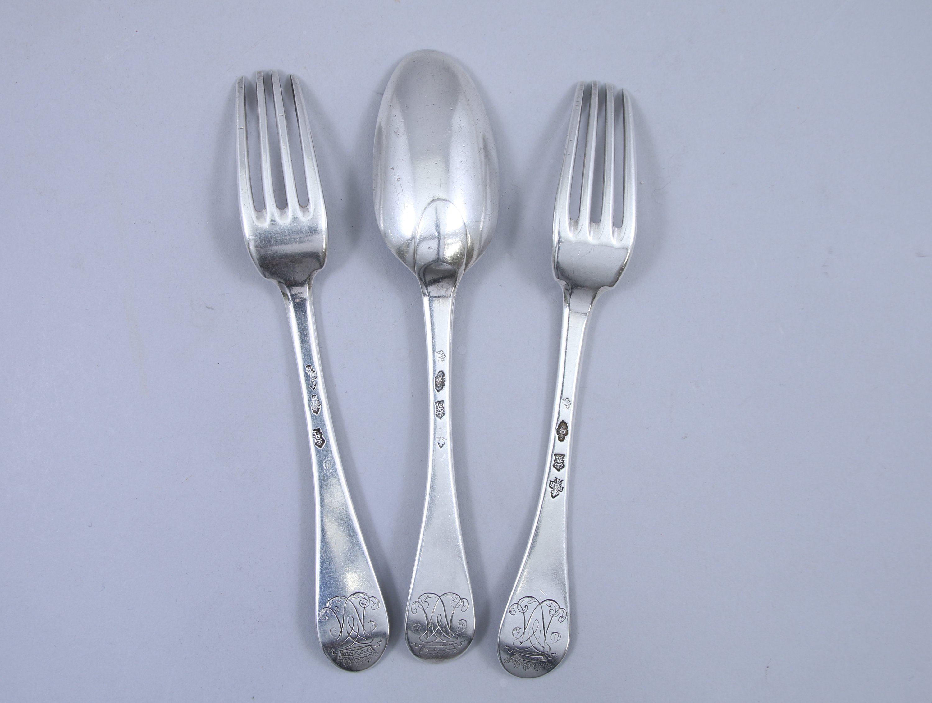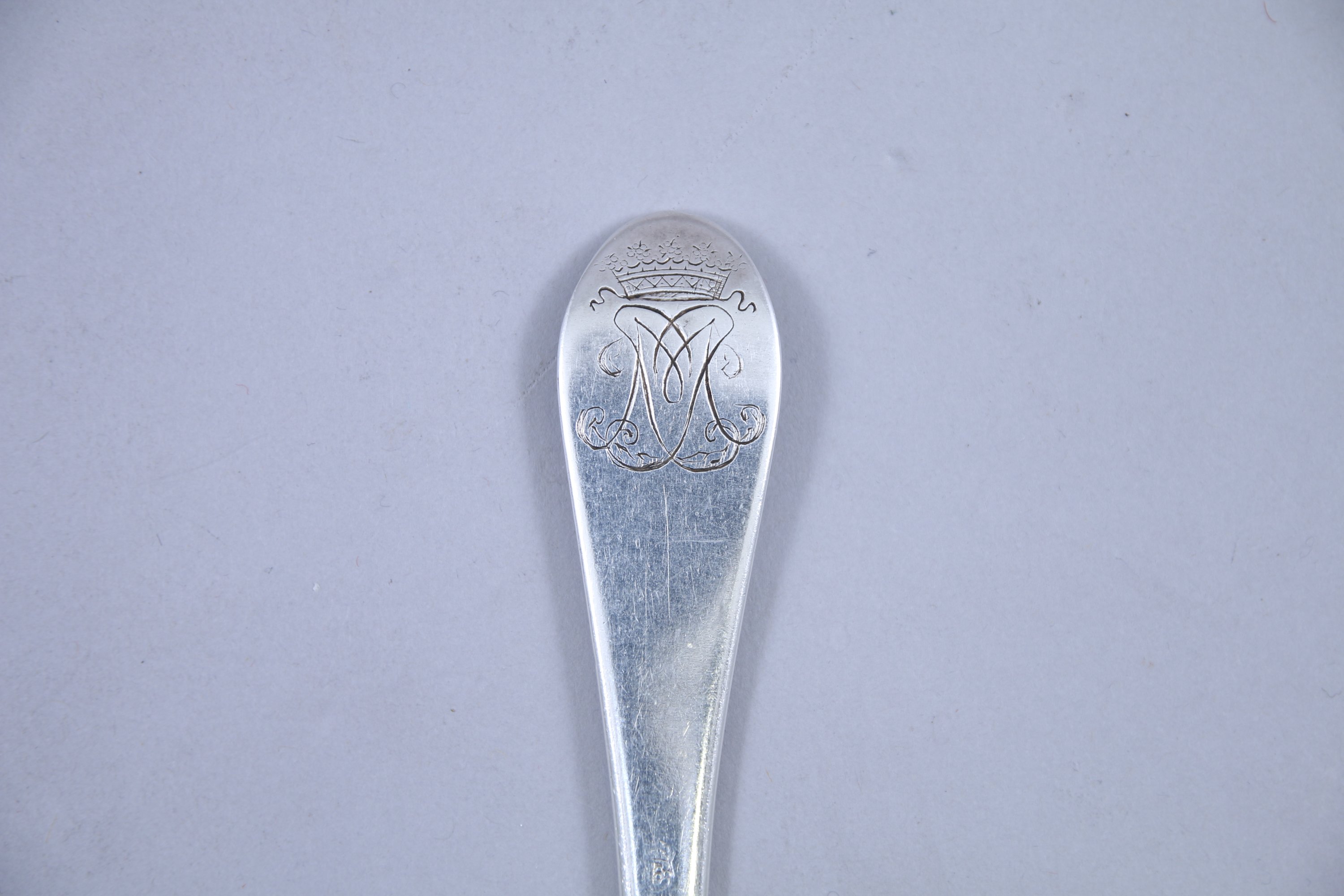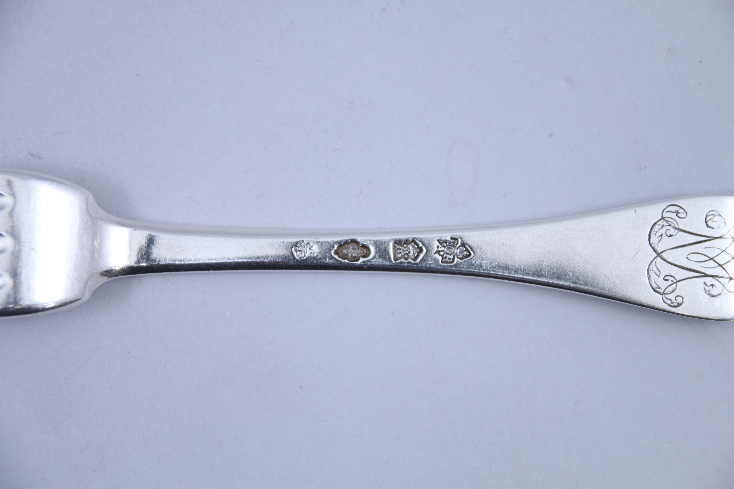 Un COUVERT et une FOURCHETTE de TABLE en argent modèle uniplat. Gravés de chiffres entrelacés surmontés d'une couronne marquisale.