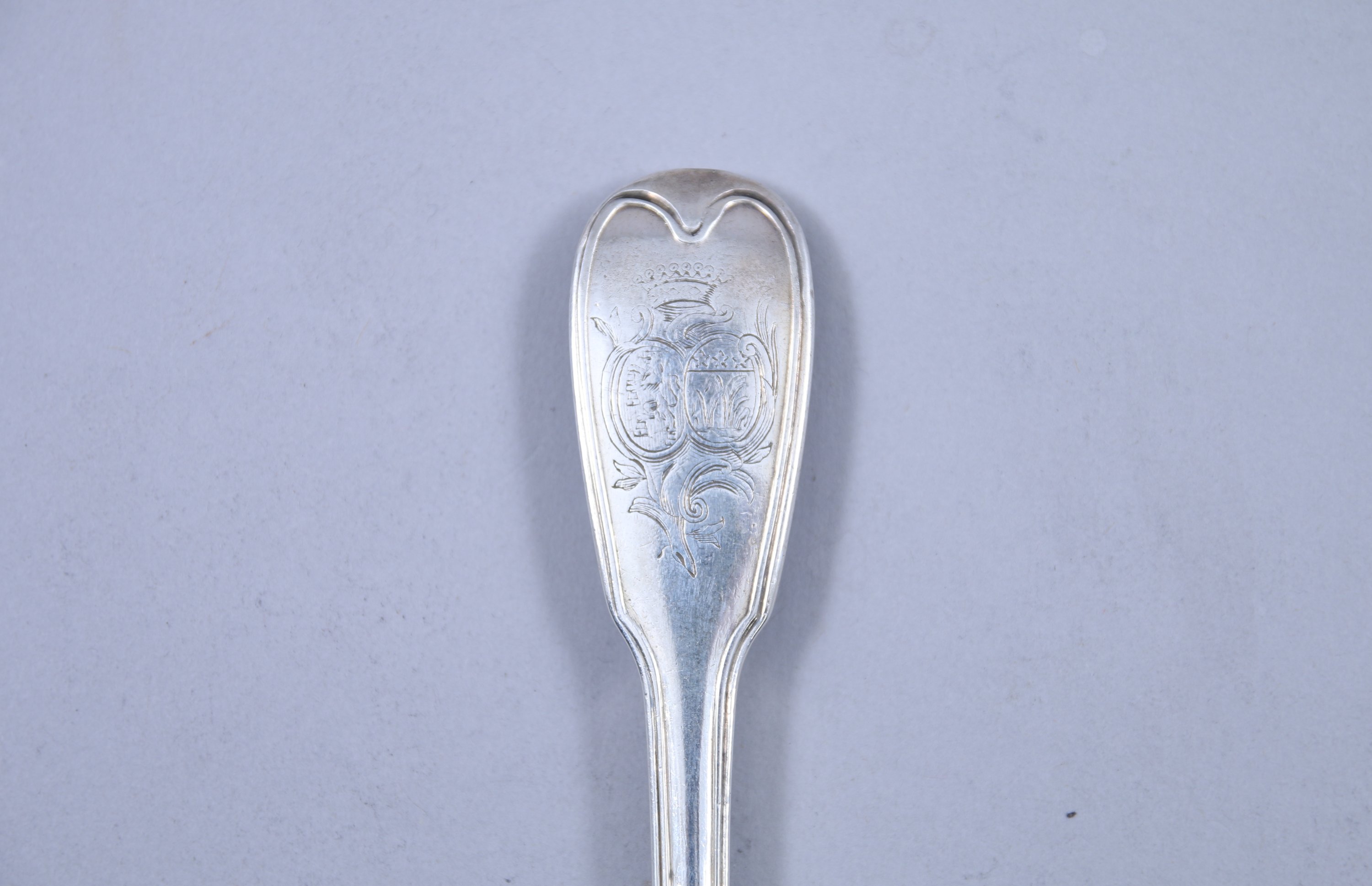 Douze COUVERTS de TABLE en argent modèle filet, aux armes alliances coiffées d'une couronne comtale.