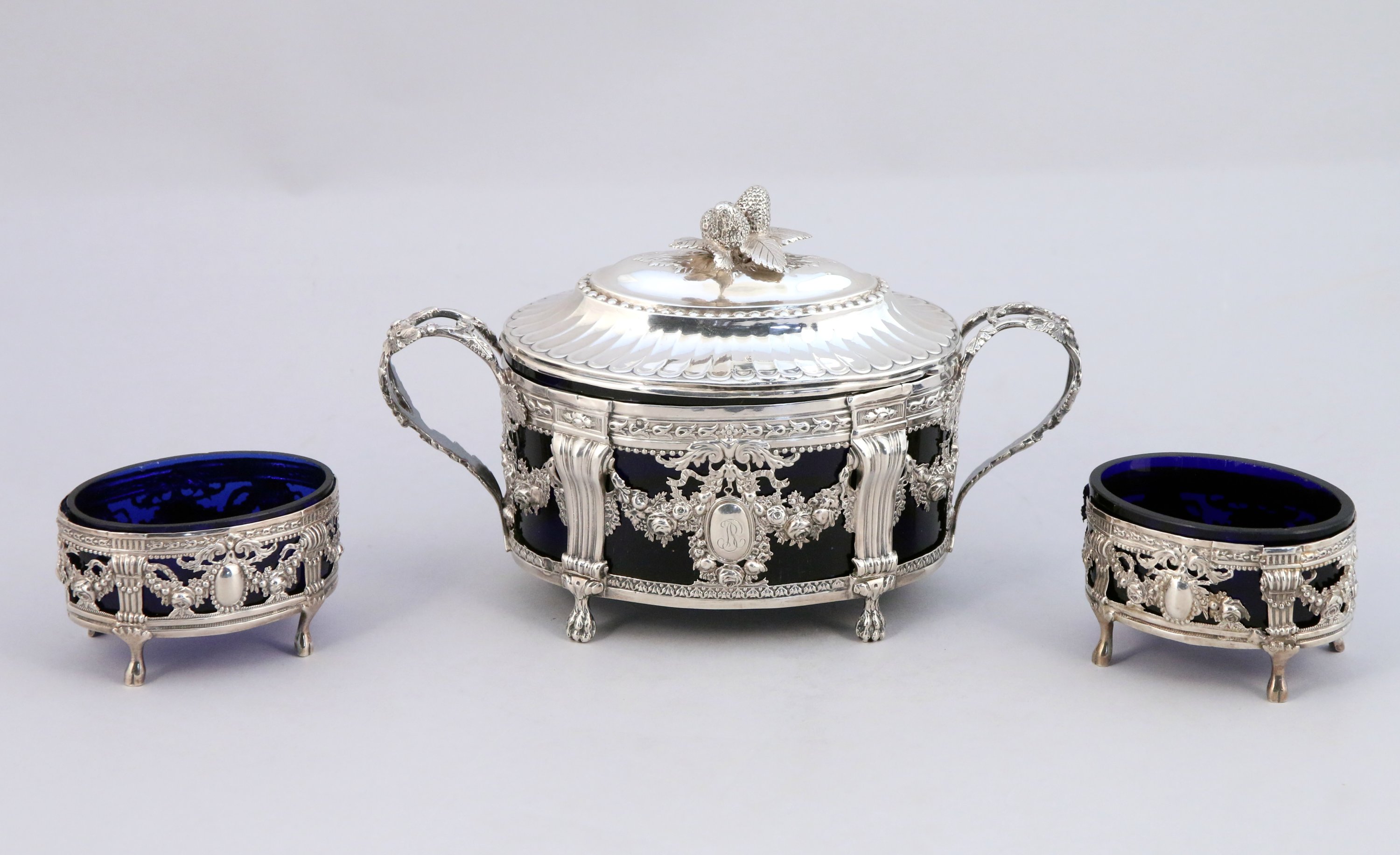 SUCRIER couvert en argent, le dessus présentant un fretel à graines sur une terrasse de six feuilles entourée d'un rang de perles surmontant un décor de godrons. Deux anses à motifs de pampres de vigne. La panse composée de pilastres reliés par des guirlandes fleuries entourant au centre un médaillon au chiffre "AR". Repose sur quatre pieds griffes.