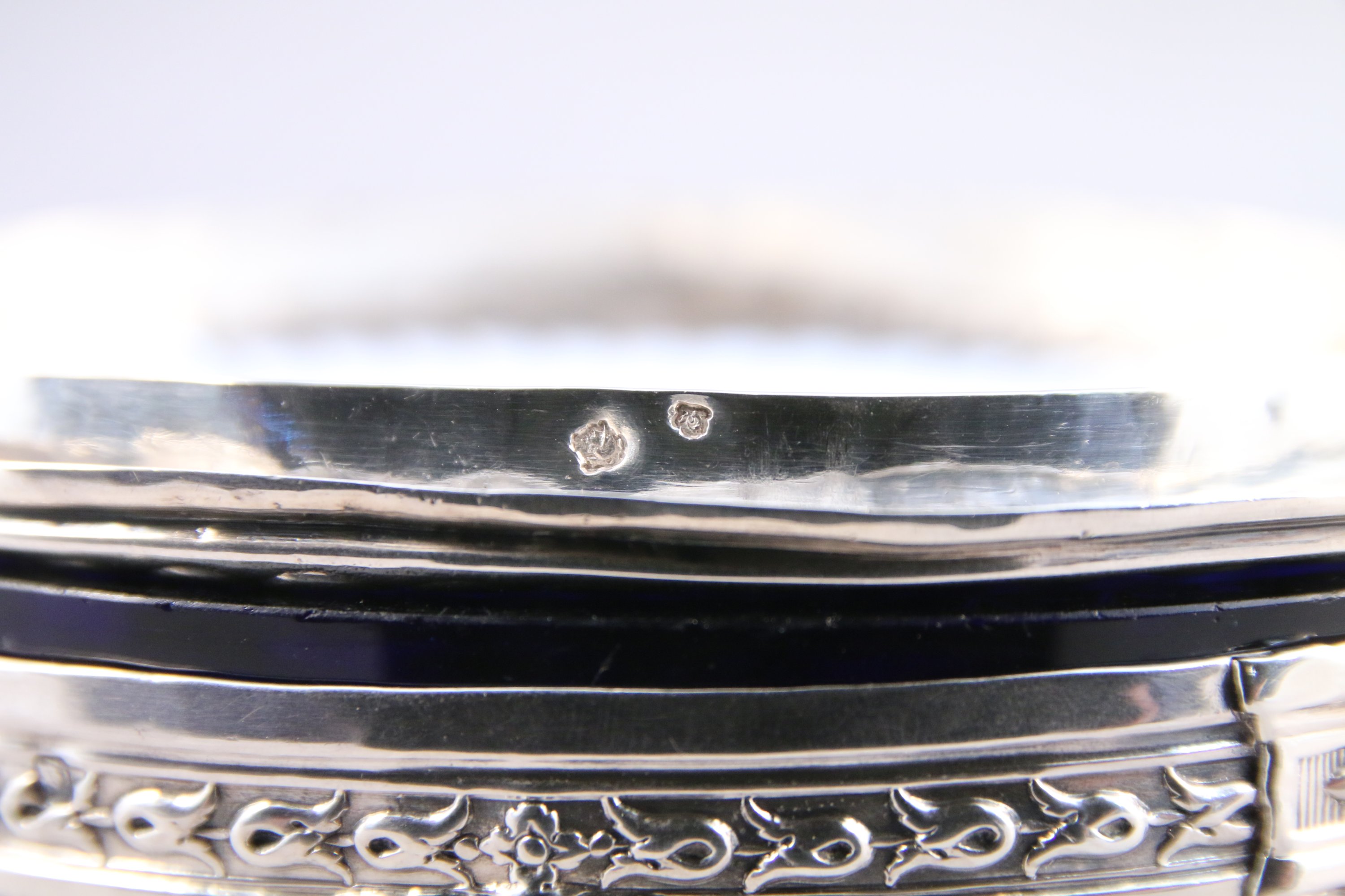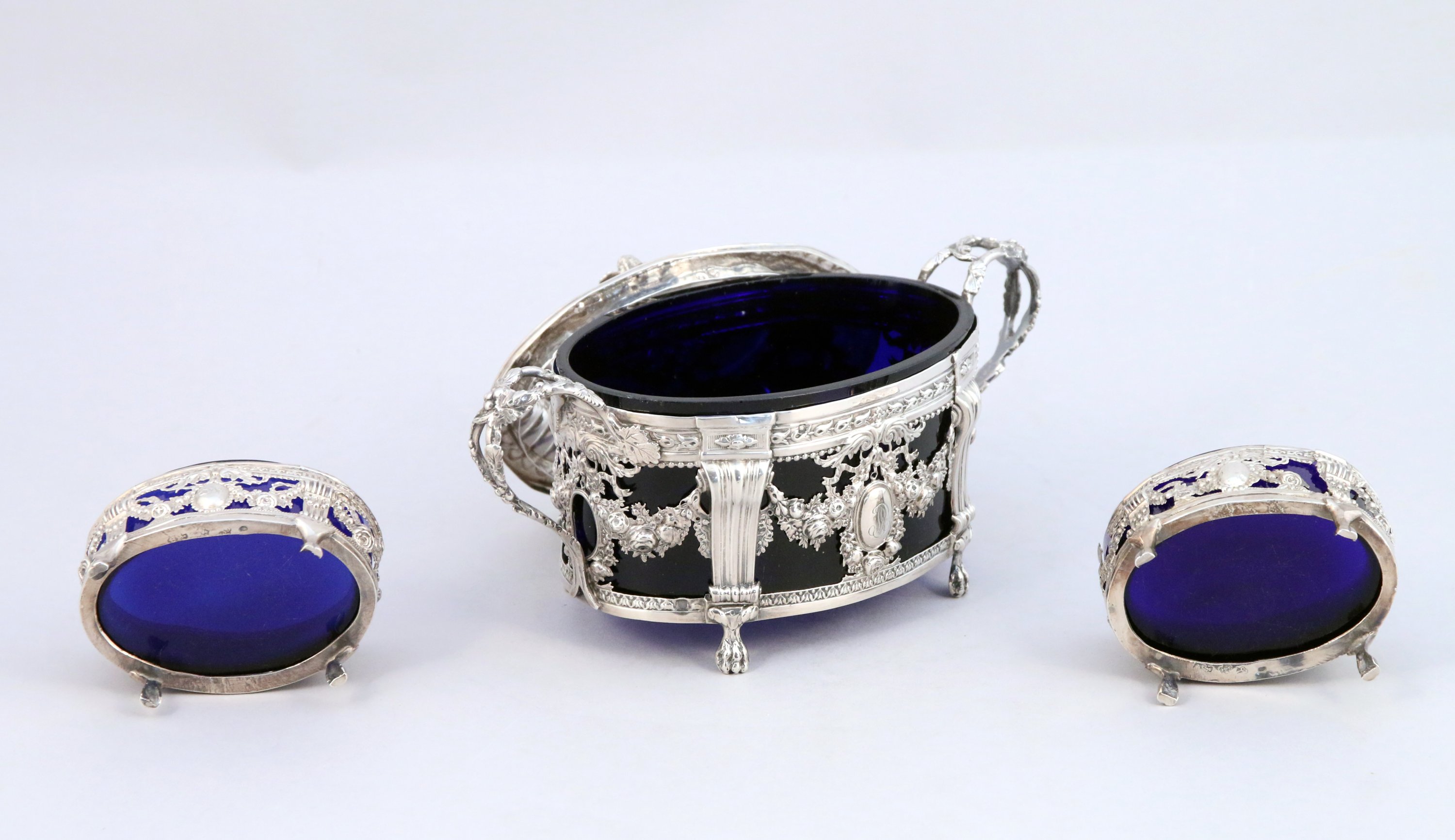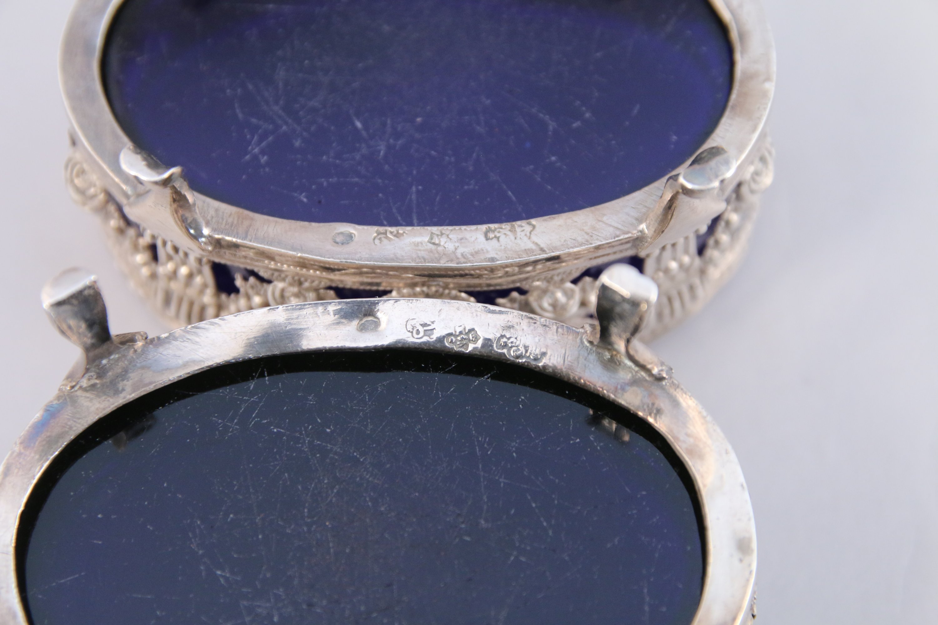 JOINT: Deux SALERONS en argent à décor de pilastres et guirlandes fleuries. Poinçons des fermiers généraux. Intérieur en verre bleu. Poids brut: 250 g. Haut. 3, Long. 6 cm.
