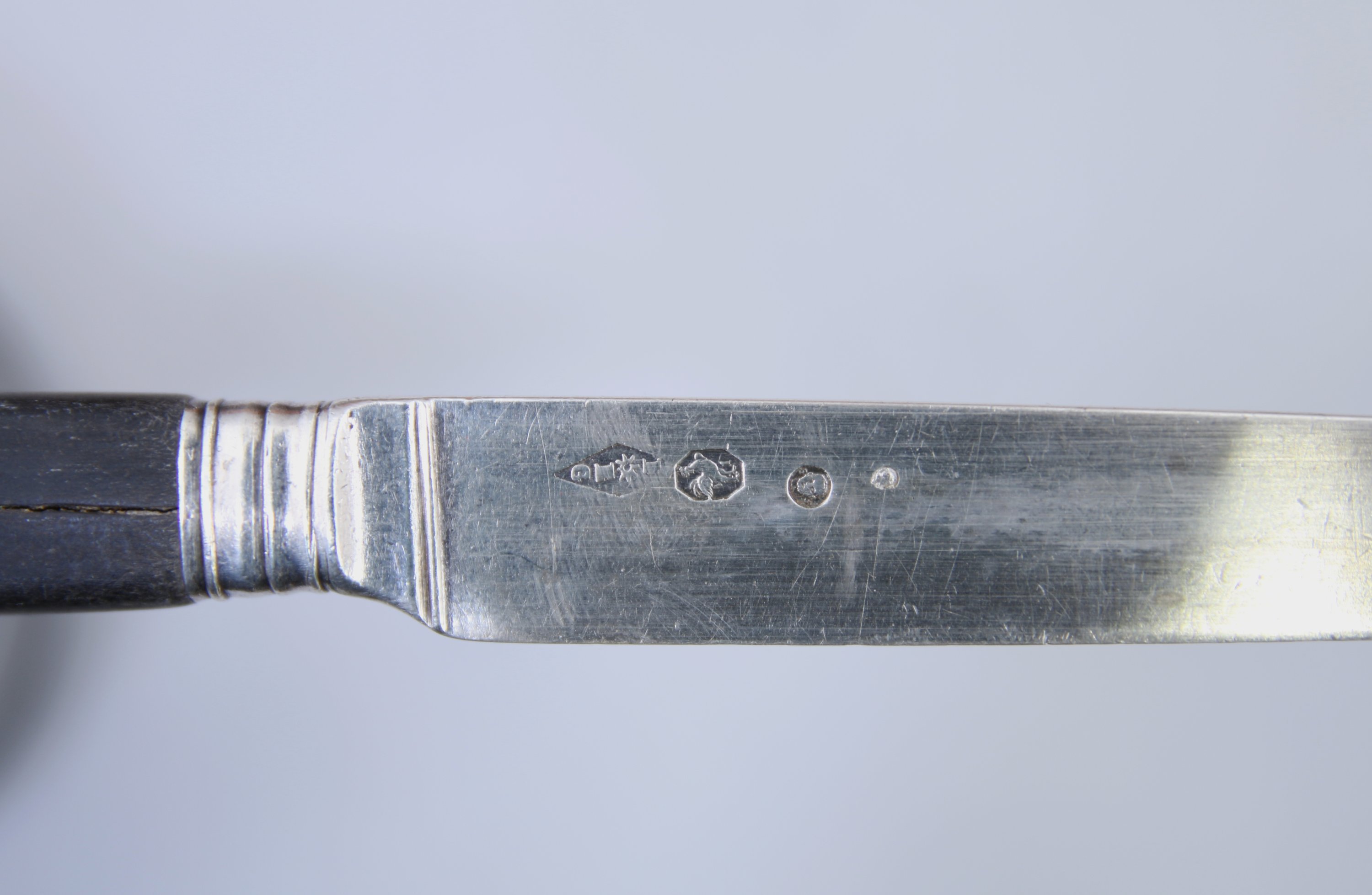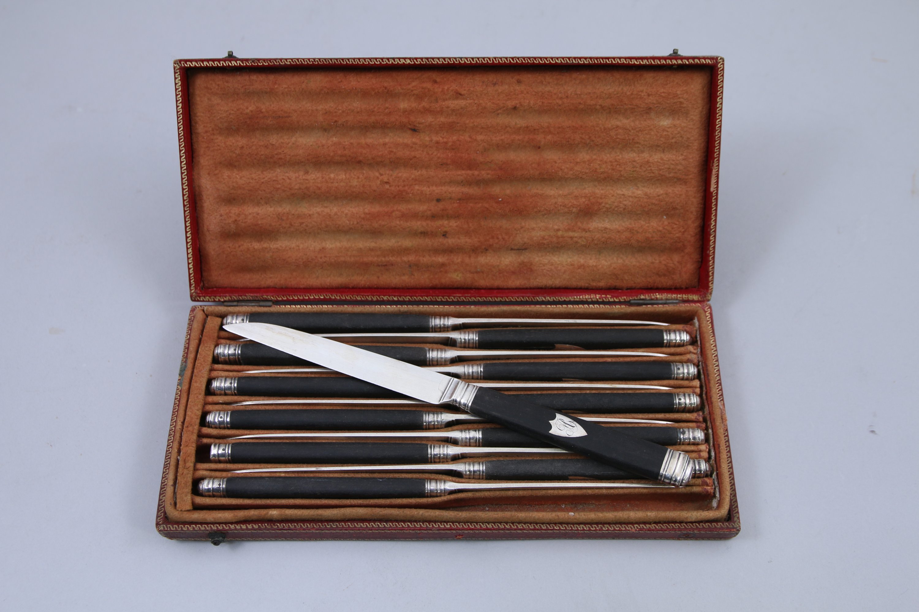 Douze COUTEAUX à dessert en argent et bois noirci. Poinçon...