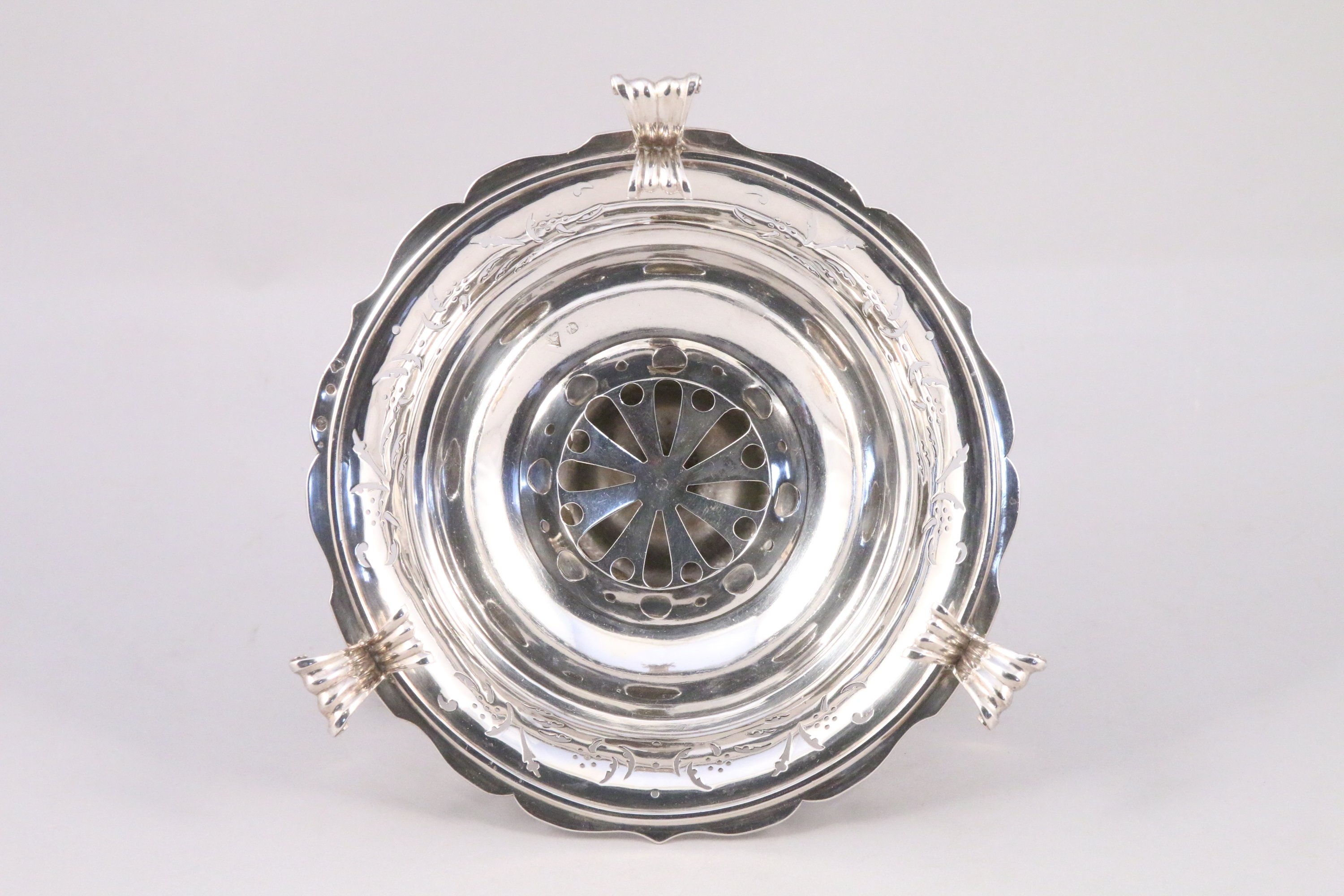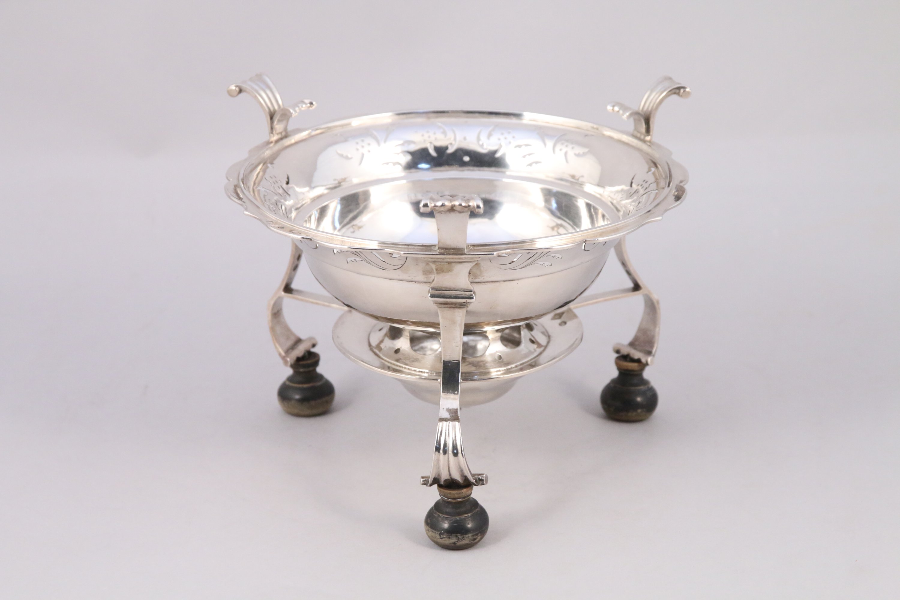 RÉCHAUD de TABLE en argent, repose sur trois patins en bois noirci. Bassin repercé d'entrelacs.