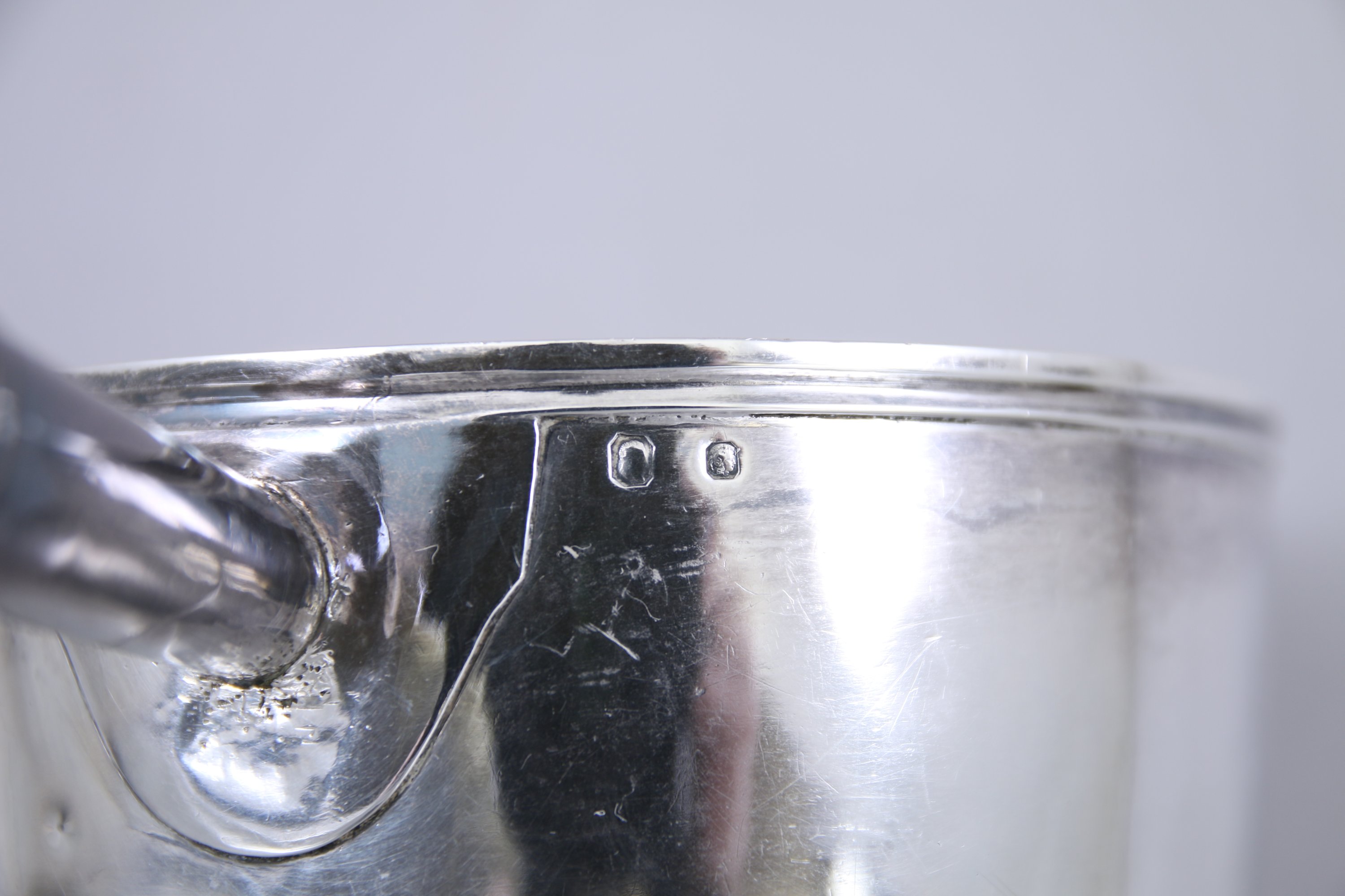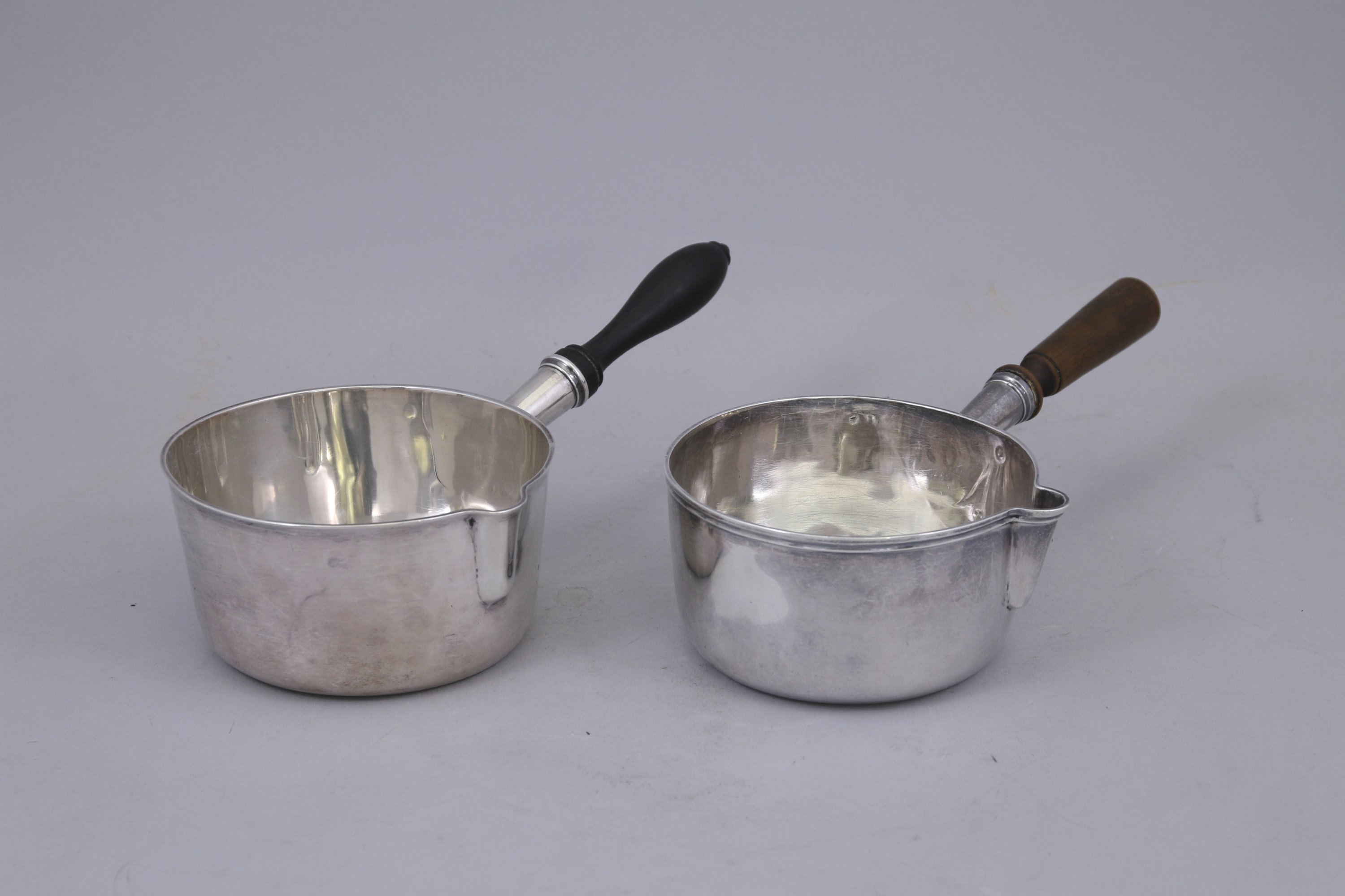 Deux petites CASSEROLES en argent uni, manche latéral en bois et bois noirci.