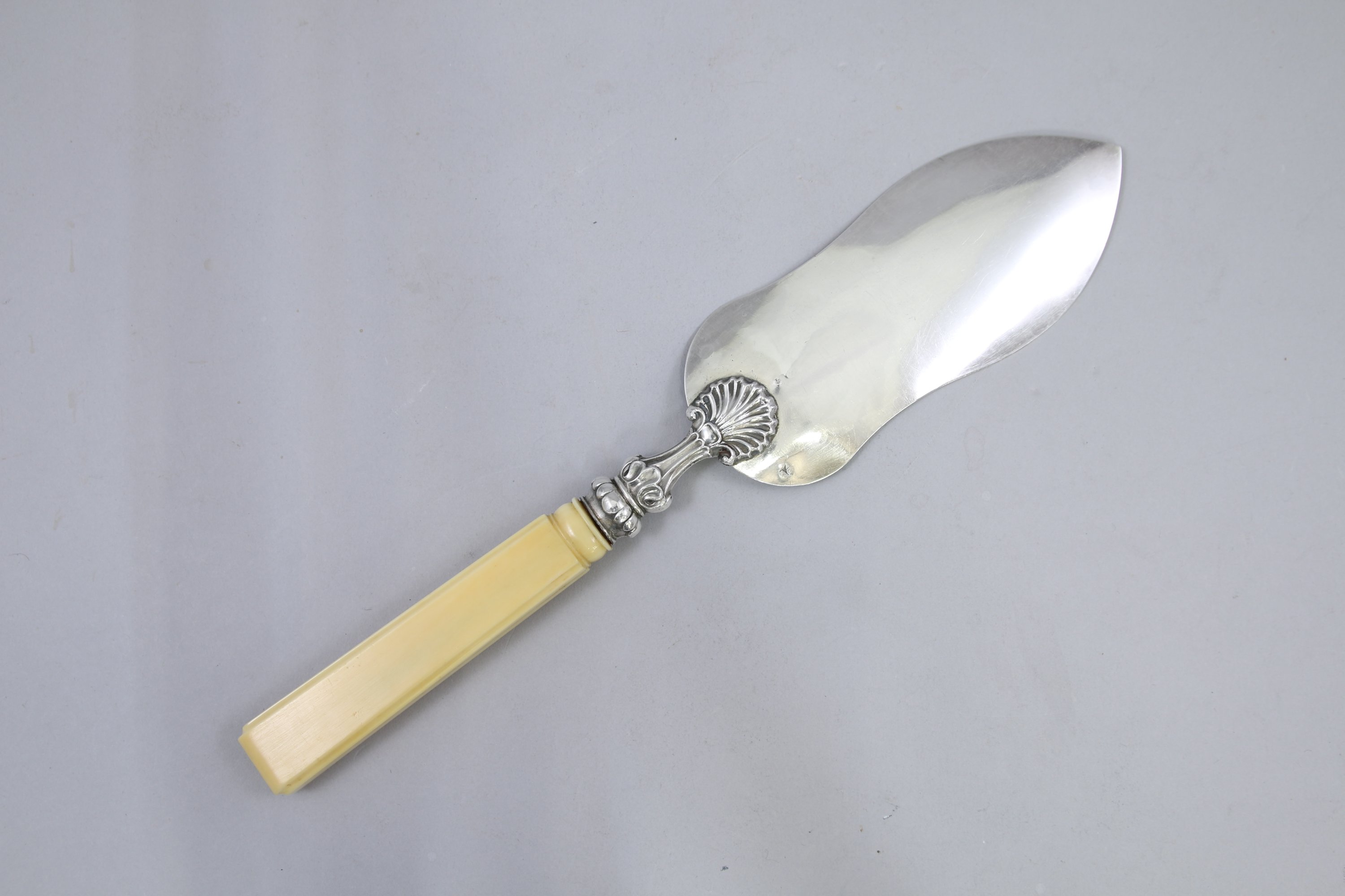 PELLE à TARTE en argent, le manche en os. Décor de motifs de feuillages et glands gravés et de coquille en relief.