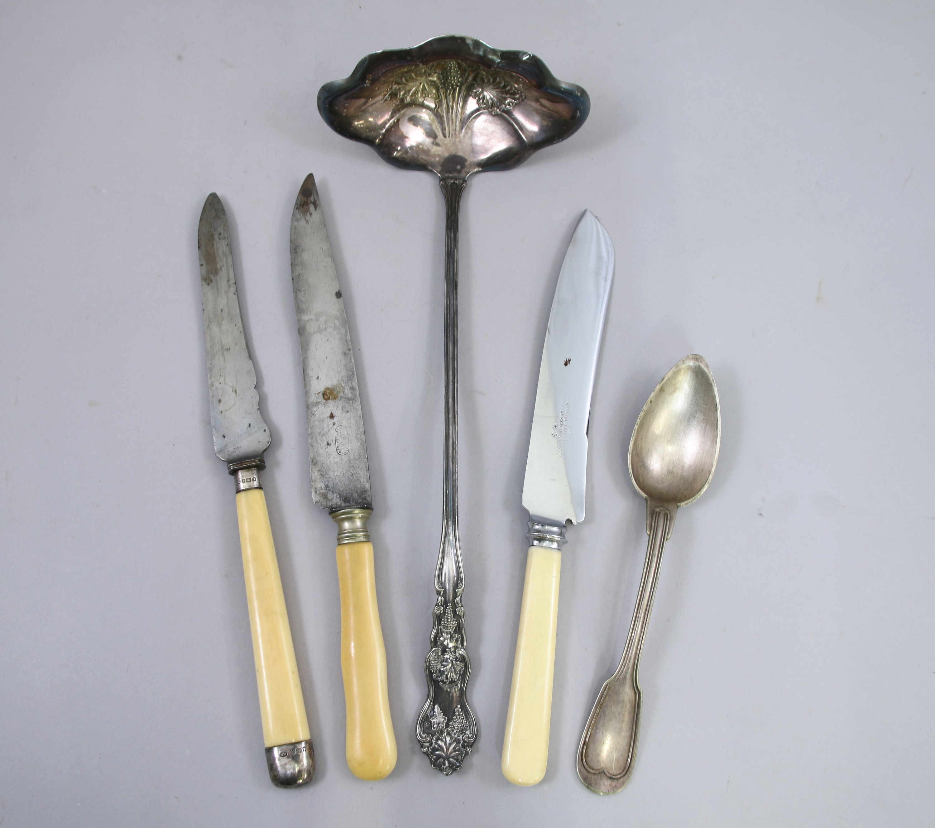 JOINTS: Trois COUTEAUX, une LOUCHE et une CUILLER en métal argenté ou acier.