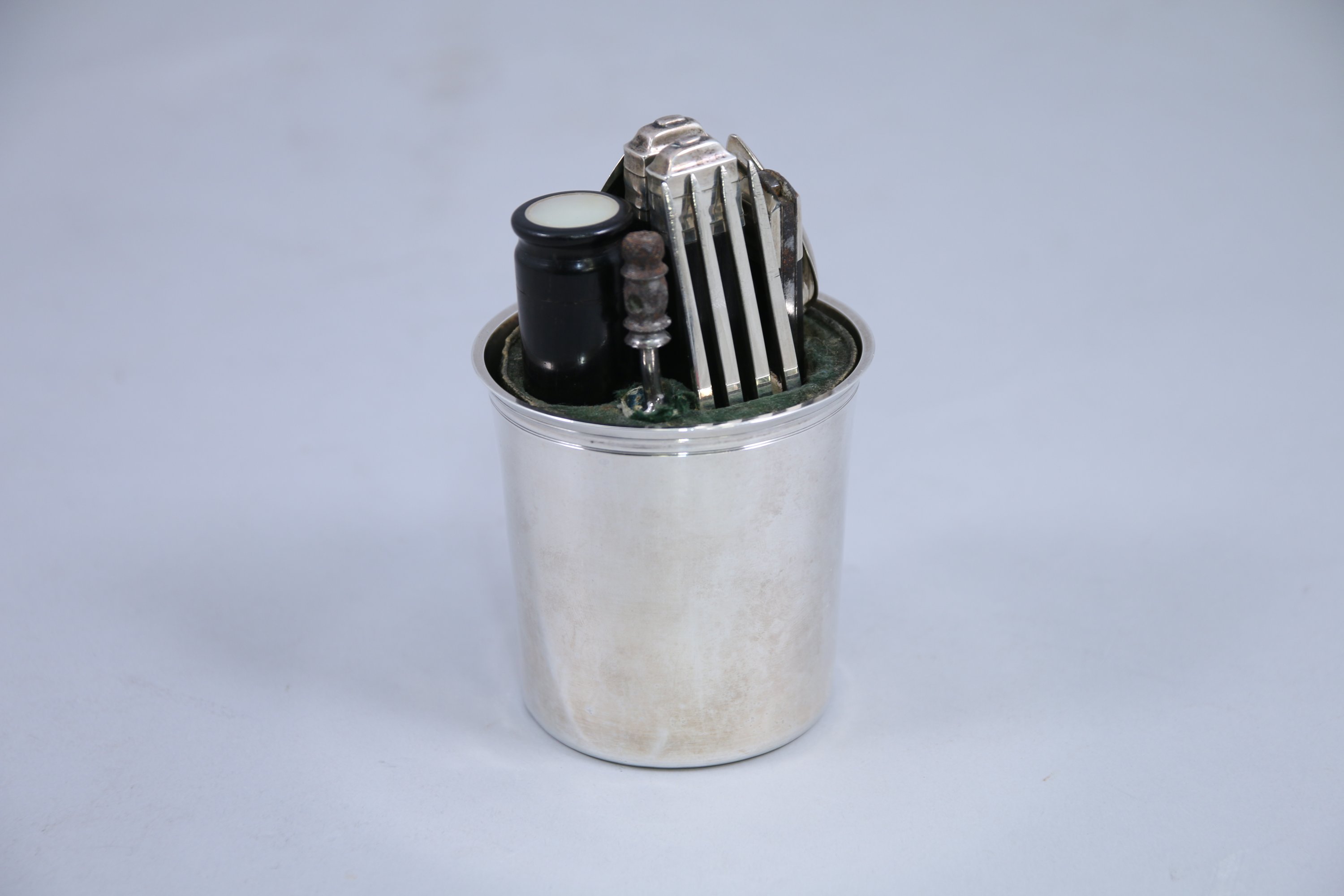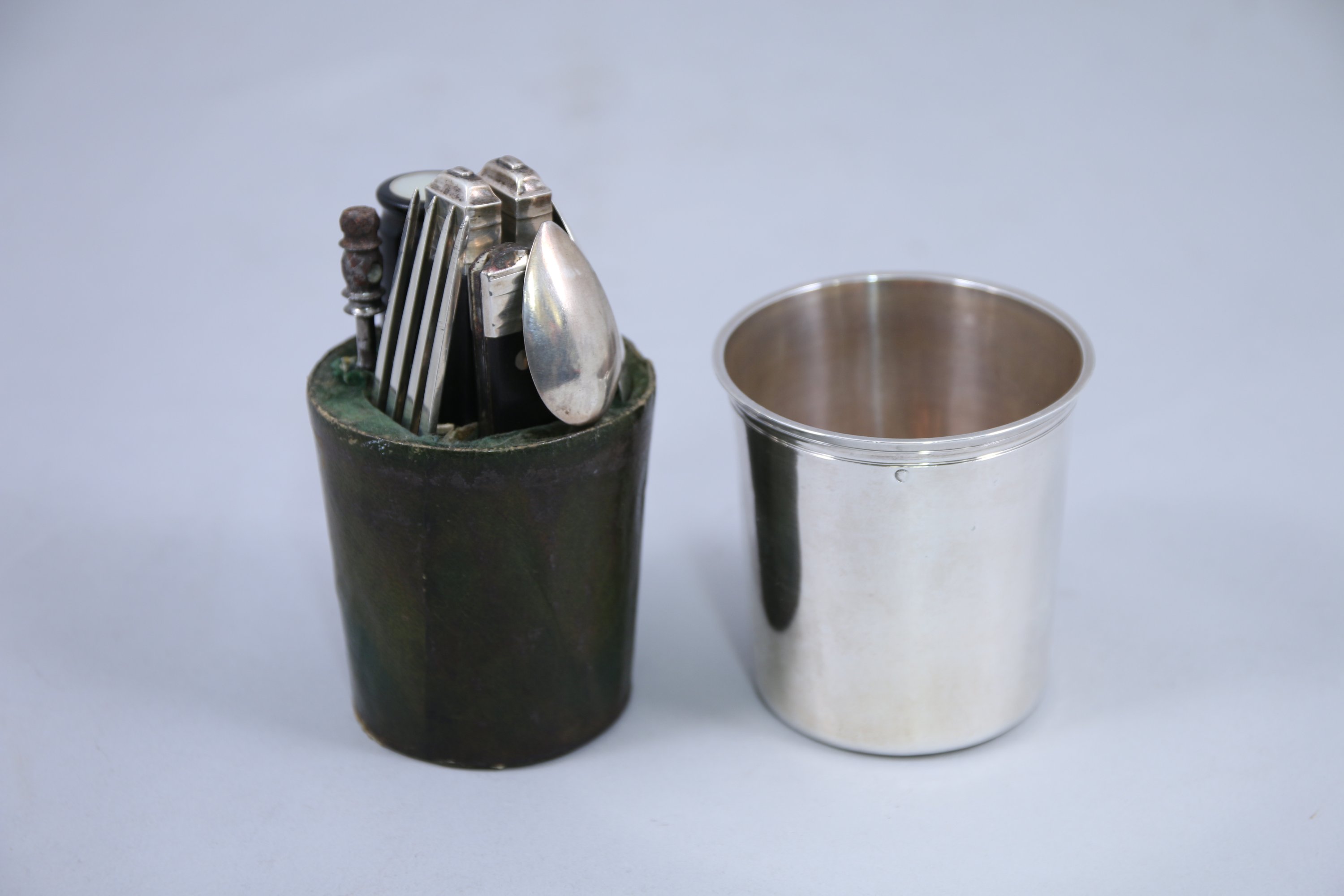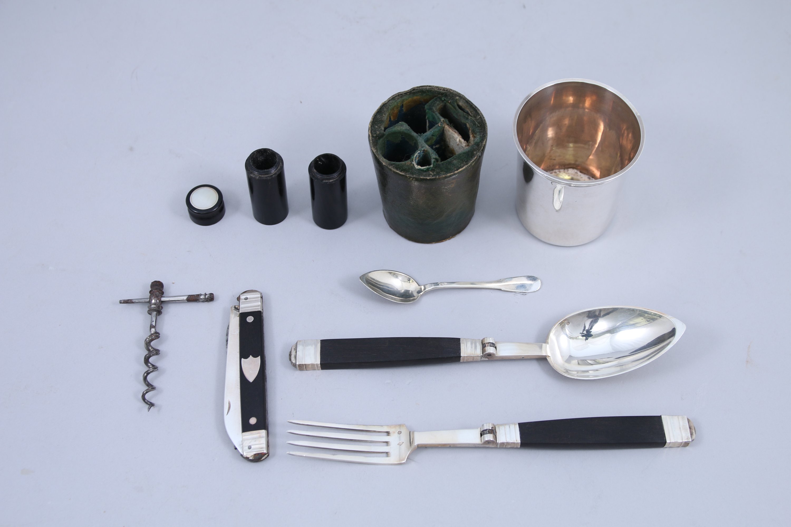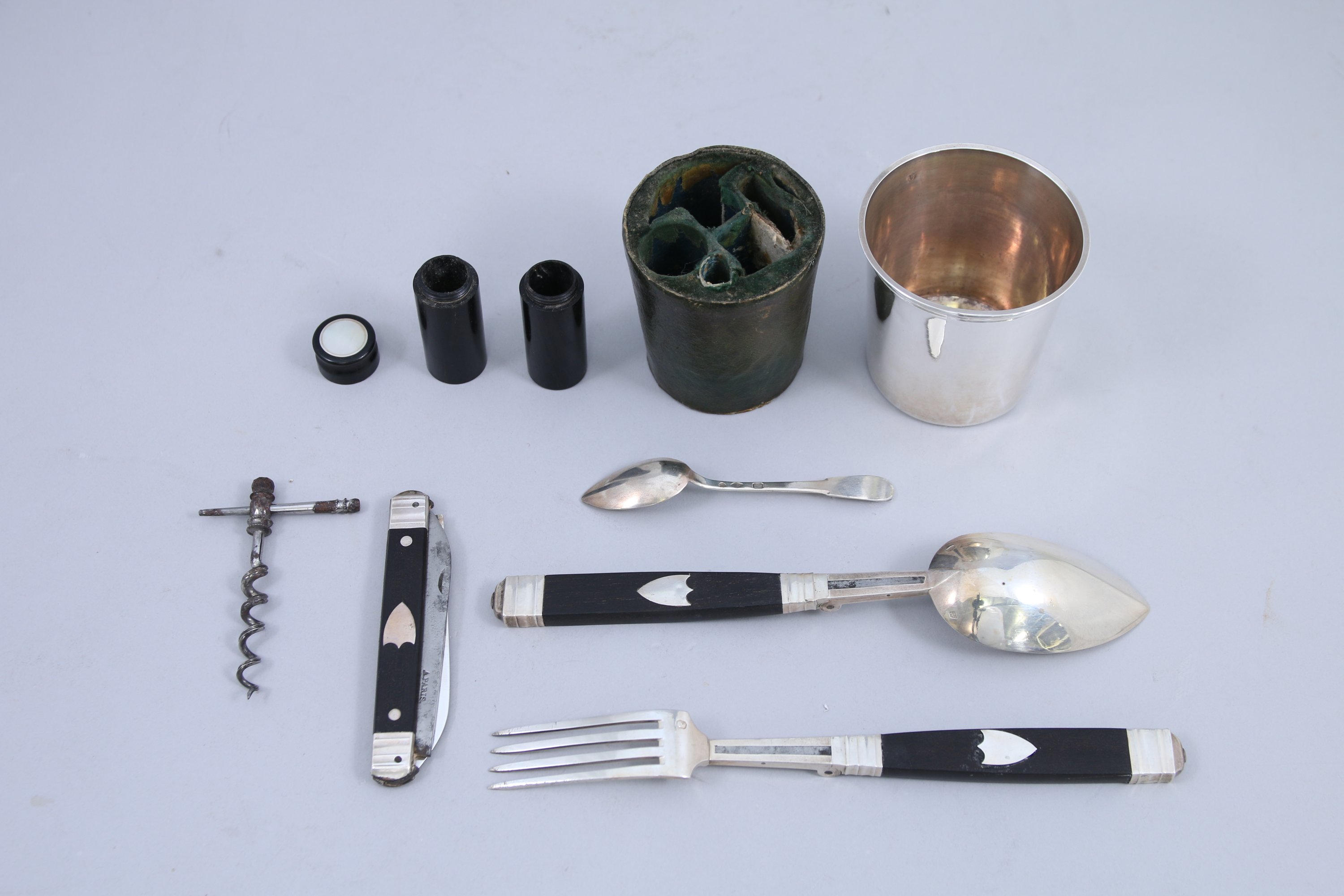 NÉCESSAIRE à PIQUE-NIQUE. En argent, ébène et métal. Il est composé d'un COUVERT pliable et d'un couteau à double lame, le manche en bois noirci, d'une petite CUILLER, d'un TIRE-BOUCHON, d'un CURE-DENTS, d'un ÉTUI SALIÈRE. Le tout dans un écrin gainé de cuir enchâssé dans une timbale.