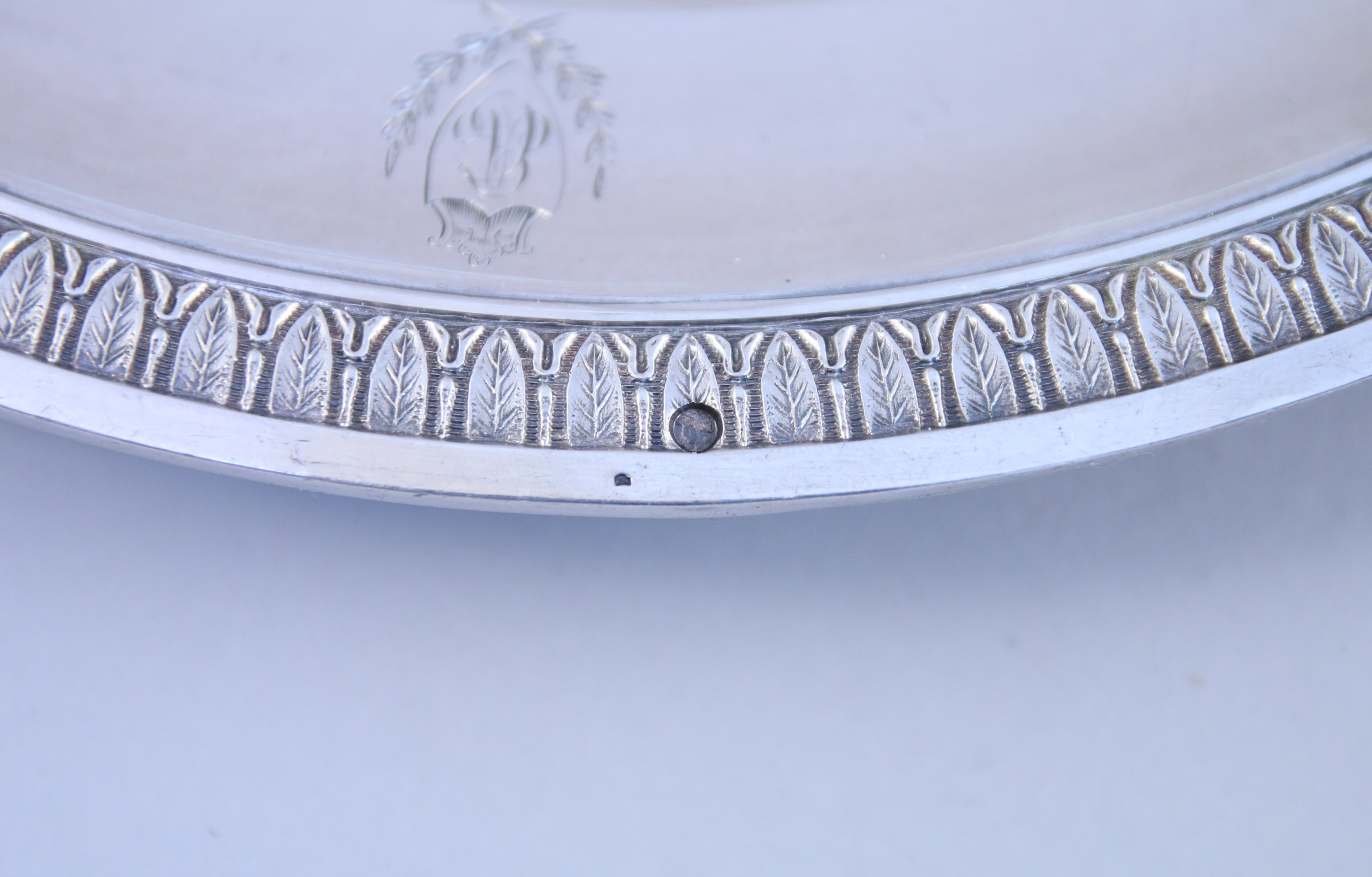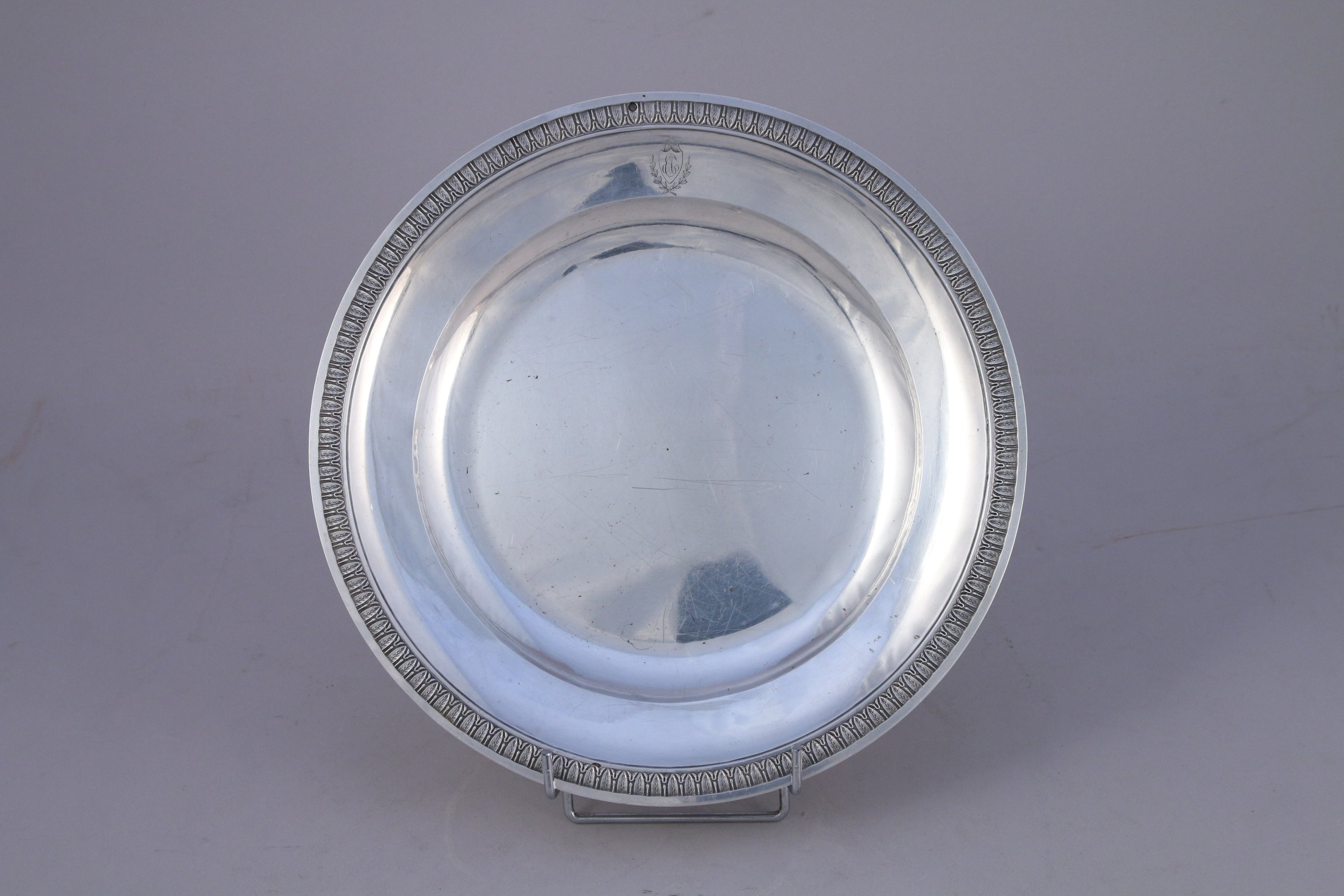 ASSIETTE circulaire en argent, la bordure à décor d'une frise de feuilles lancéolées. Gravé du monogramme "A T" dans un écusson entre deux rameaux.