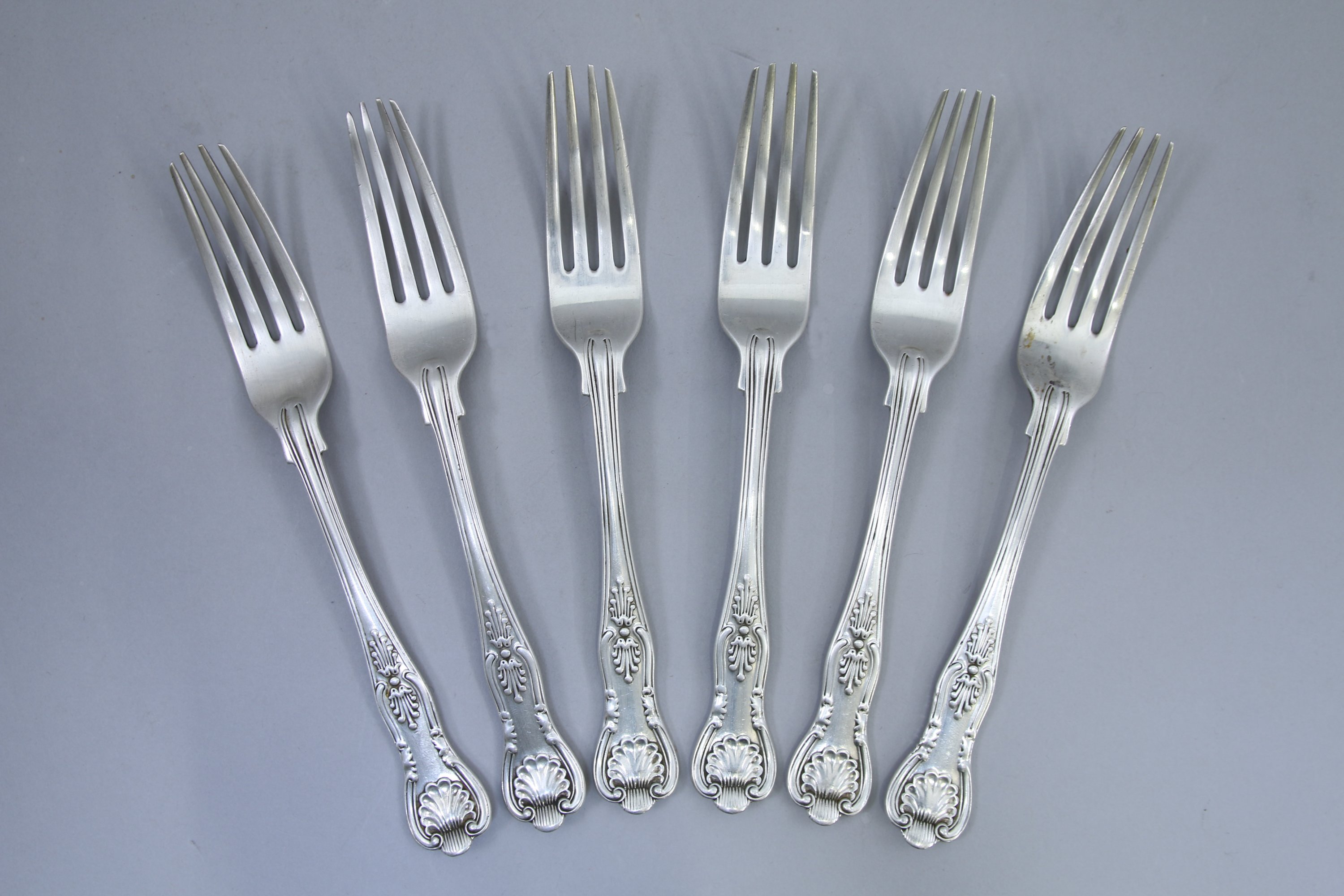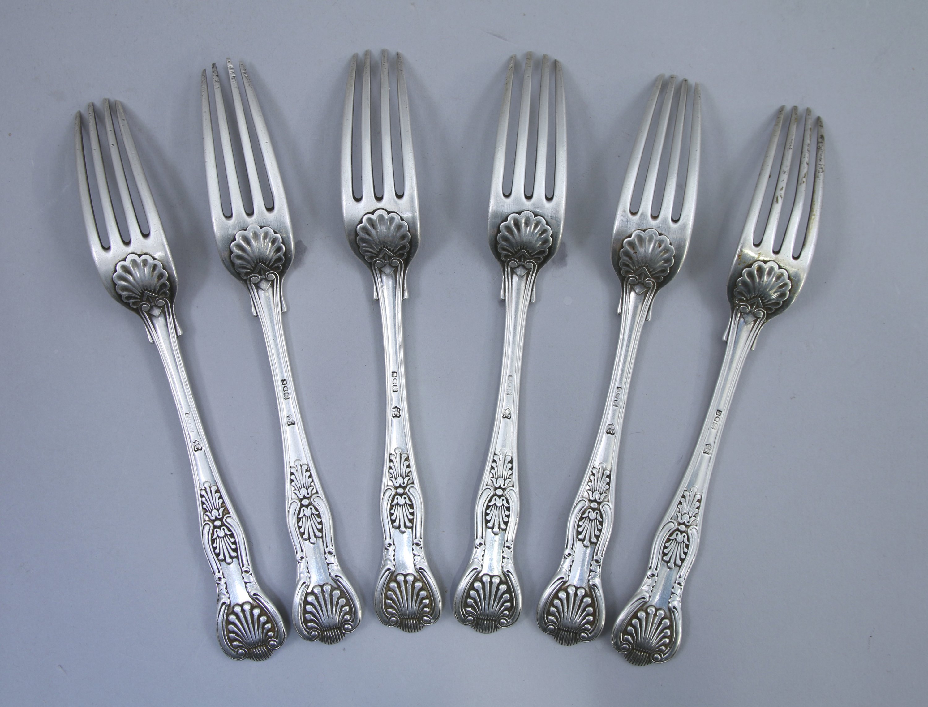 Six FOURCHETTES à DESSERT en argent. Modèle violoné finement gravé de motifs d'entrelacs et de coquilles.