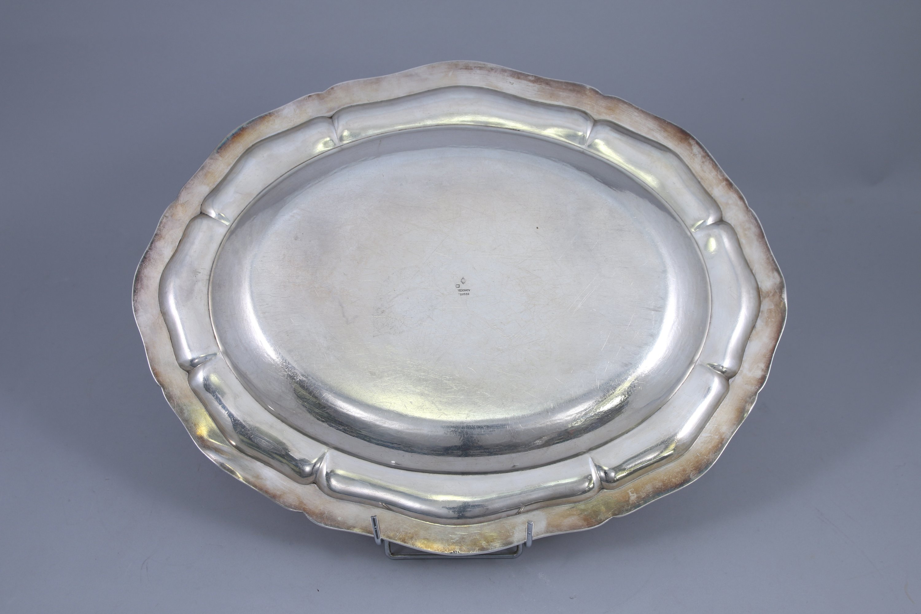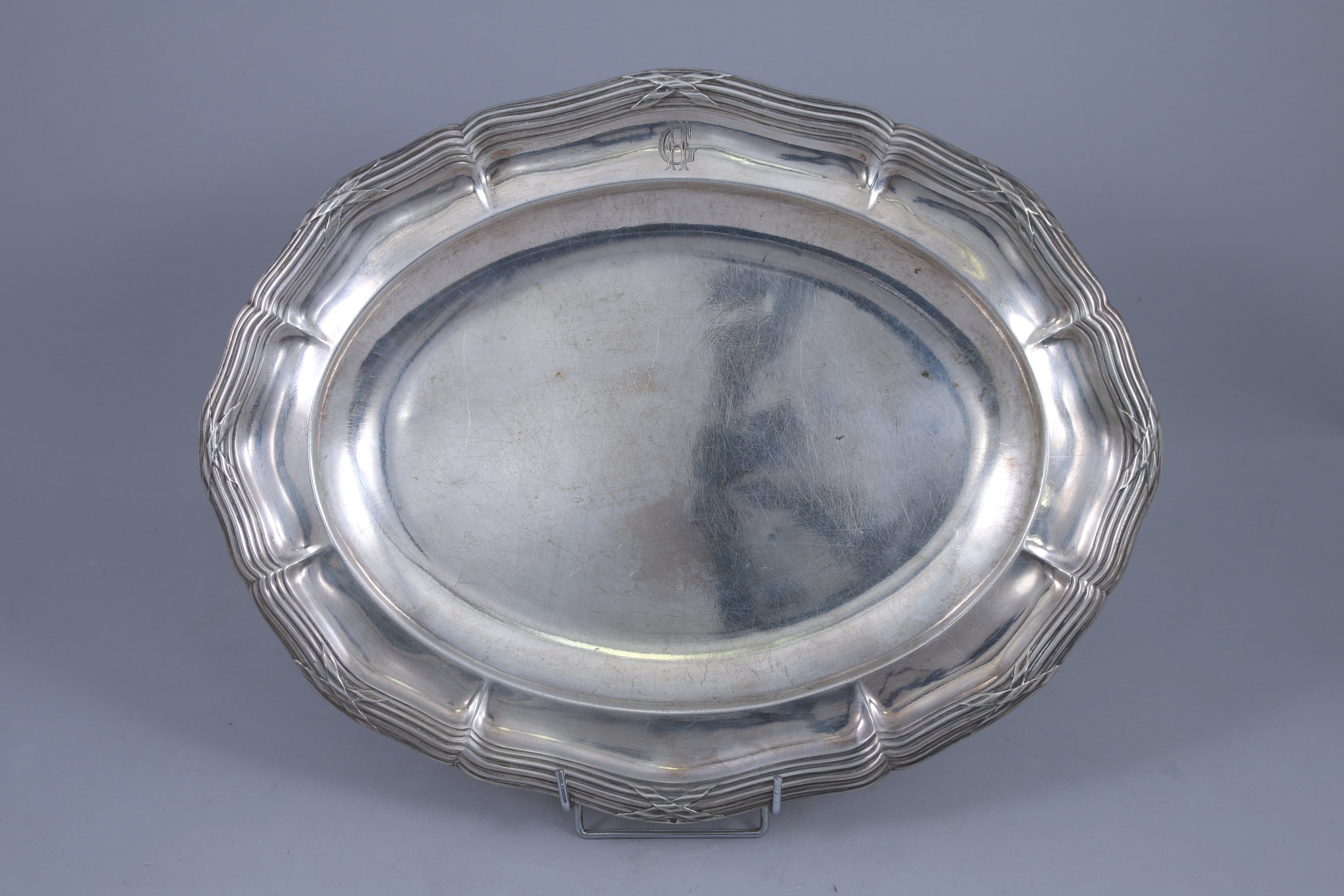 ODIOT. PLAT ovale en argent modèle à filets et croisillons. Orné d'initiales "C" et "R" entrelacées.