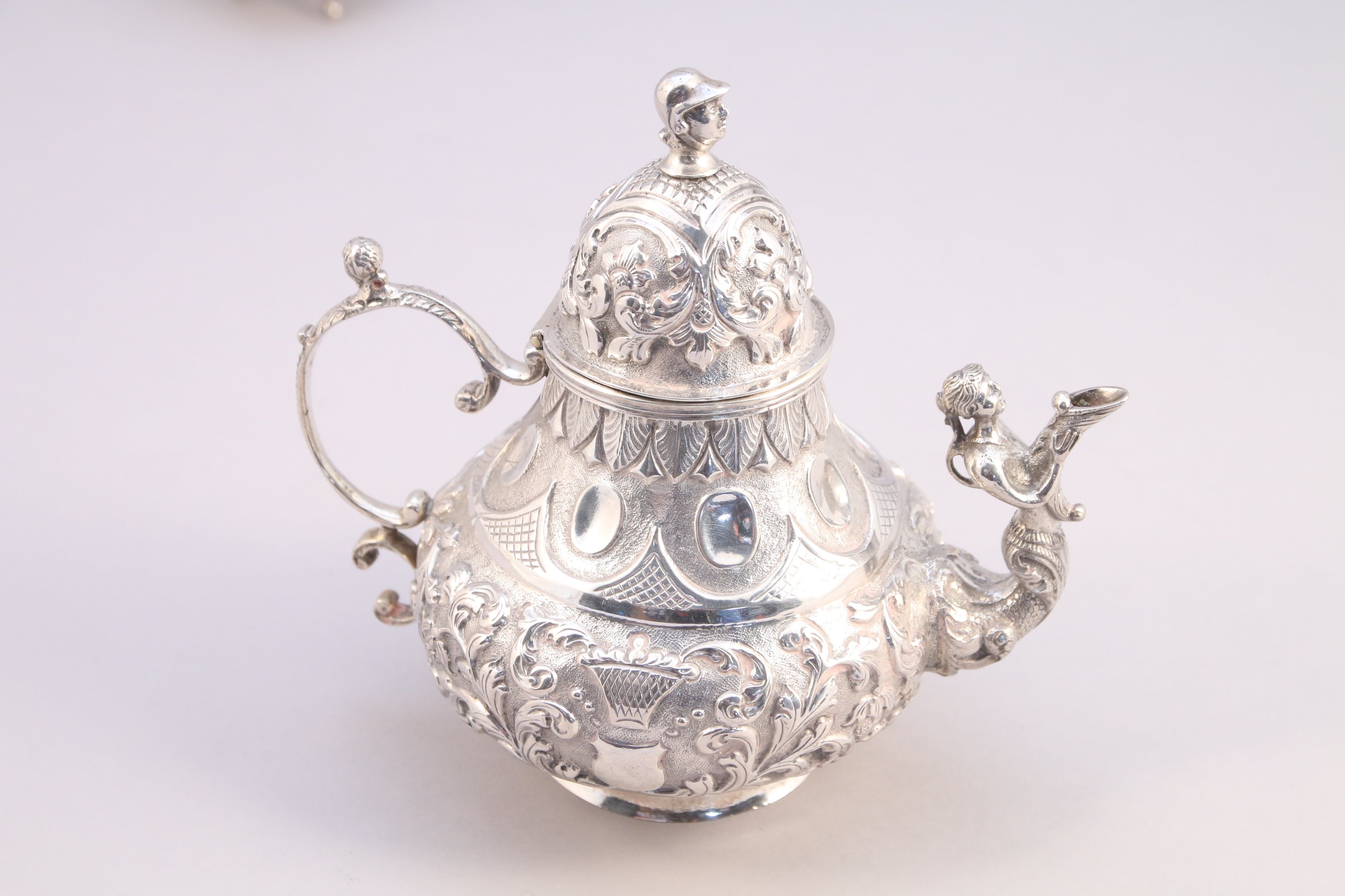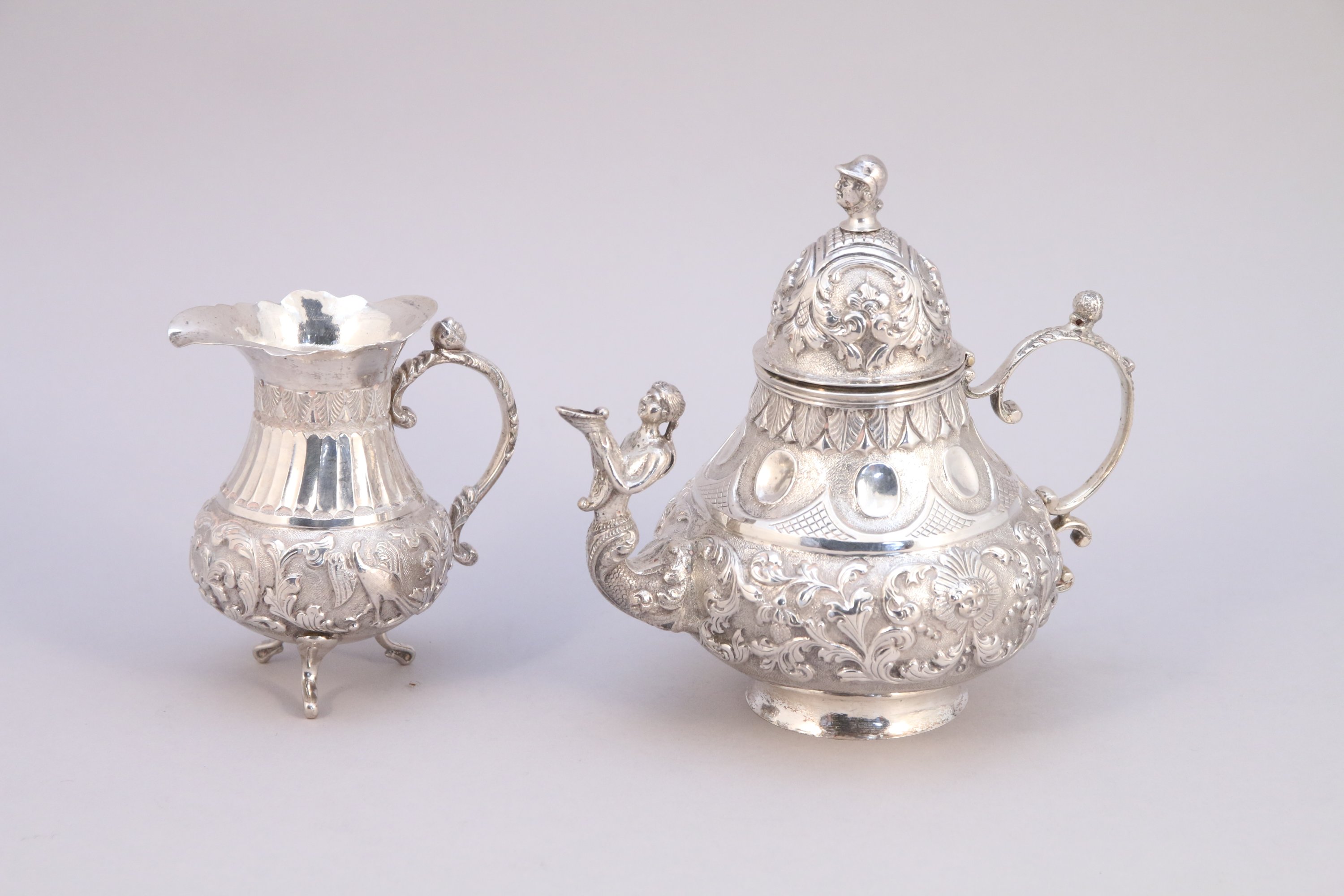 THÉIÈRE à panse surbaissée et un POT à LAIT en argent. Riche décor au repoussé de rinceaux, canaux feuillagés, figure féminine casquée en fretel. Buste féminin à la corne d'abondance en bec verseur. Le pot à lait reposant sur un piétement tripode.