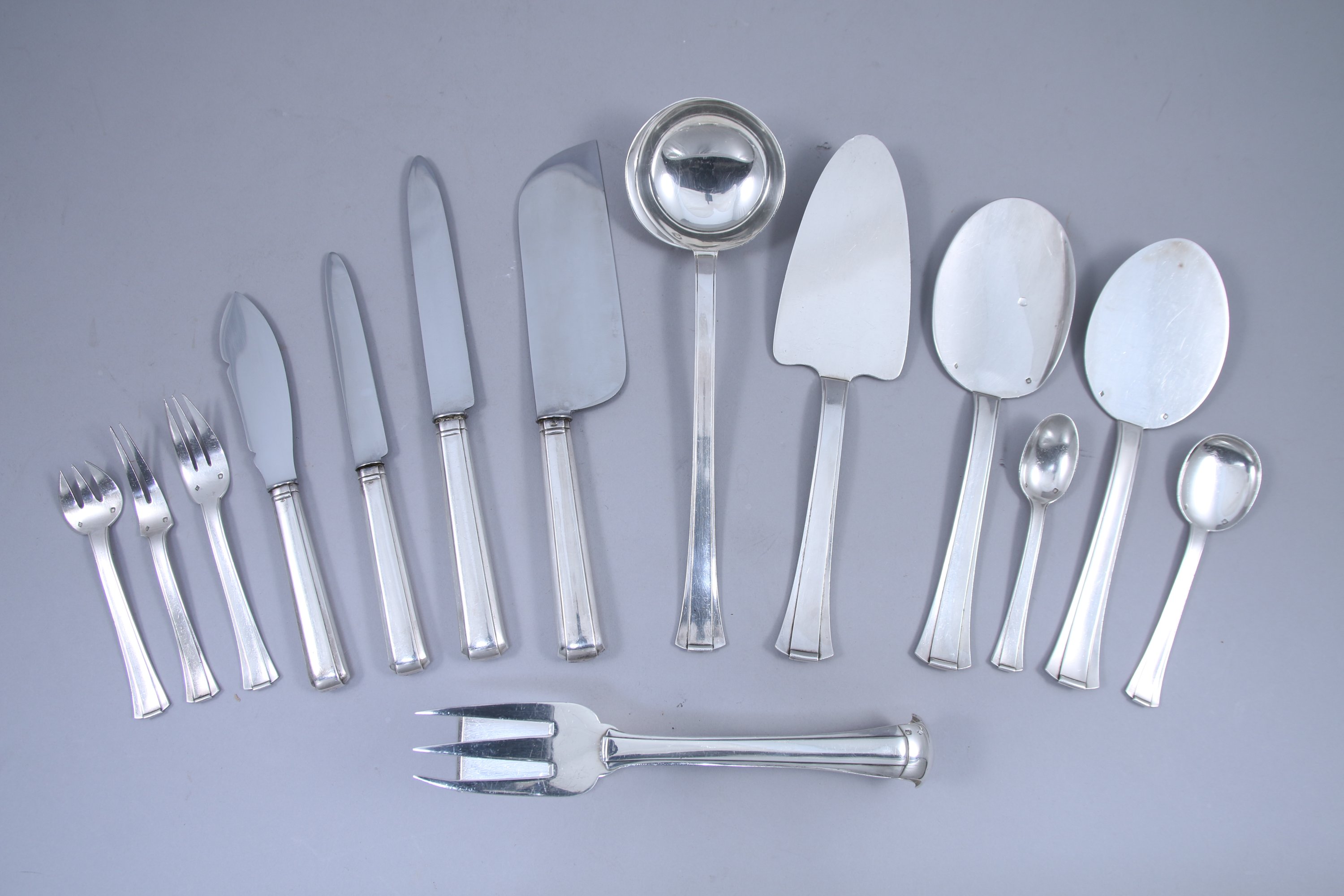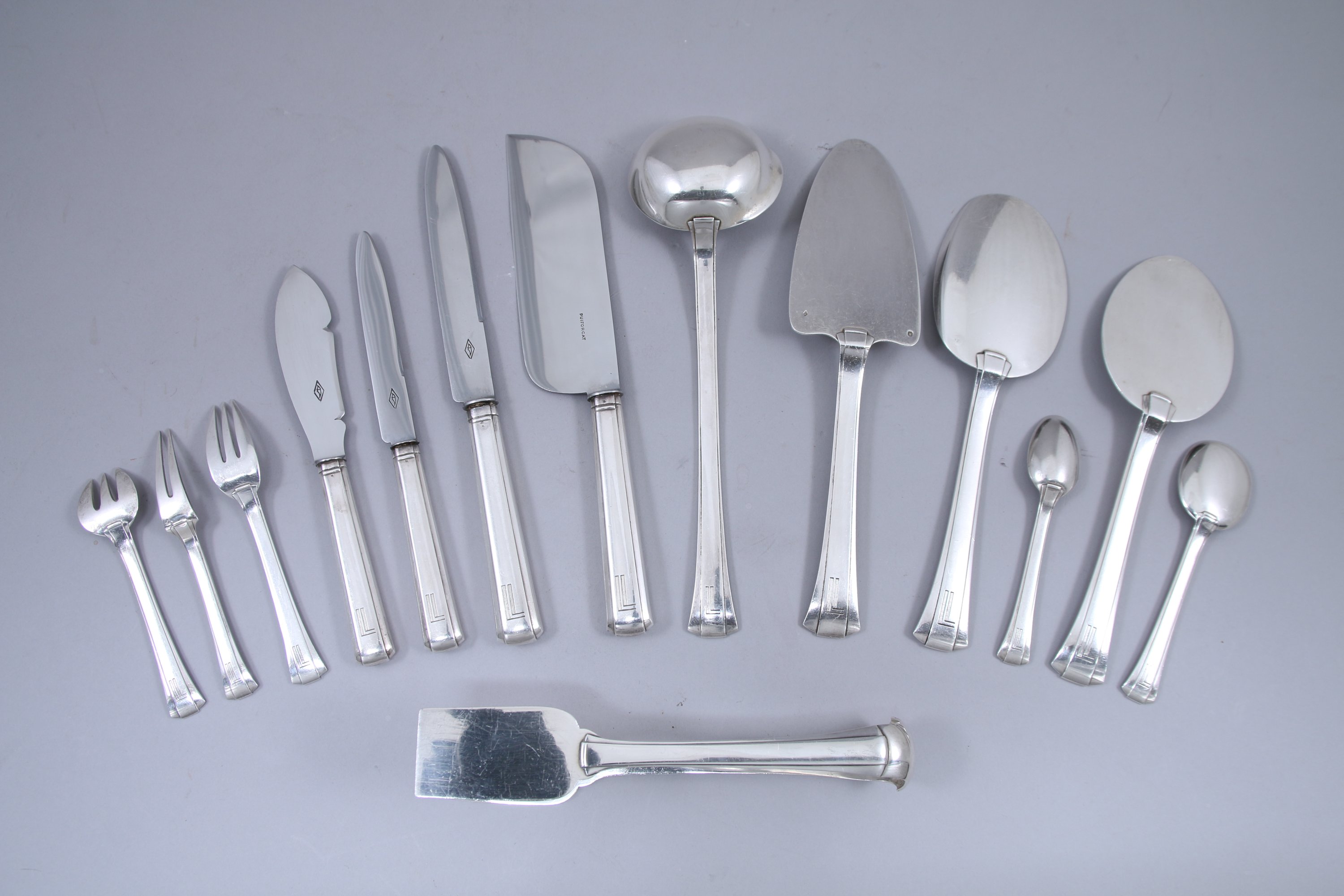 En argent 65 pièces. Comprenant: 7 COUVERTS de TABLE, 7 COUVERTS à DESSERT, 6 FOURCHETTES à GÂTEAUX, 6 FOURCHETTES à HUÎTRES, 6 FOURCHETTES à ESCARGOT, 6 PELLES à GLACE, 8 CUILLERS à CAFÉ, 1 LOUCHE, 1 PELLE à TARTE, 2 PELLES à SERVIR, 1 PINCE à SERVIR.