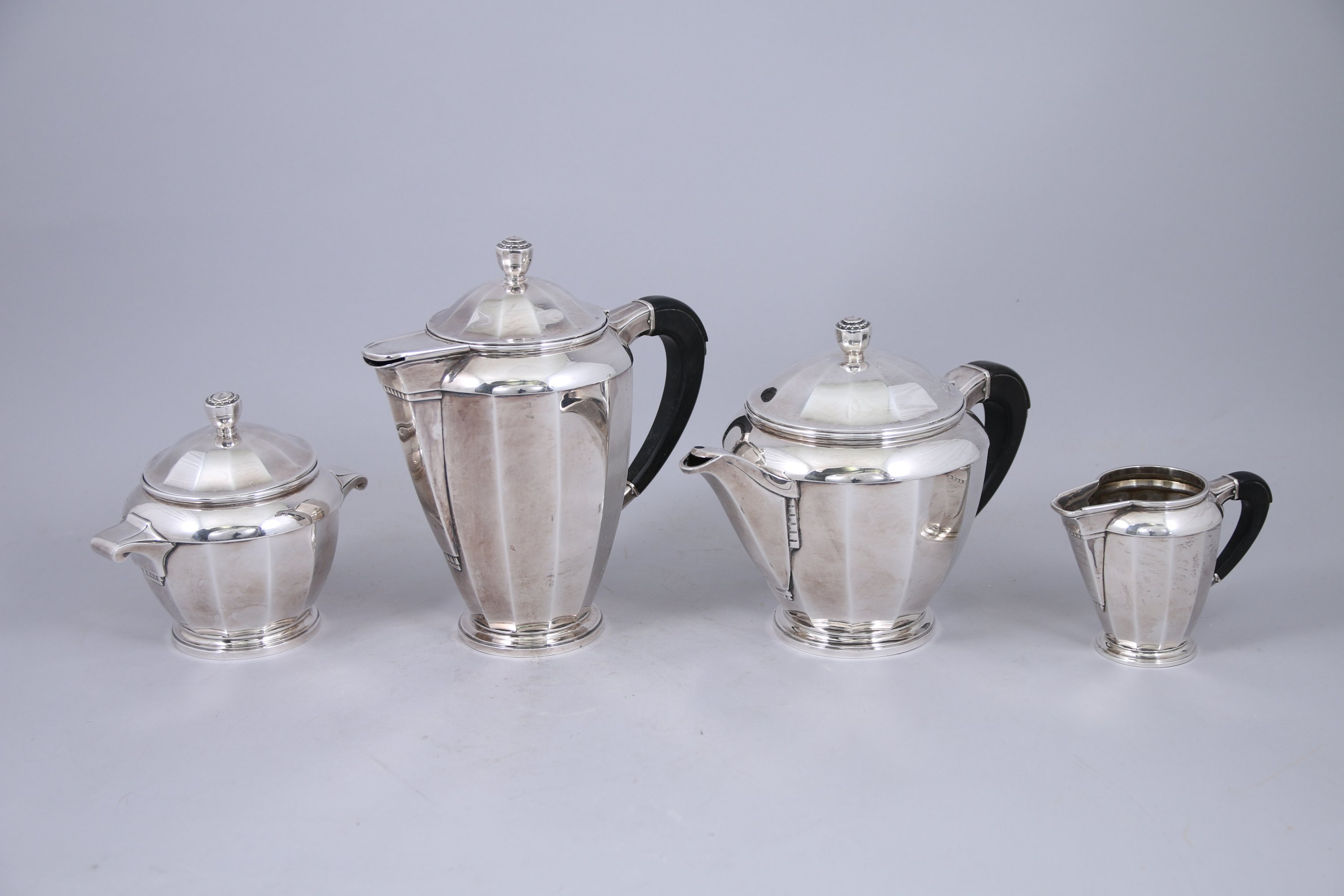 SERVICE à THÉ et CAFÉ ART DÉCO en argent cinq pièces comprenant un PLATEAU à ANSES, un POT à LAIT, une CAFETIÈRE, une THÉIÈRE et un SUCRIER couvert. Anse en bois exotique, ébène? Modèle à pans coupés.