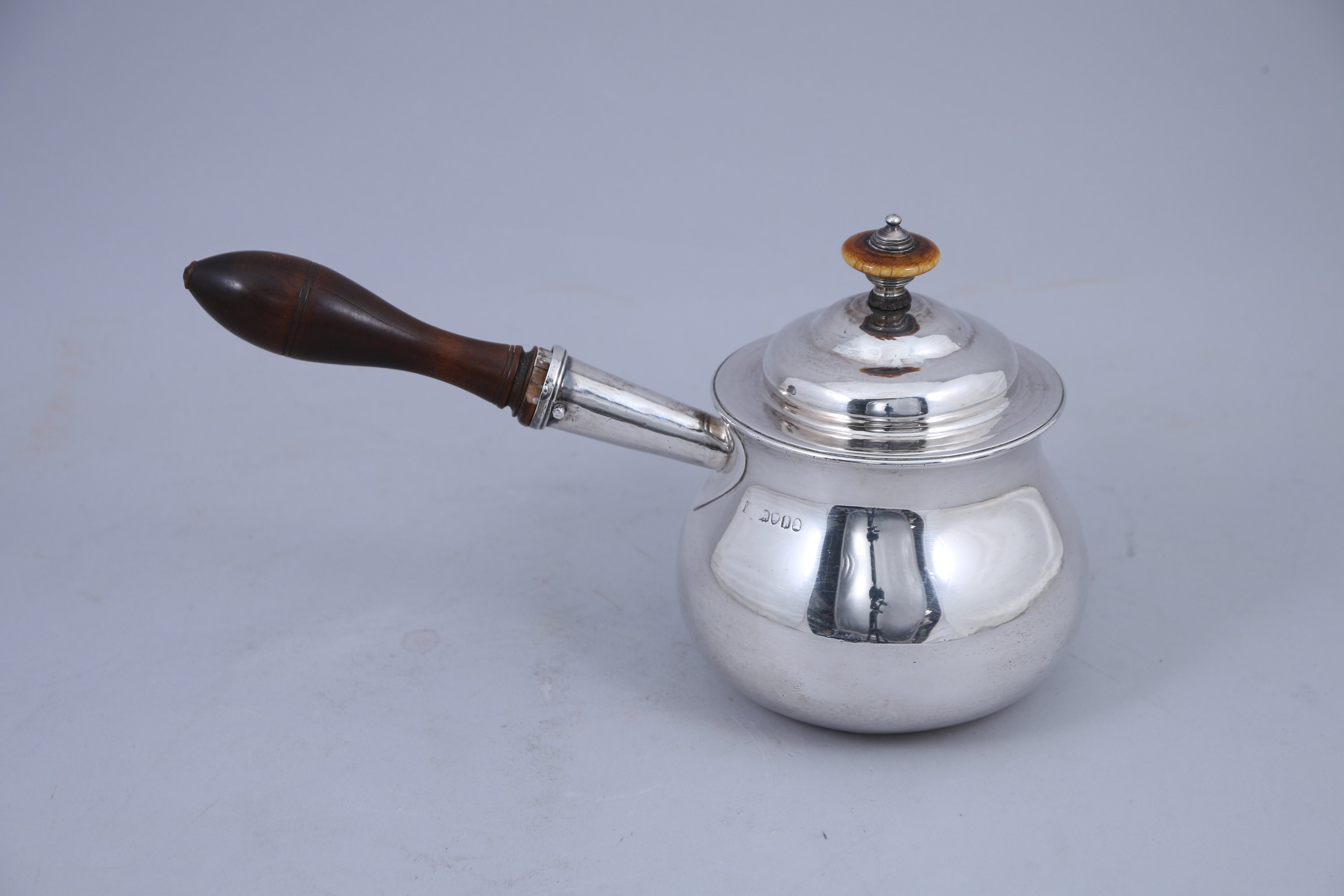 CASSEROLE à BEC et COUVERCLE en argent uni. La poignée et le bouton en bois.