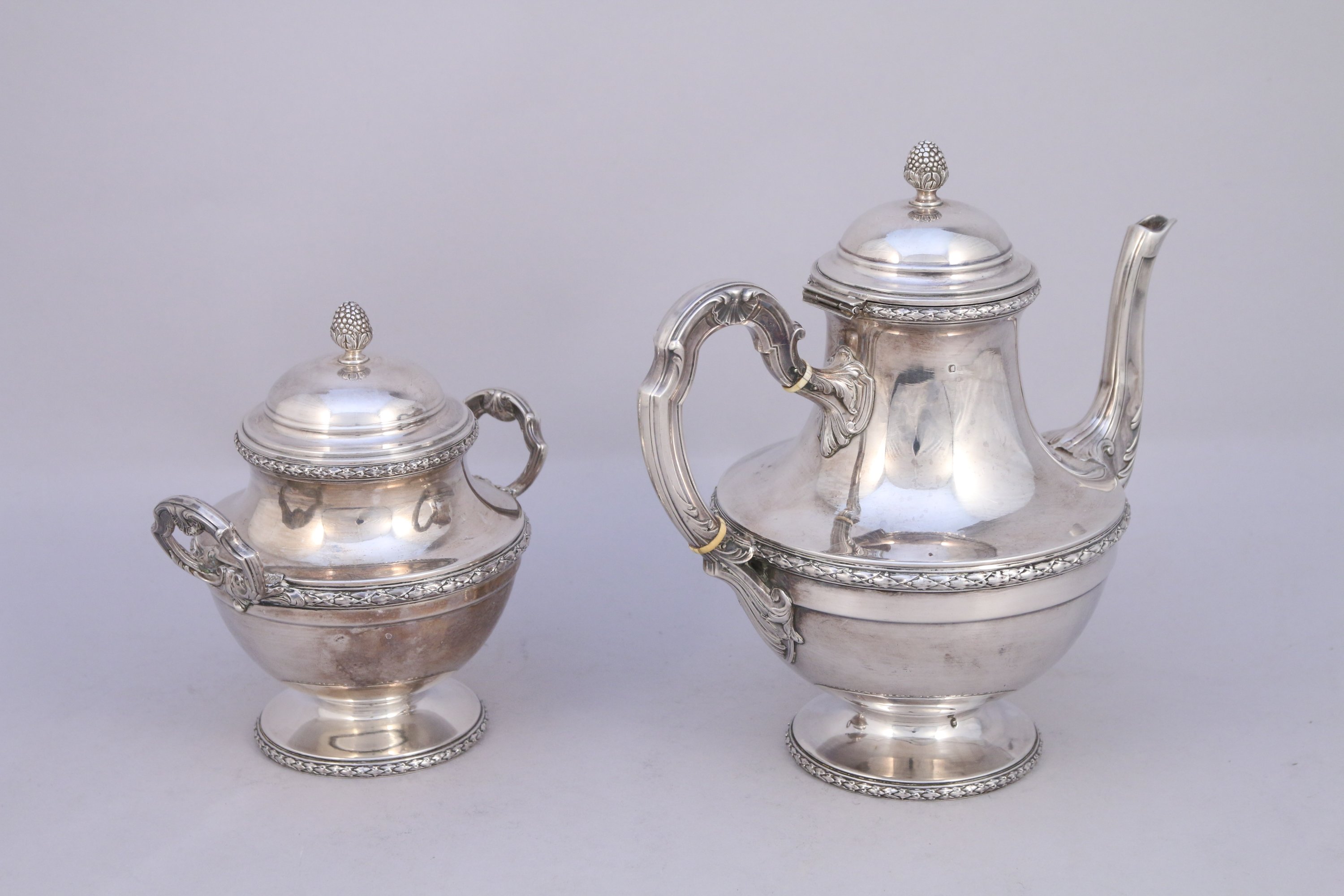 THÉIÈRE et SUCRIER en argent de forme renflée à décor sur le pourtour de frises de tors de lauriers, l'anse de la théière agrémentée de coquilles stylisées et bagues d'ivoire, couvercle surmonté d'un fretel figurant une graine. Intérieur du sucrier vermeillé.