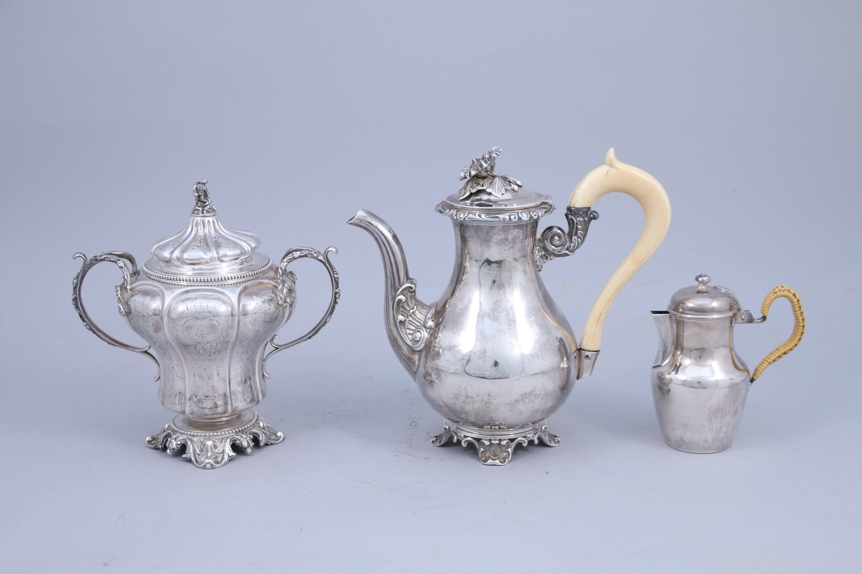 - POT à LAIT ou CAFETIÈRE ÉGOÏSTE. L'anse treillée. Poinçon Minerve. Orfèvre "J.PIN...LT.?"Poids brut 170 g.