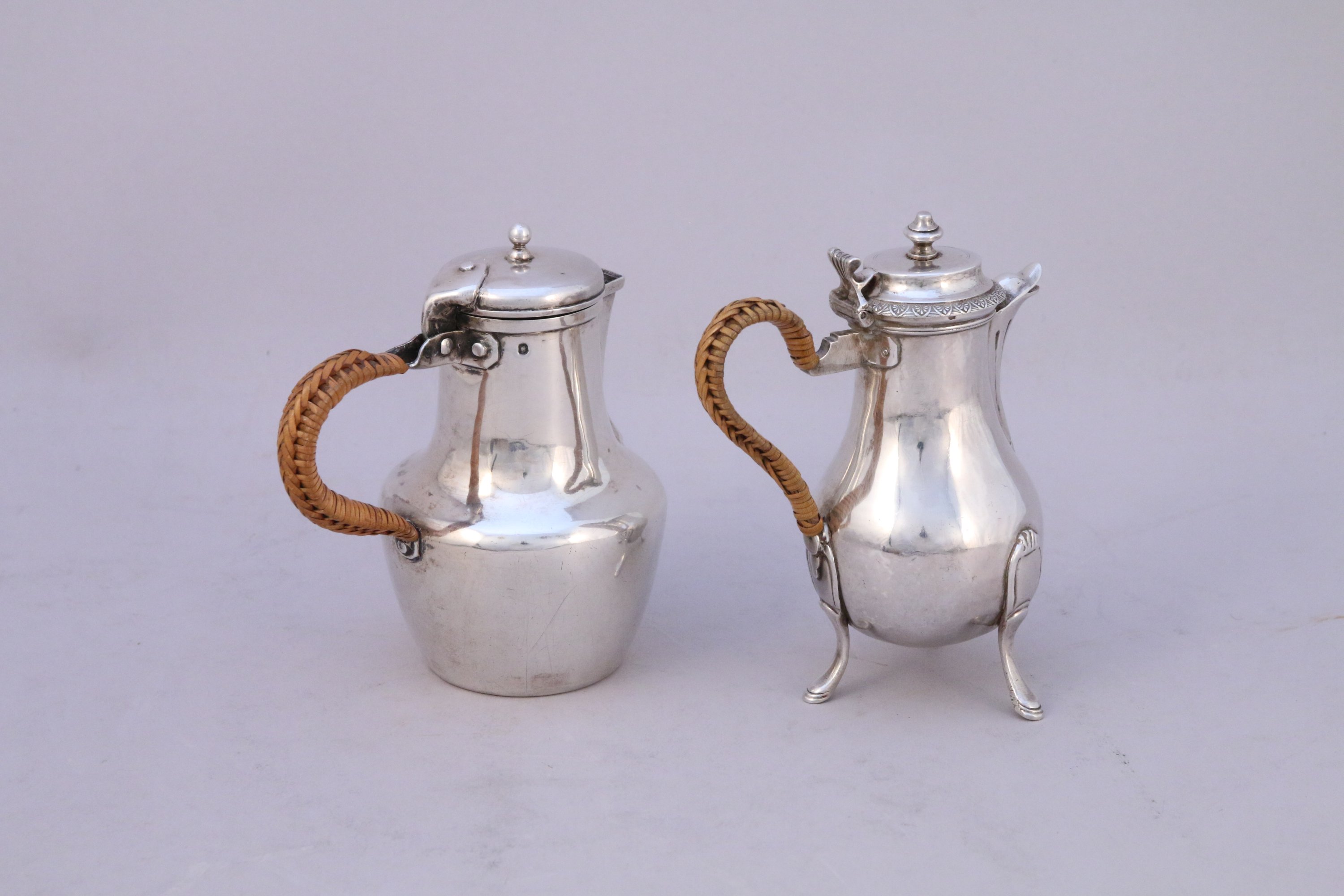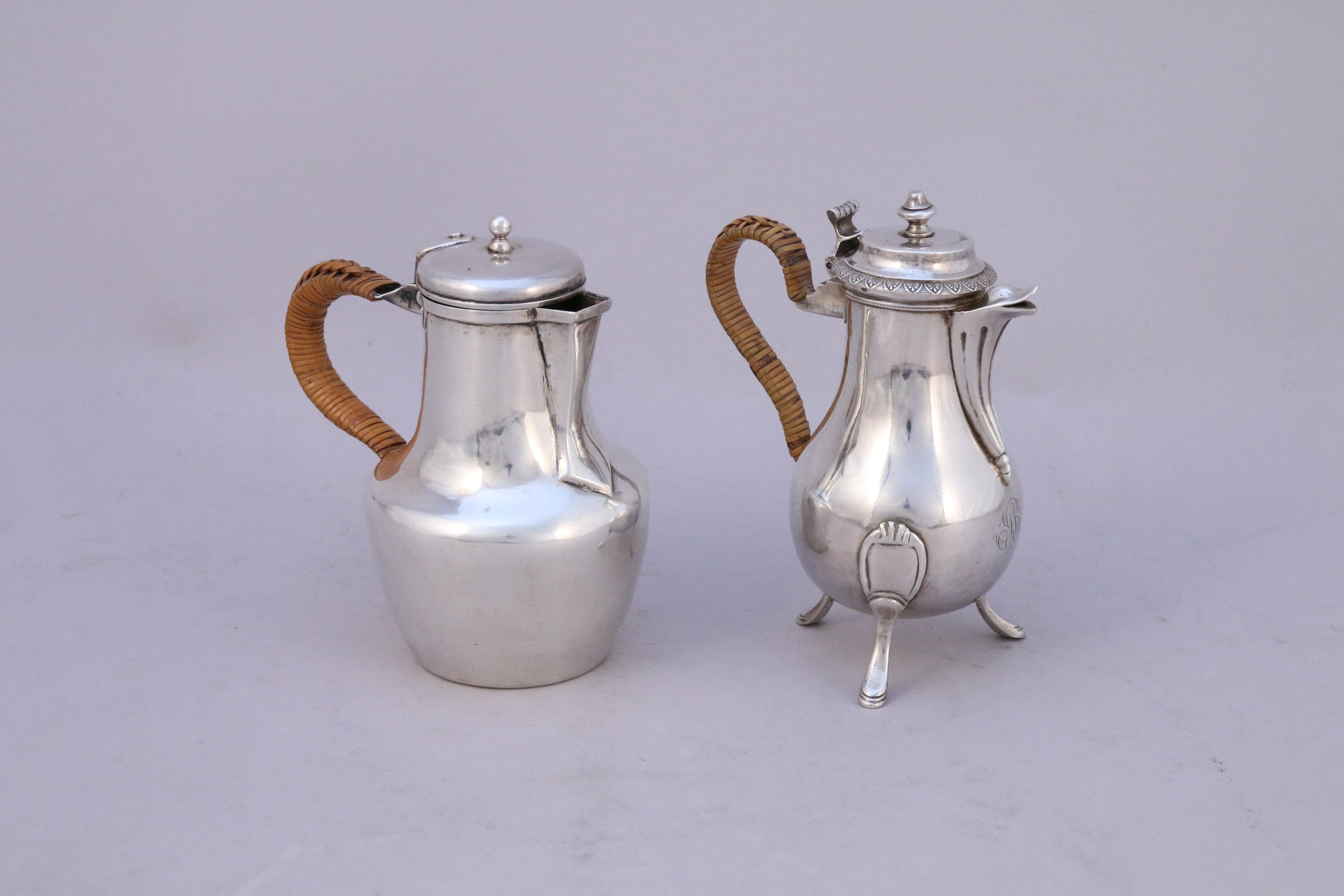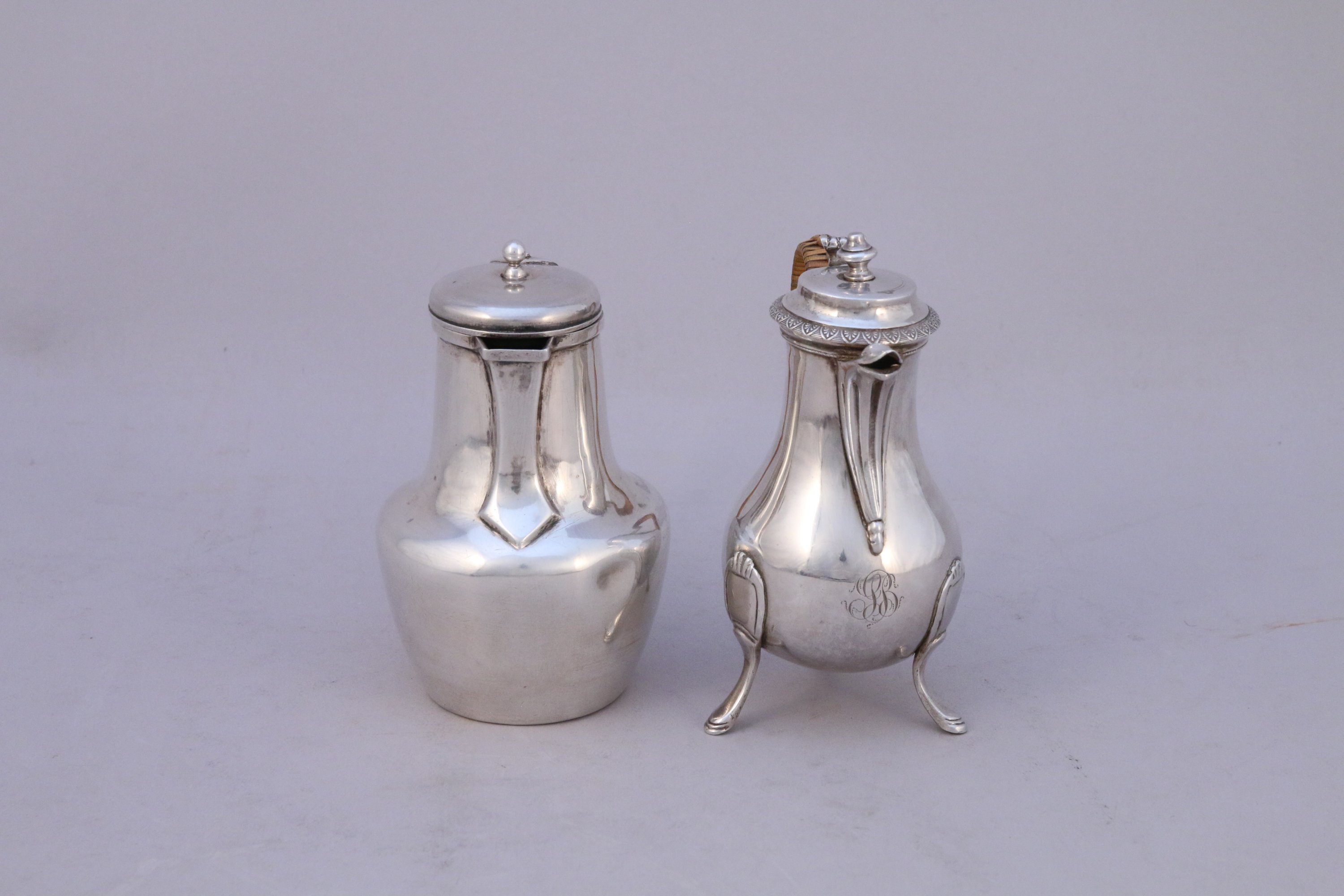 le couvercle à décor gravé d'une frise de palmettes surmonté d'un fretel en forme de toupie. Anse clissée. Poinçon Paris, Premier Coq 950 millième. Orfèvre: Antoine Henry Dubois. Haut. 13 cm. Poids 120 g.