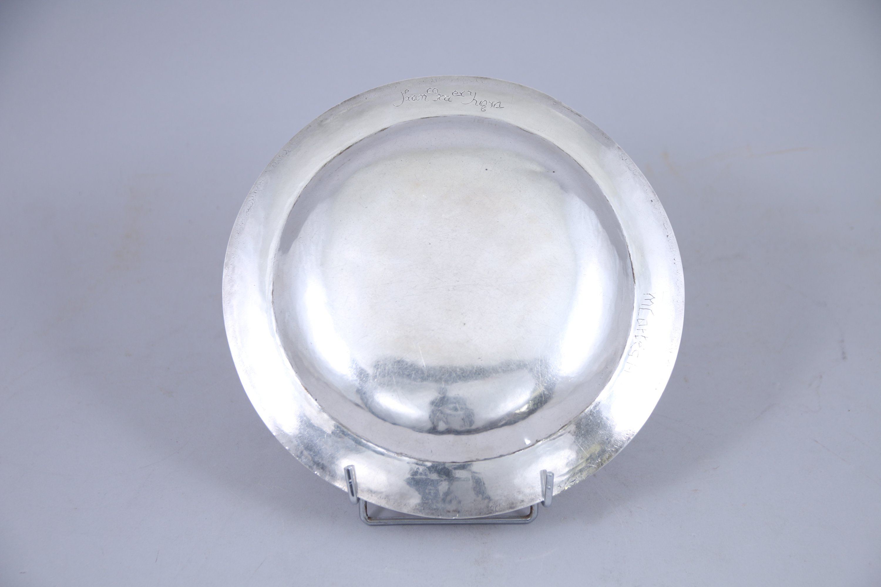 - PLAT CREUX circulaire en argent bas titre martelé. A charge de contrôle. ravé "A dela G de Süemen". Diam. 22 cm. Poids 405 g.