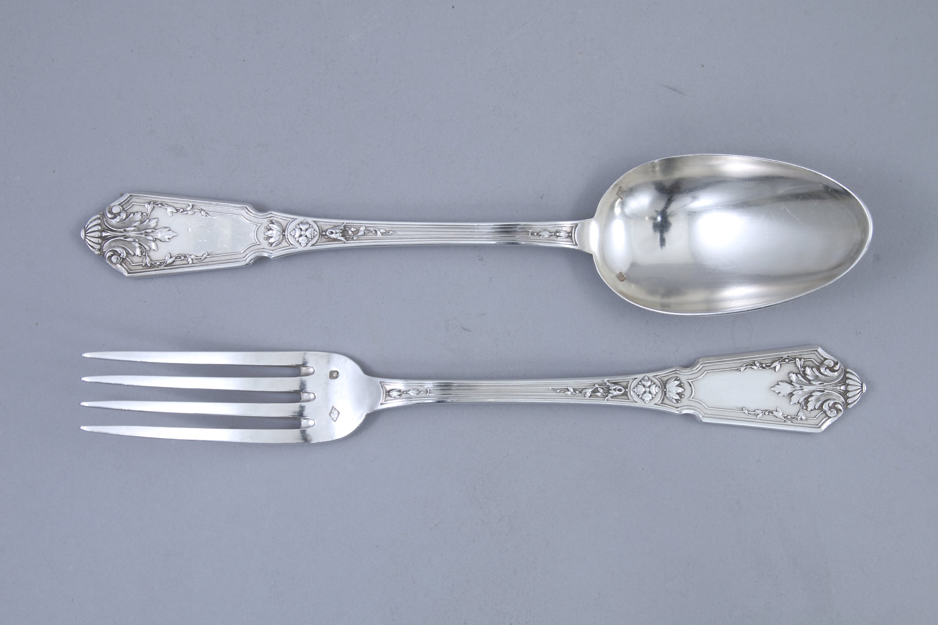 Douze COUVERTS en argent. Modèle richement gravé de rinceaux et coquilles.