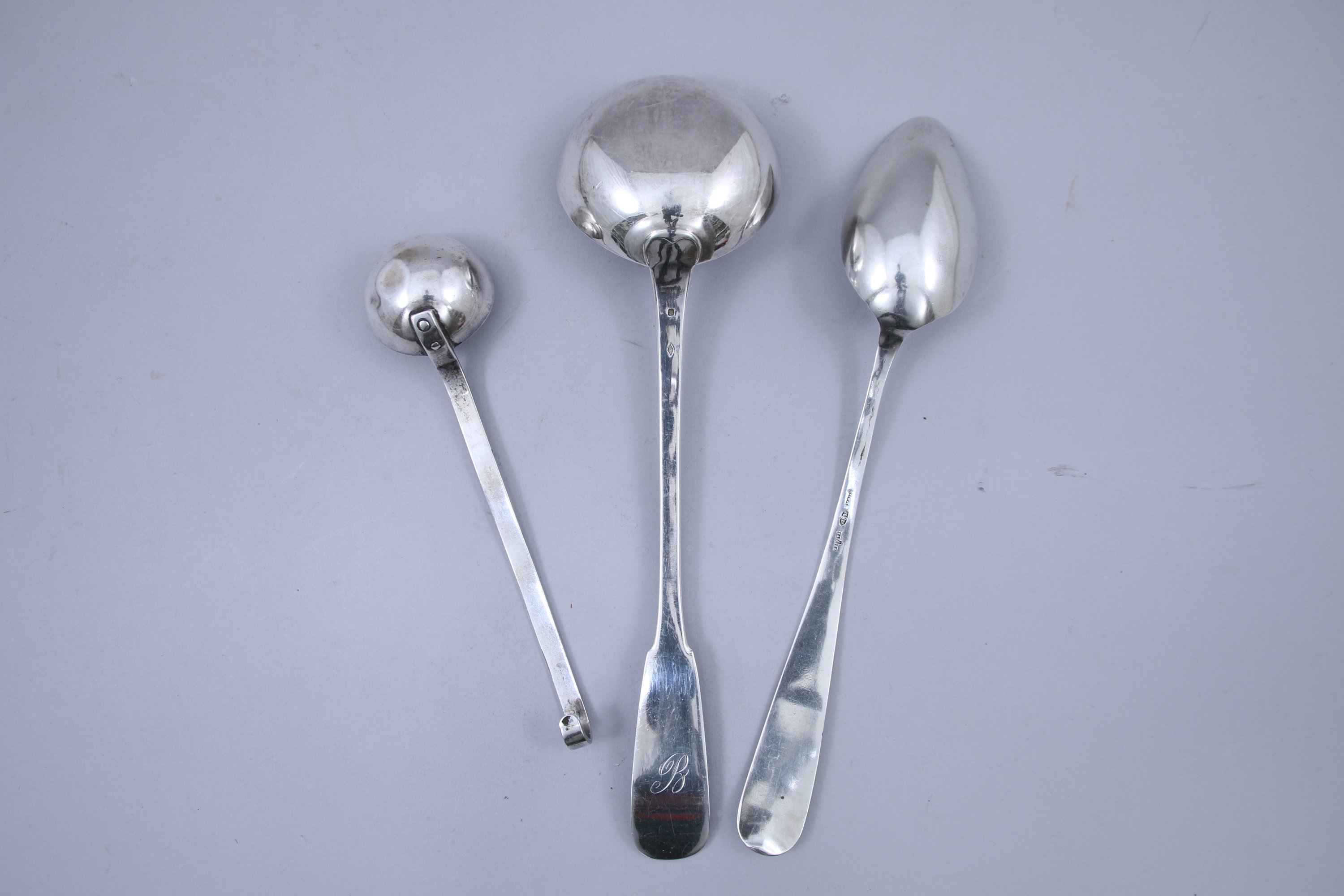 - Une LOUCHE en argent modèle uniplat, gravée d'un "B". Poinçon Vieillard (1819-1838), orfèvre E. Mattreau. Poids 210 g.