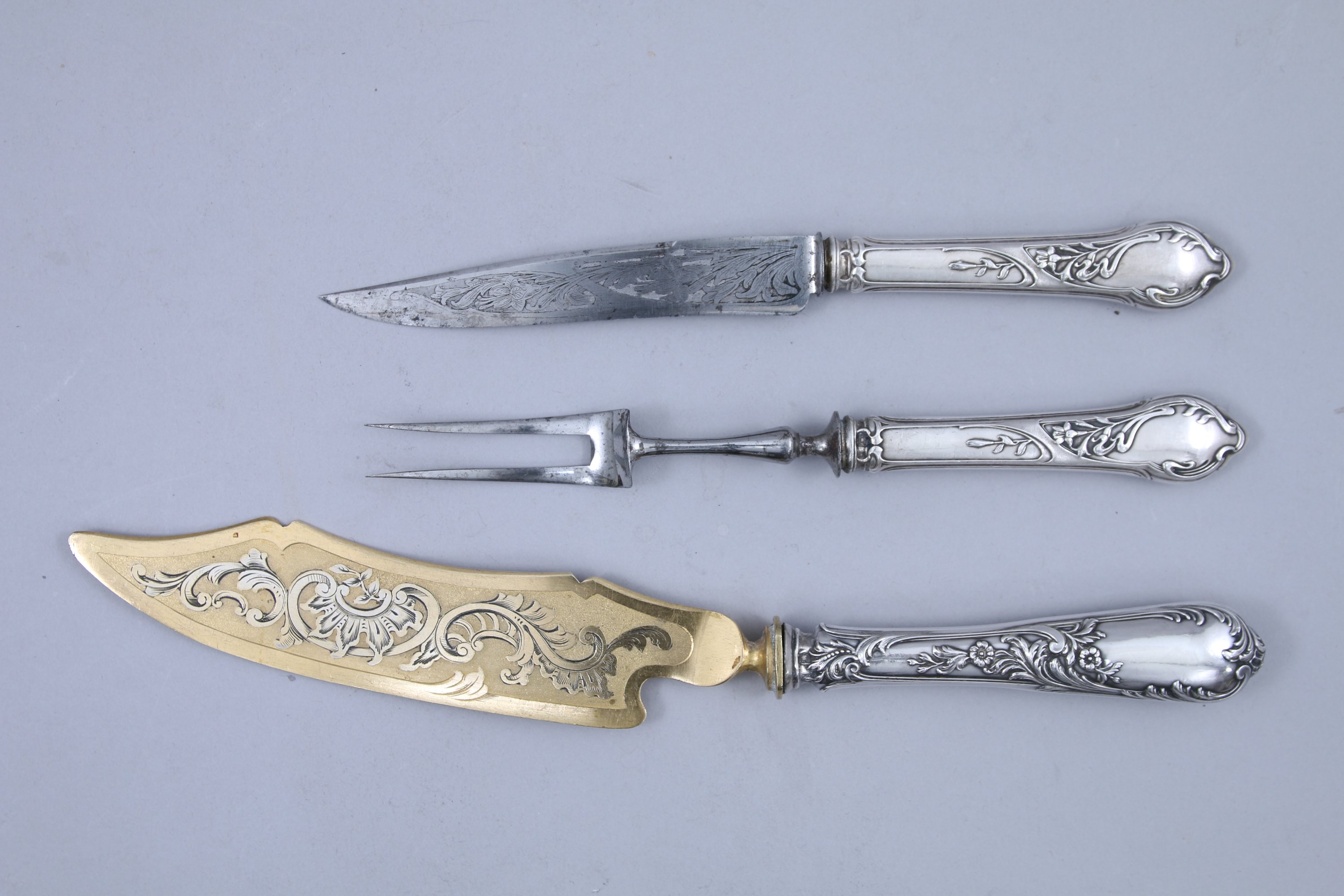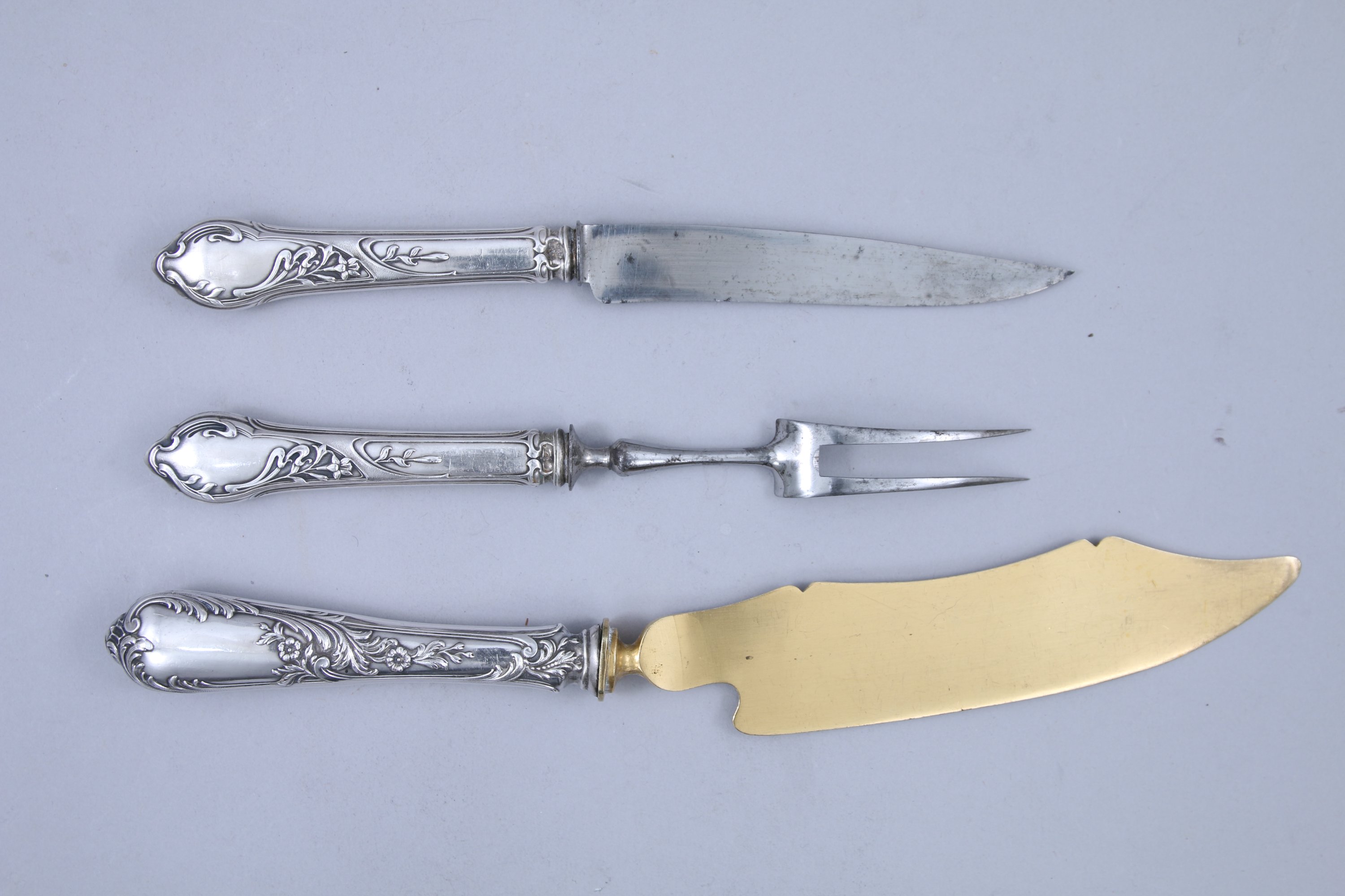 JOINTS: Une FOURCHE, un COUTEAU et une PELLE de SERVICE en argent fourré et lames en métal. A décor de motifs feuillagés. Poids brut 210 g.