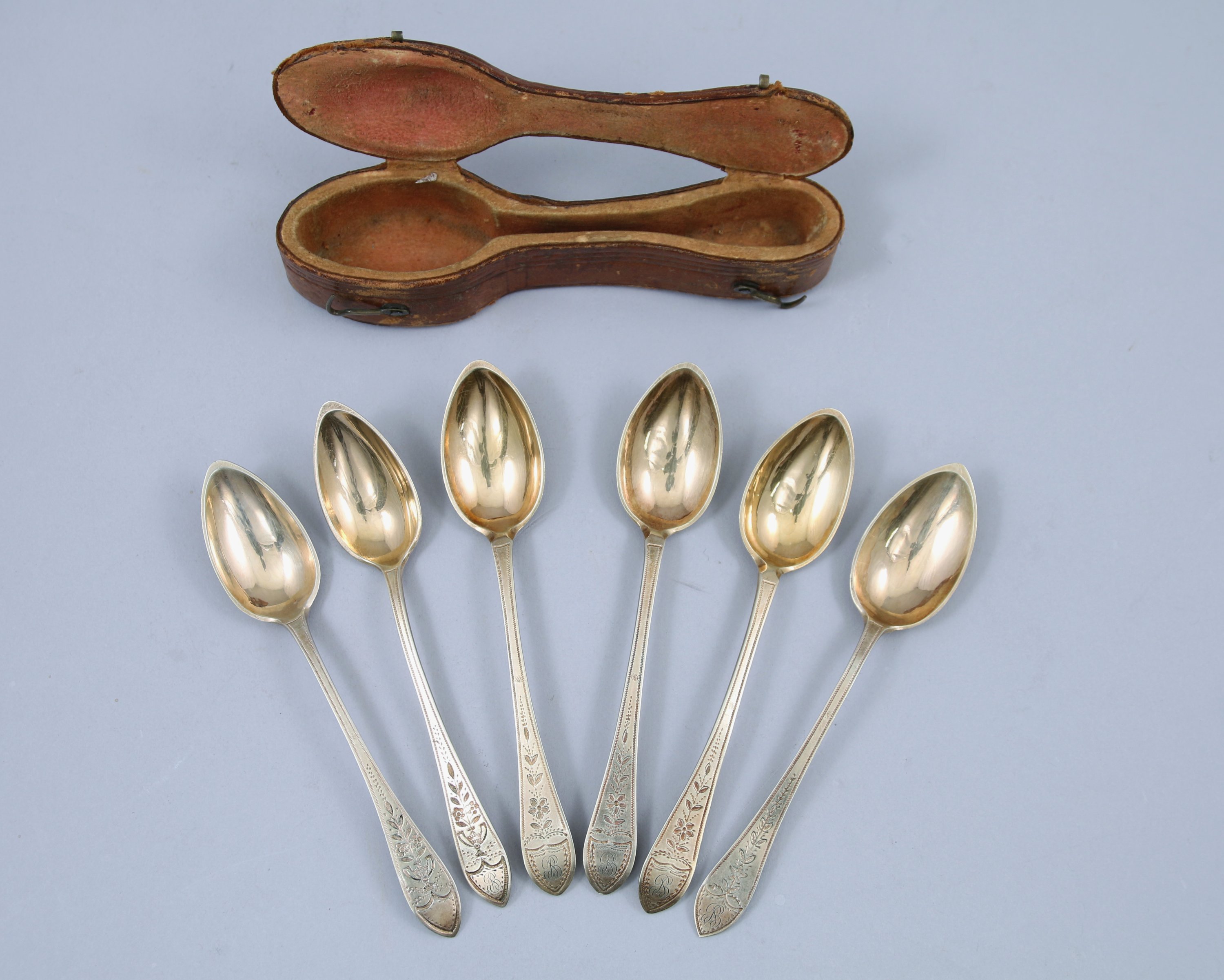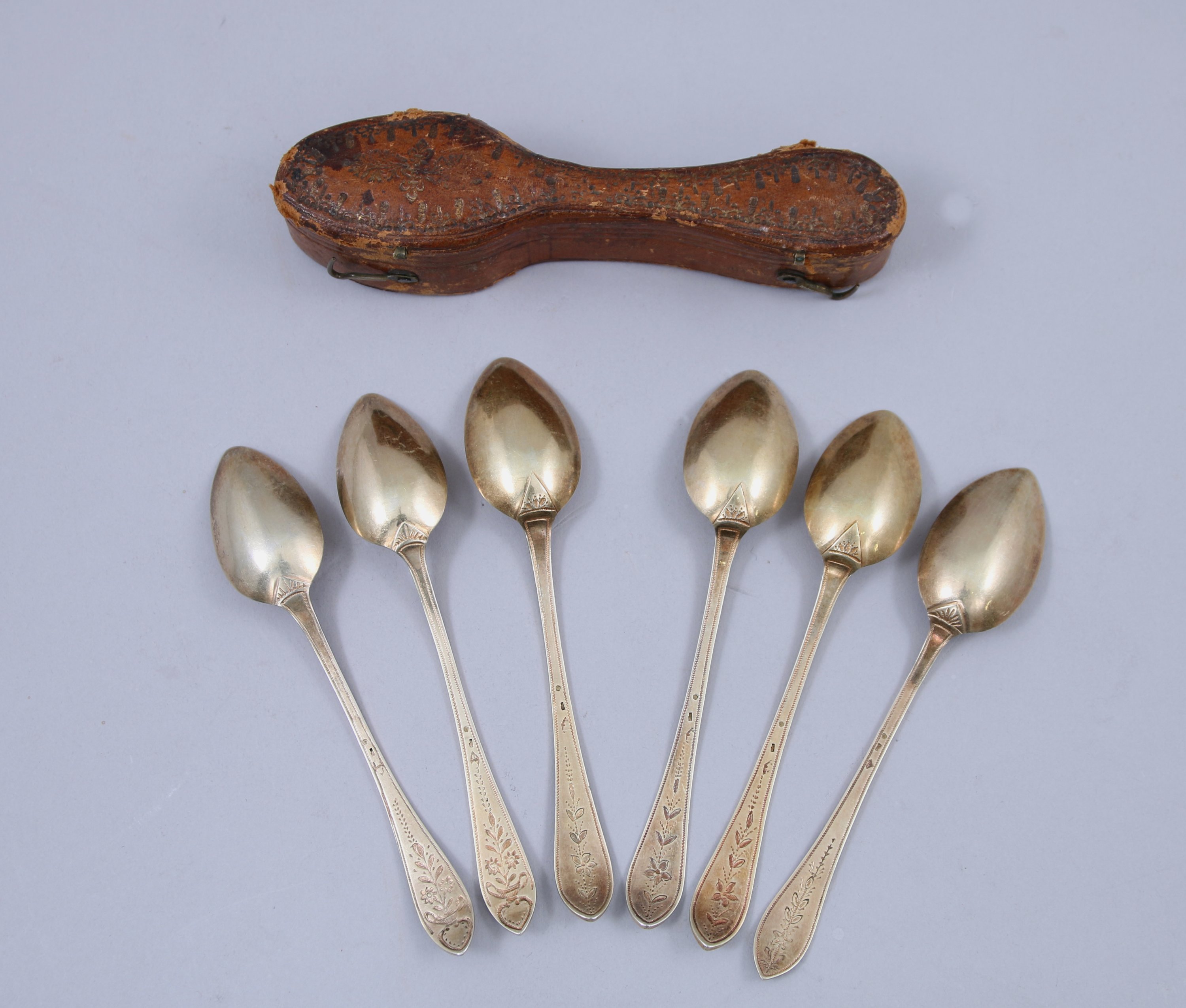 Six CUILLERS à café en vermeil, modèle gravé de fleurs épanouies.