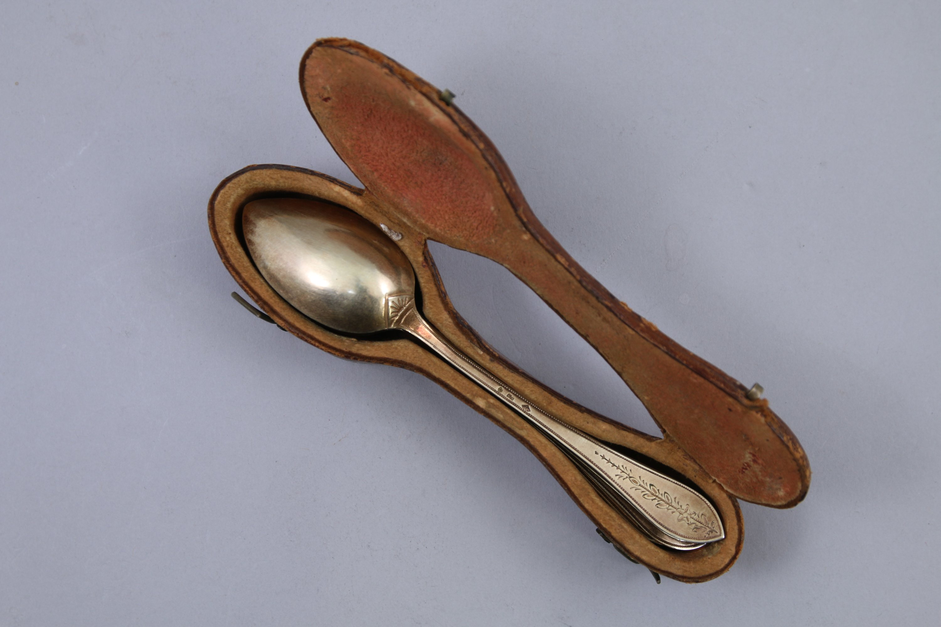 Dans un écrin en cuir épousant la forme des cuillers.