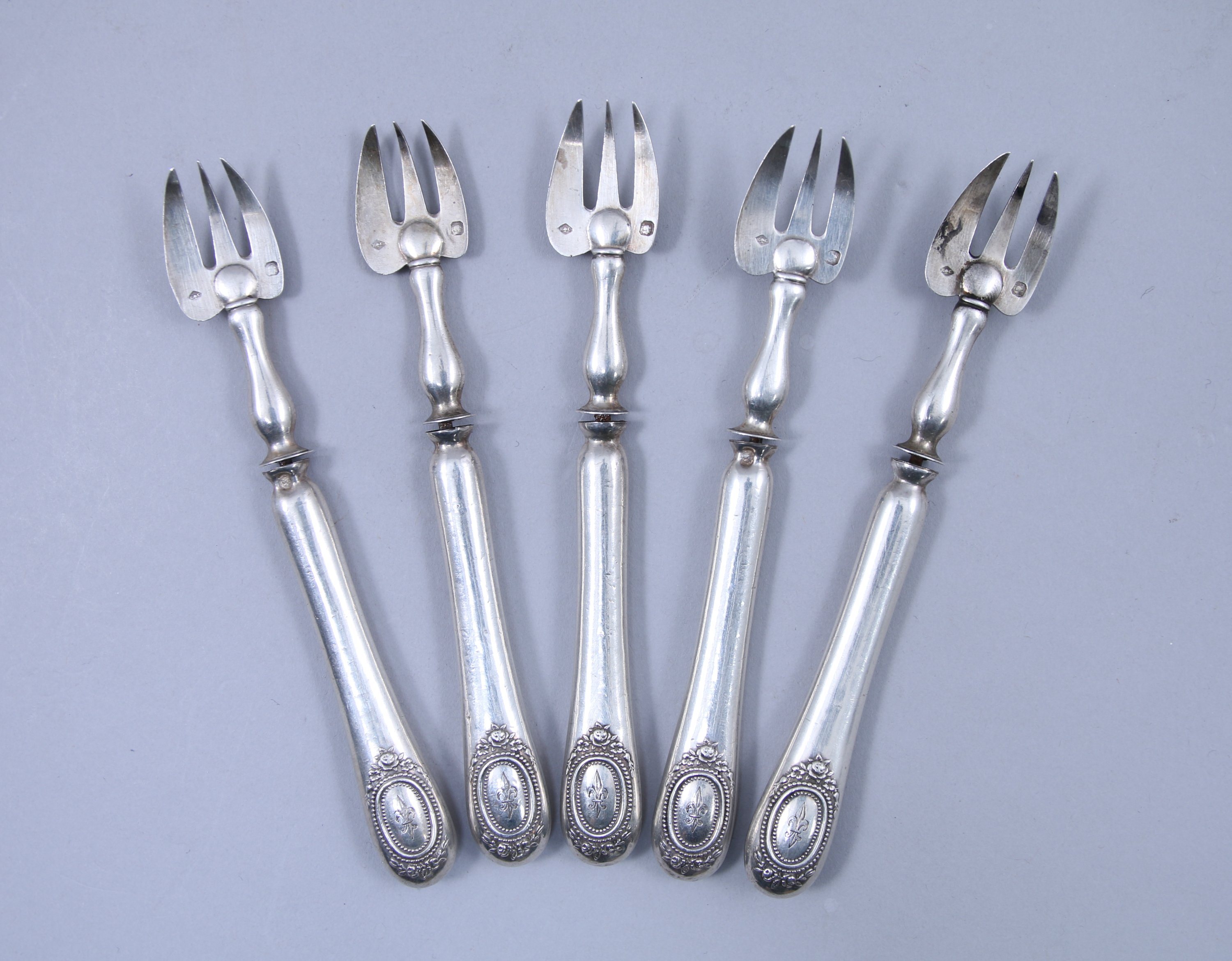 Cinq FOURCHETTES à HUÎTRES, les dents en argent et le manche en argent fourré. Ornées de fleurs de lys dans des cartouches.