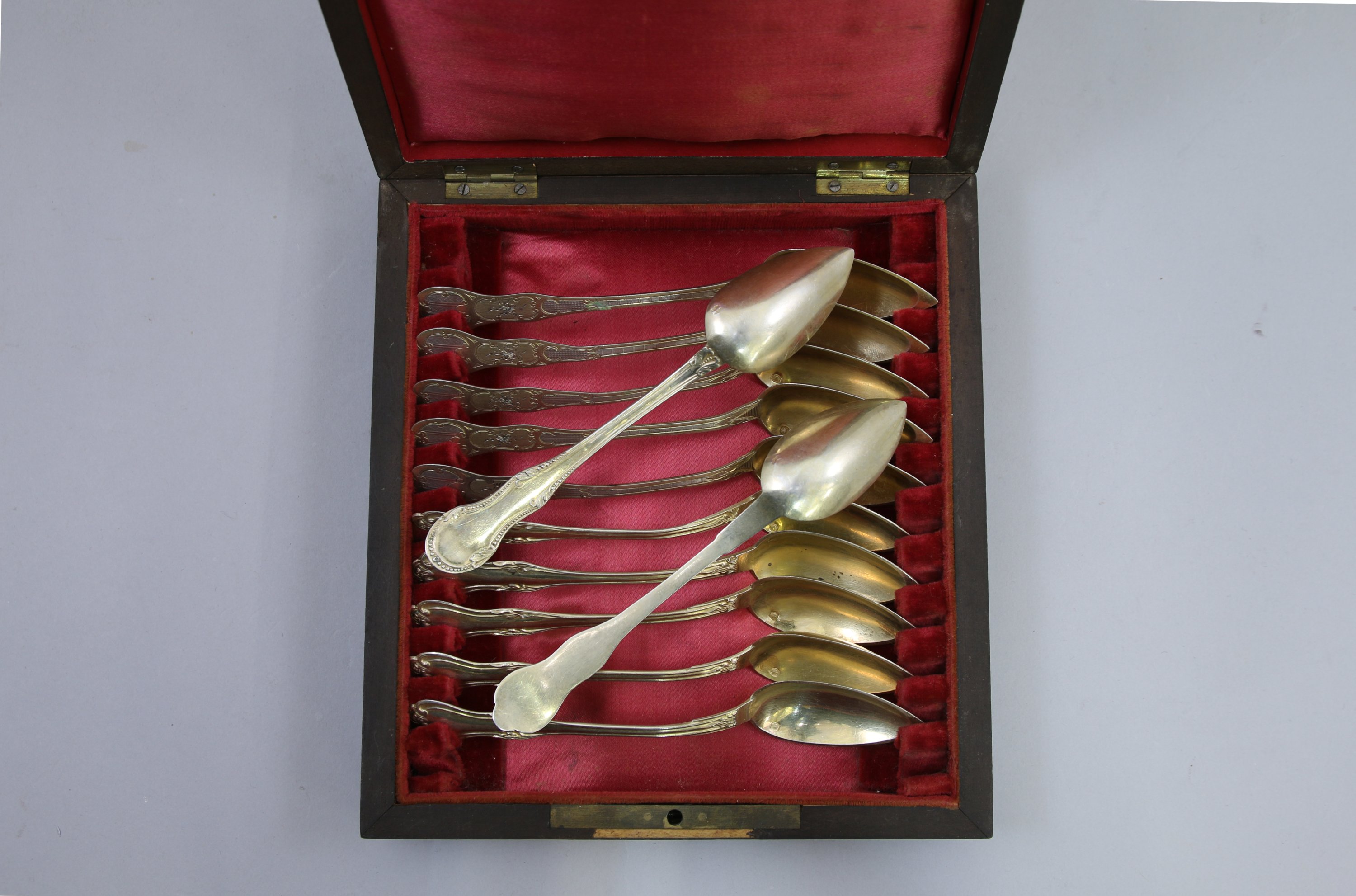 Douze CUILLERS à café en argent doré. Six d'un modèle gravé d'une fleur dans un cartouche, les six autres à filets et rinceaux.