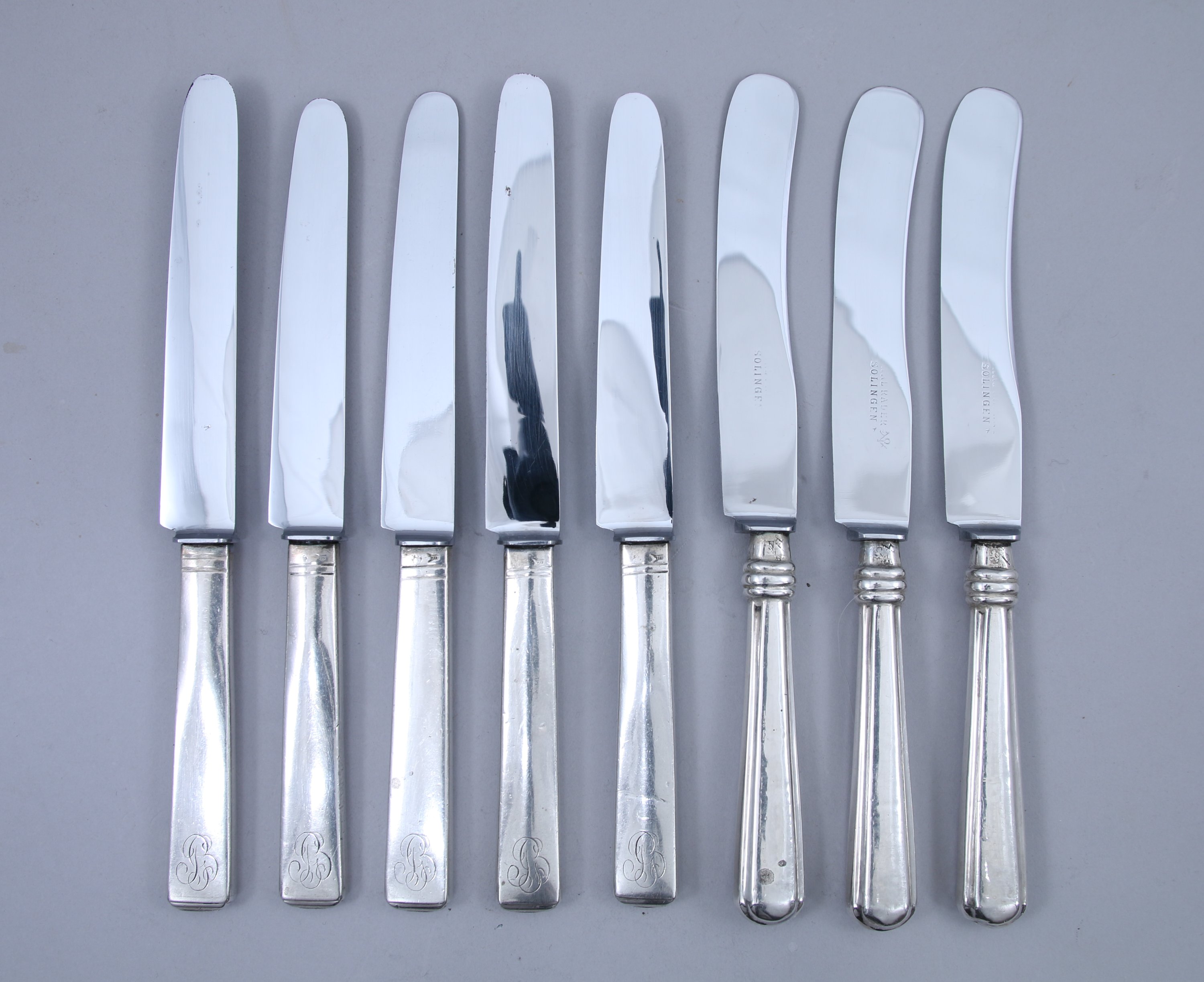 JOINTS: Huit COUTEAUX en argent fourré, les lames en acier reprenant les formes des autres couteaux pour en constituer neuf de chaque sorte.