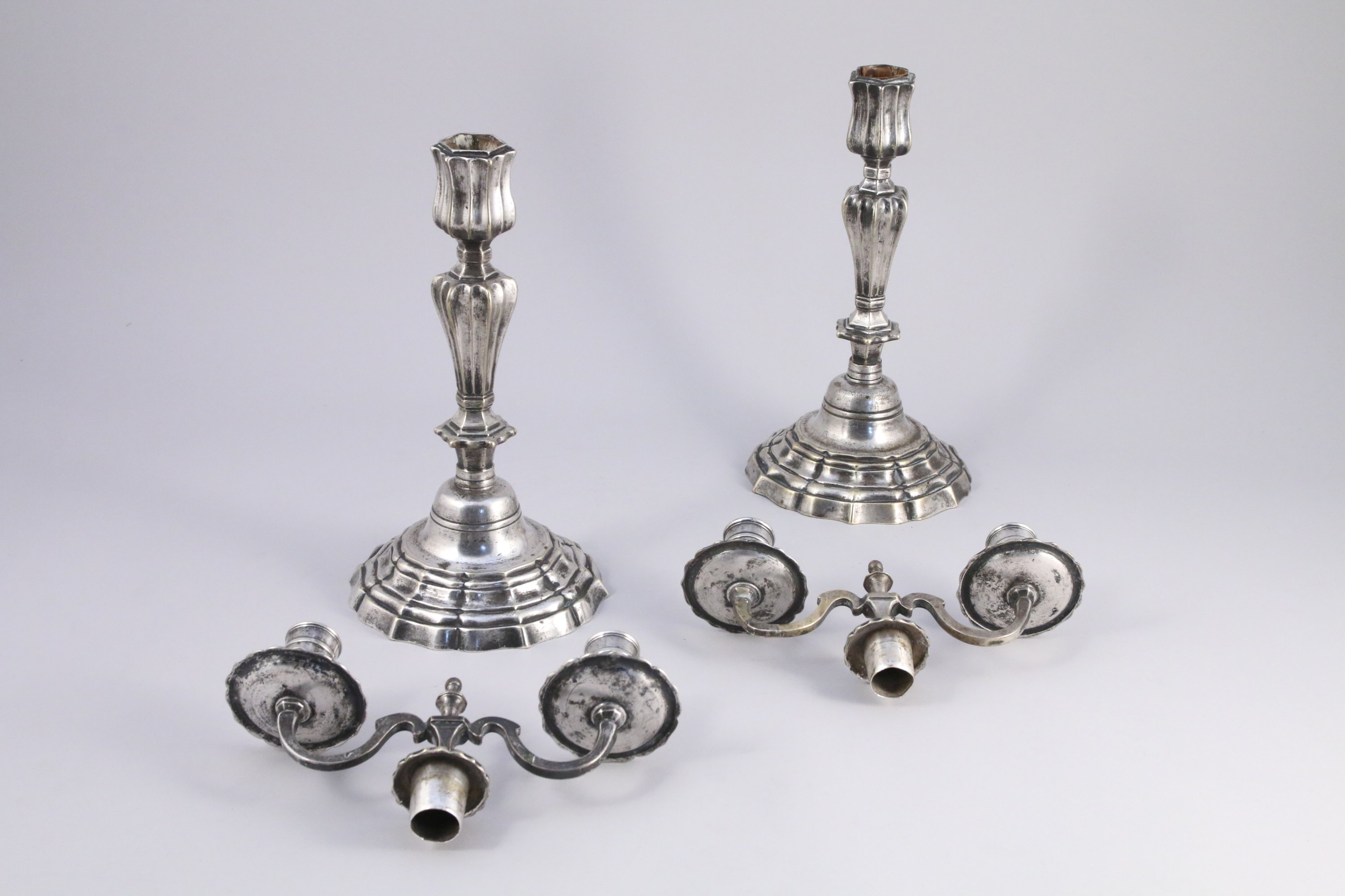 PAIRE de FLAMBEAUX à double lumière en métal argenté reposant...