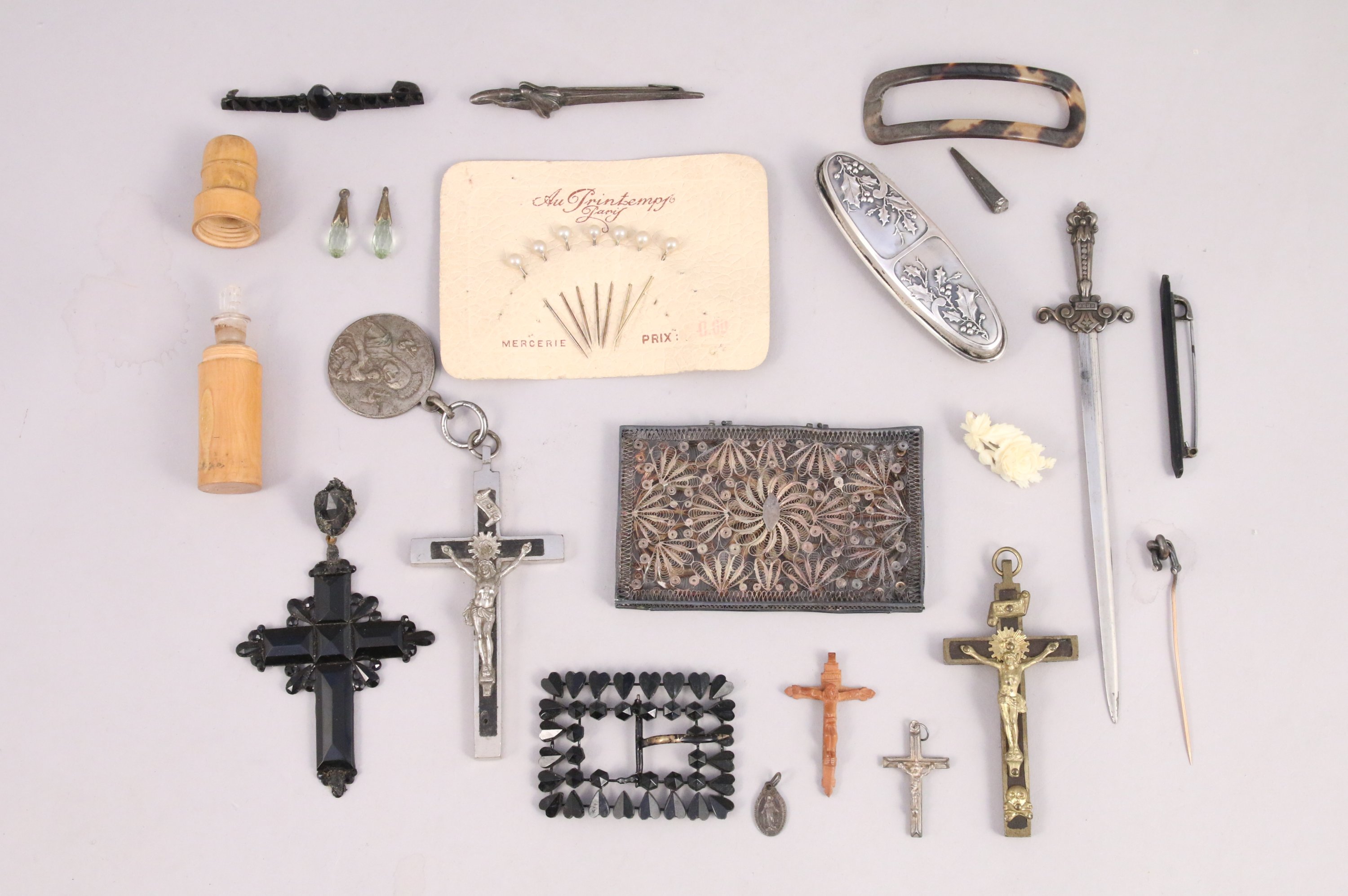 ENSEMBLE de COUVERTS en métal argenté, des REPOSE-COUTEAUX, CRUCIFIX, MÉDAILLES,...