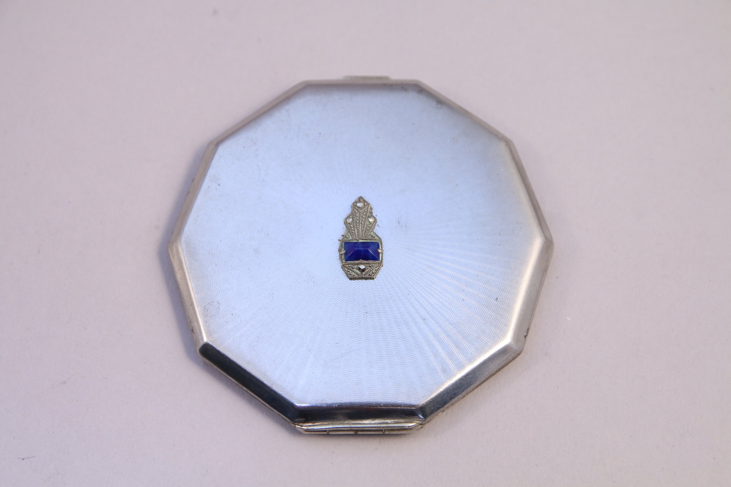 JOINT: une BOITE à FARD ornée d'une pierre bleue et un petit lot de PIÈCES ÉTRANGÈRES (principalement Espagne vers 1950).