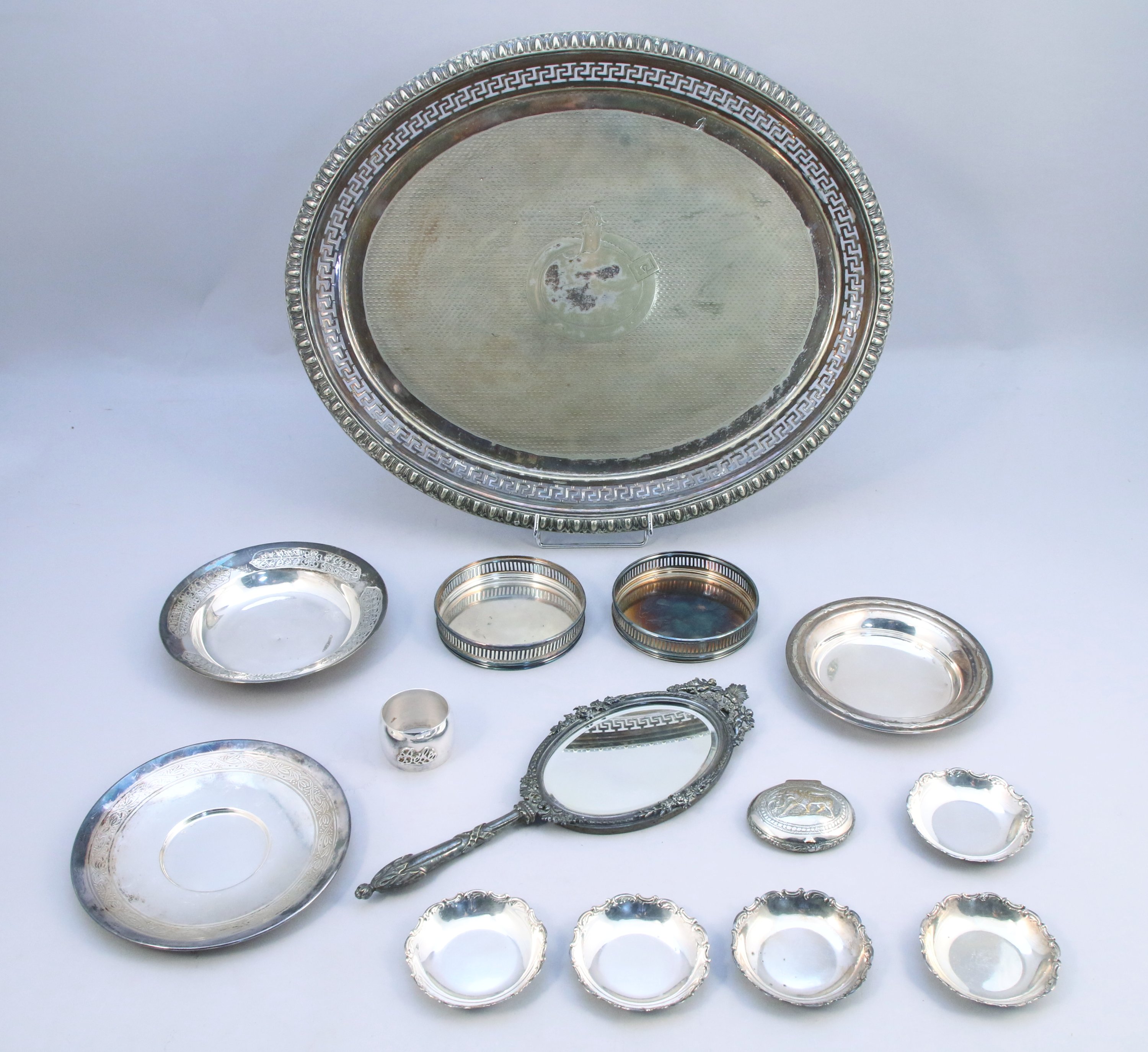 RÉUNION d'OBJETS en métal et métal argenté, dont un grand PLATEAU à décor de Grecques, trois SOUS-COUPES ou DESSOUS DE BOUTEILLE, cinq COUPELLES RINCE-DOIGTS, MIROIR à MAIN, ROND de SERVIETTE, petite BOÎTE à décor repoussé.