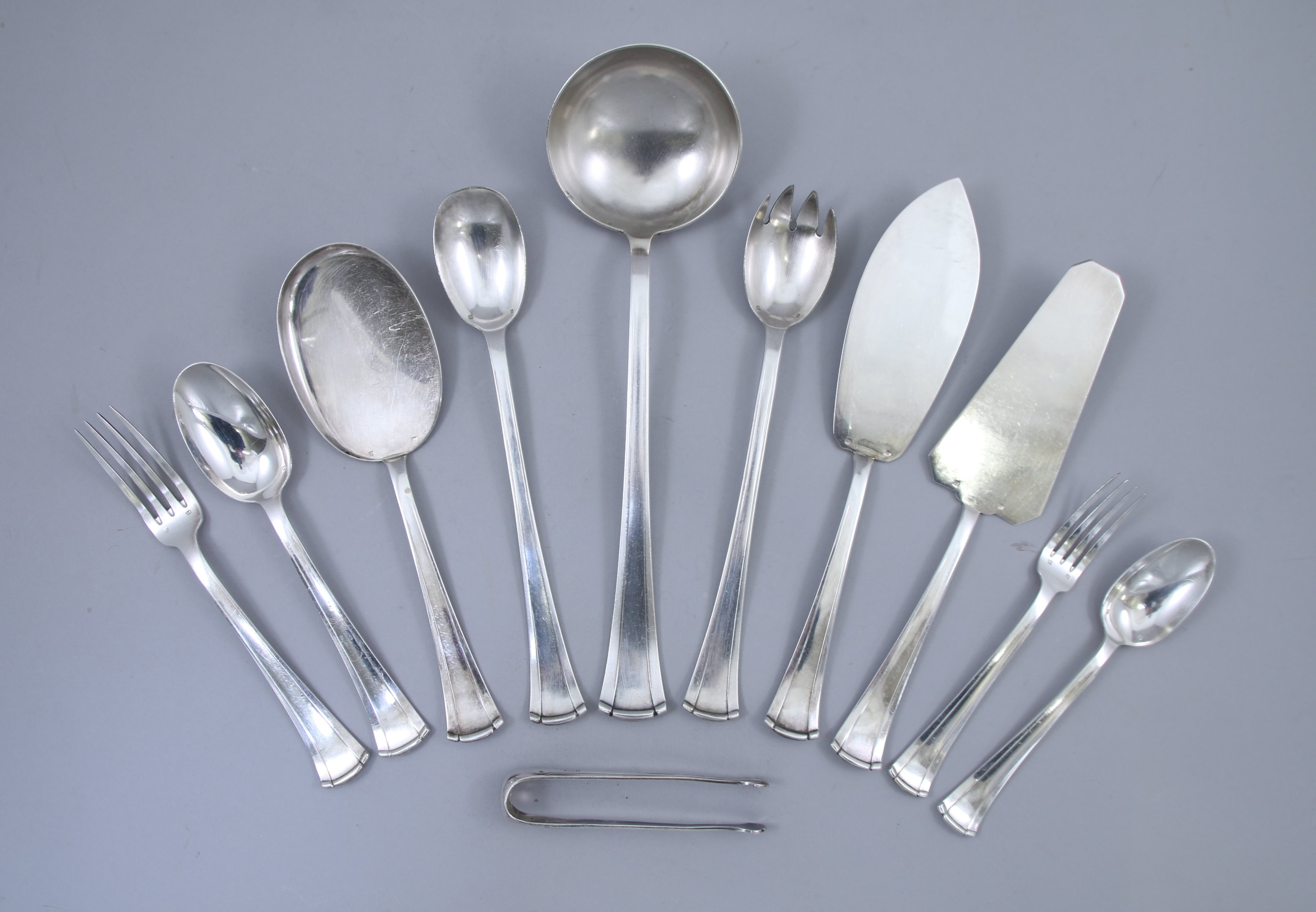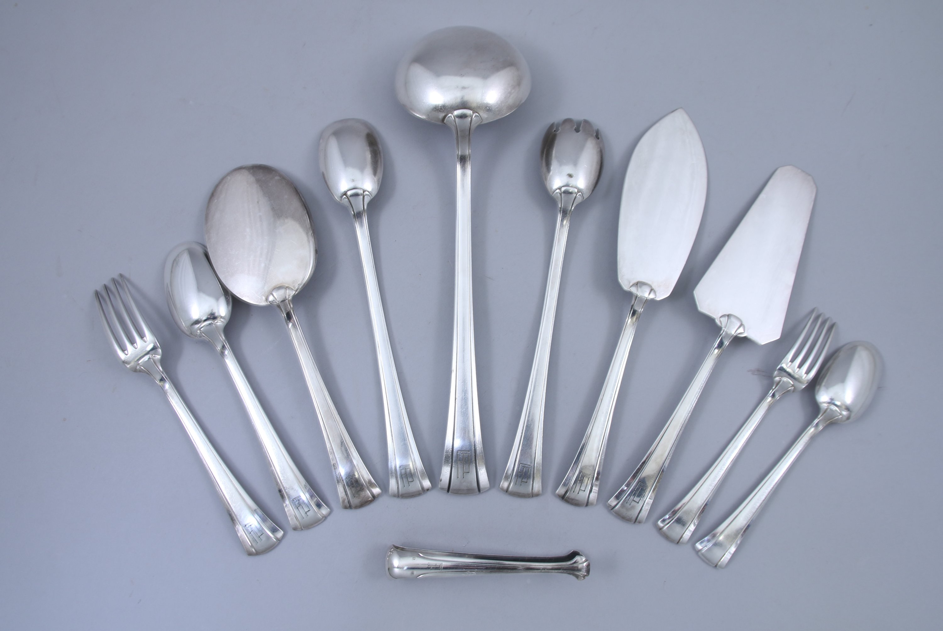 Importante PARTIE de SERVICE en métal argenté, le manche à enroulement stylisé. Il comprend: LOUCHE, trois PELLES, COUVERTS de SERVICE, PINCE à SUCRE, douze GRANDES FOURCHETTES, vingt PETITES FOURCHETTES, douze GRANDES CUILLERS, vingt-et-une PETITES CUILLERS.