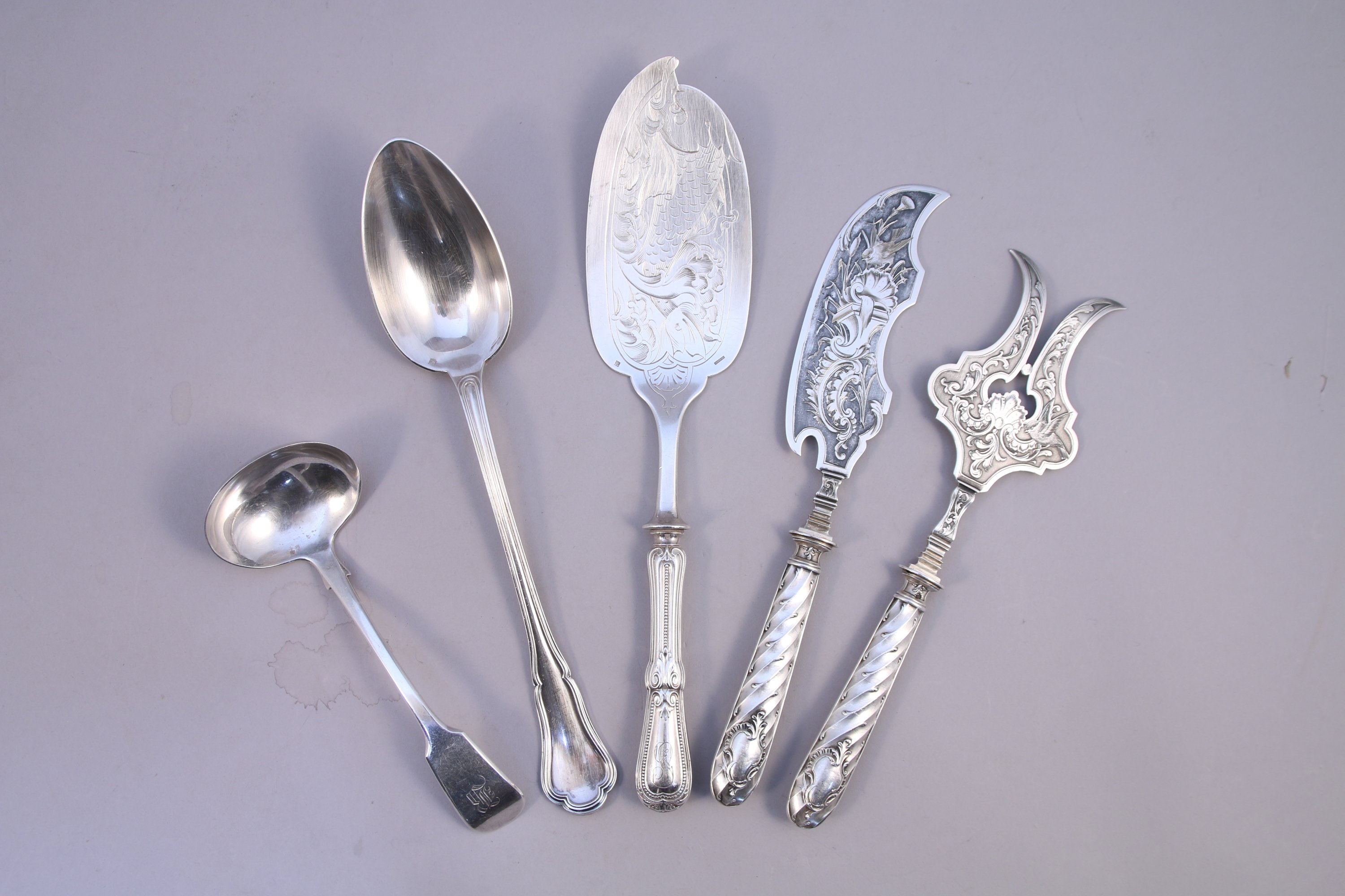 LOT de métal comprenant: une grande CUILLER Christofle, une PELLE à servir Christofle, une CUILLER à sauce anglaise, une FOURCHETTE et PELLE à servir en métal gravé, ornées de volatiles, les manches en argent fourré.