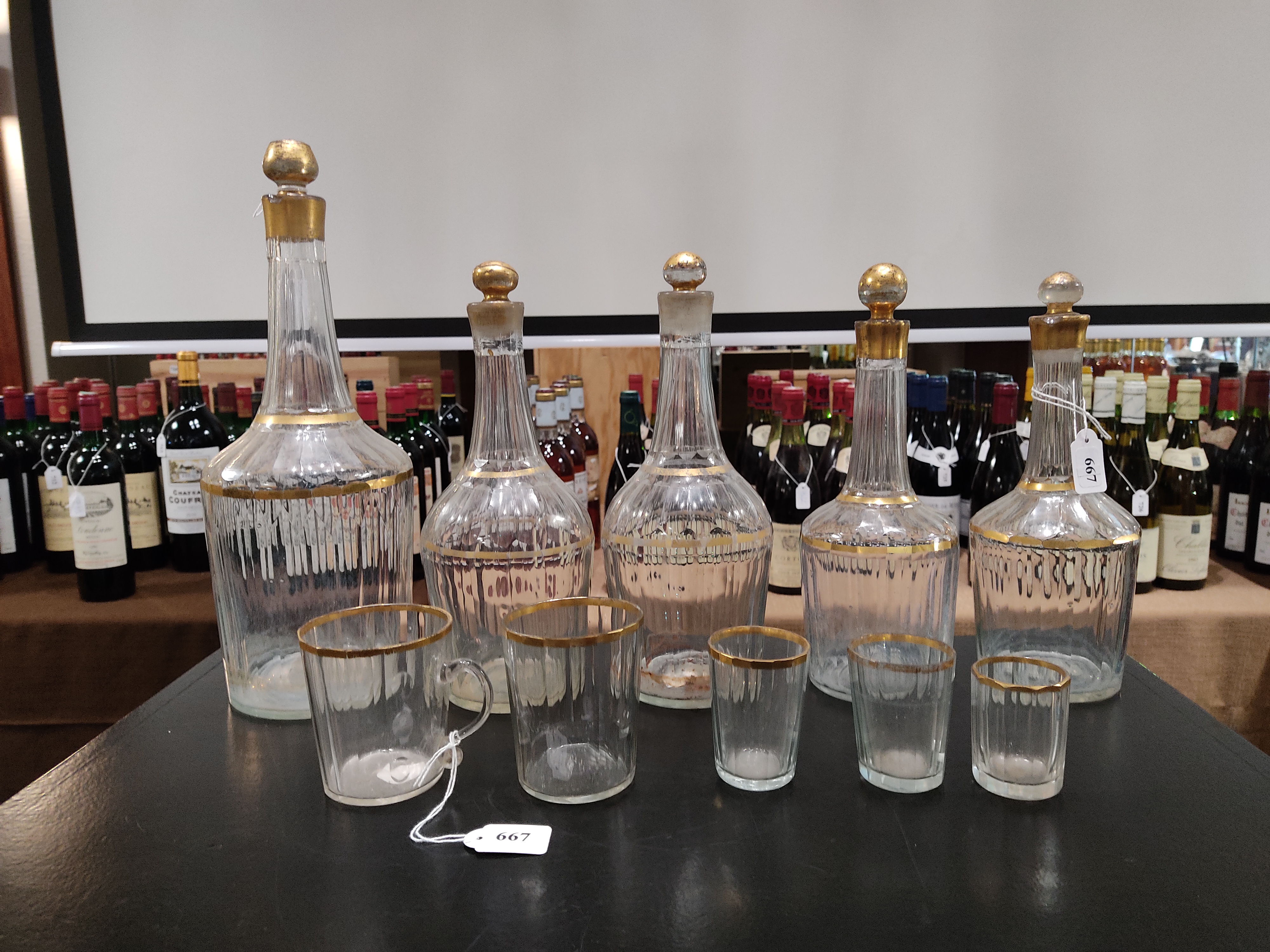 SERVICE de VERRES composé de TRENTE-DEUX pièces: cinq CARAFES à facettes, neuf GOBELETS dont un à anse et quinze petits VERRES à facettes, plus trois de taille inférieure. Doré sur le pourtour.