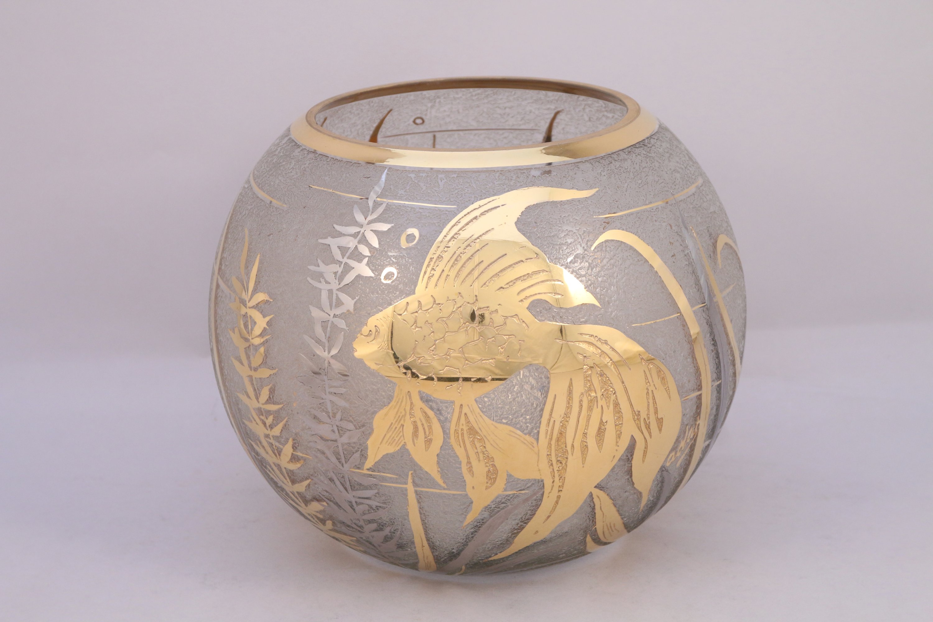 ADAT. Vase boule, circa 1960 en verre givré à décor de poissons dorés, signé.