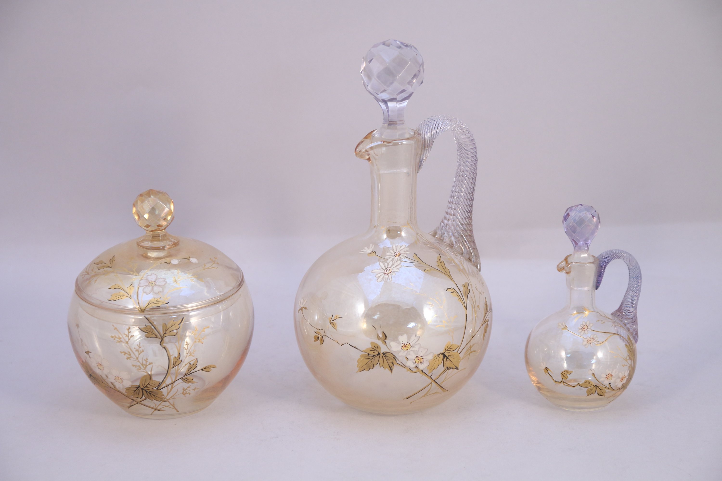Deux CARAFES et une BONBONNIÈRE en verre fumé à décor émaillé et or de fleurs et feuillage. Bouchons facettés. Anses des carafes torsadées.