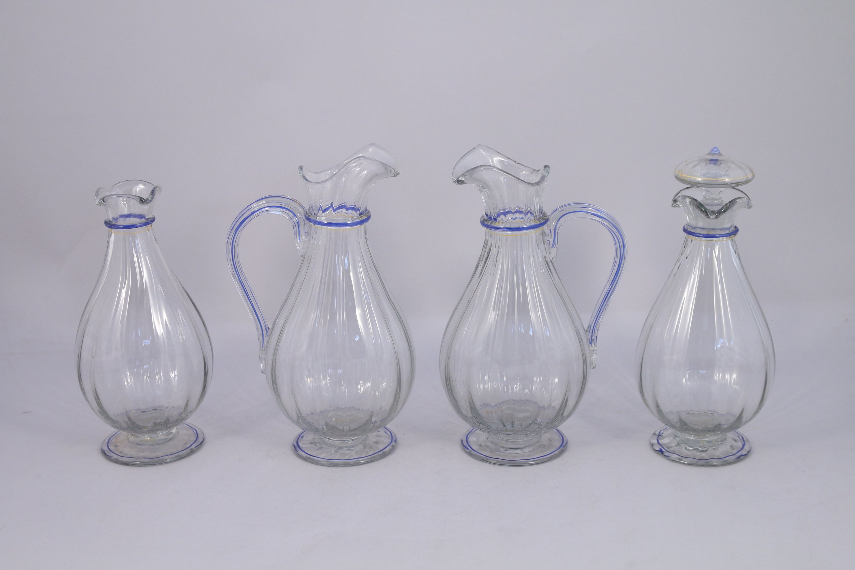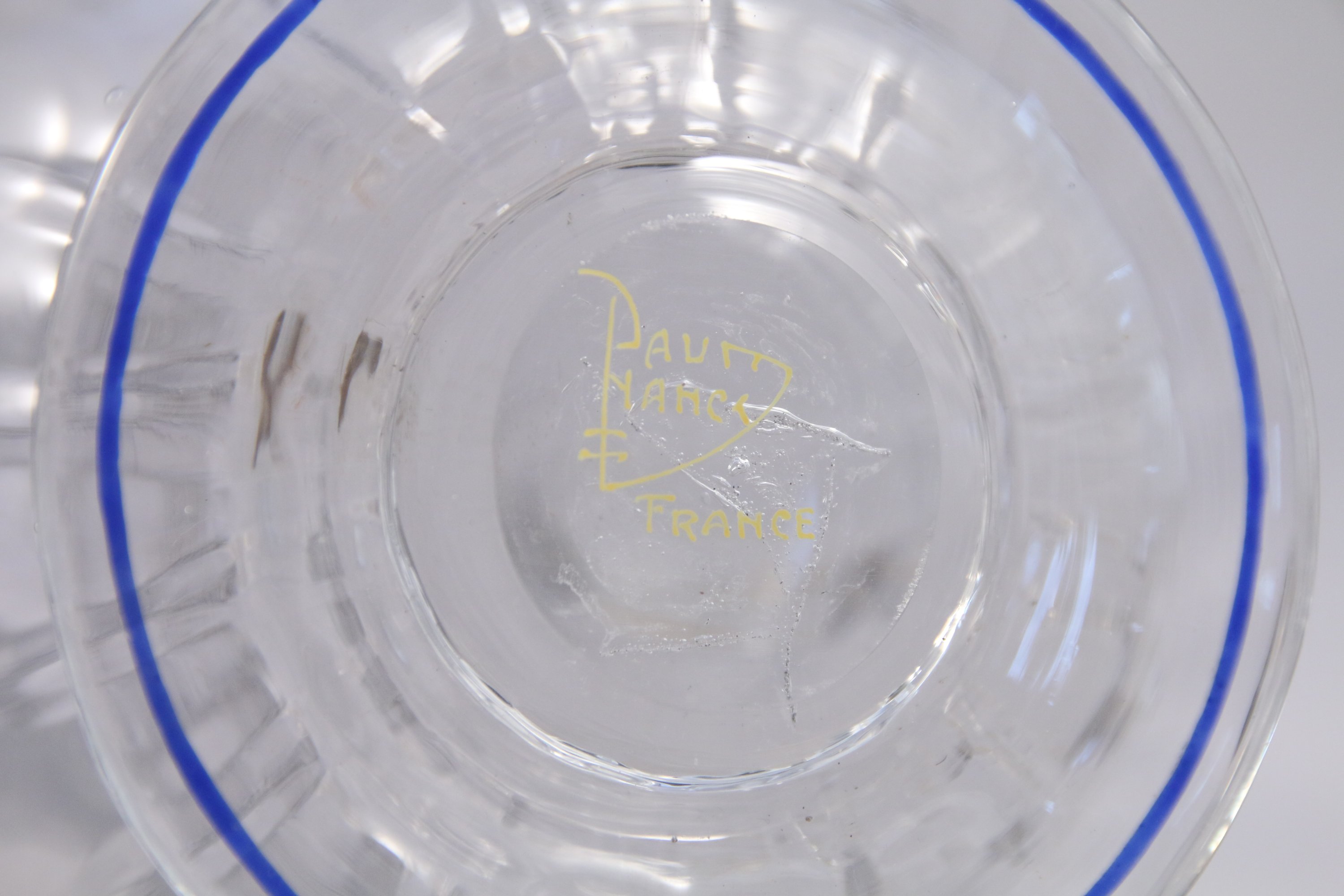 DAUM Nancy, SERVICE de TABLE en verre blanc transparent à décor d'un filet en émail bleu appliqué à la base et au col de chaque élément comprenant QUARANTE-SIX pièces:
