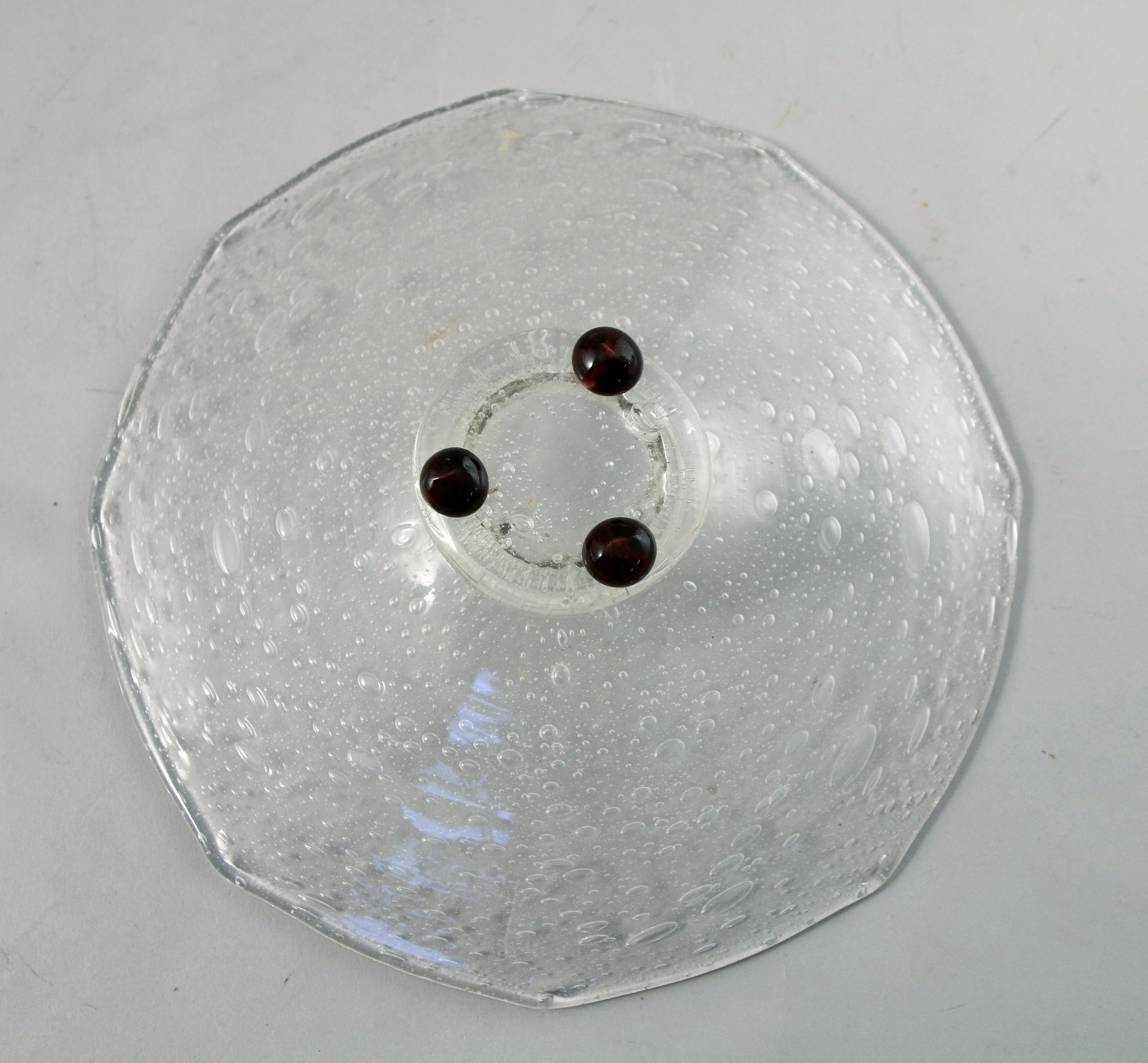 en verre bullé, étiré à la pince en huit points. Reposant sur trois boules violettes. Signée. Circa 1922.