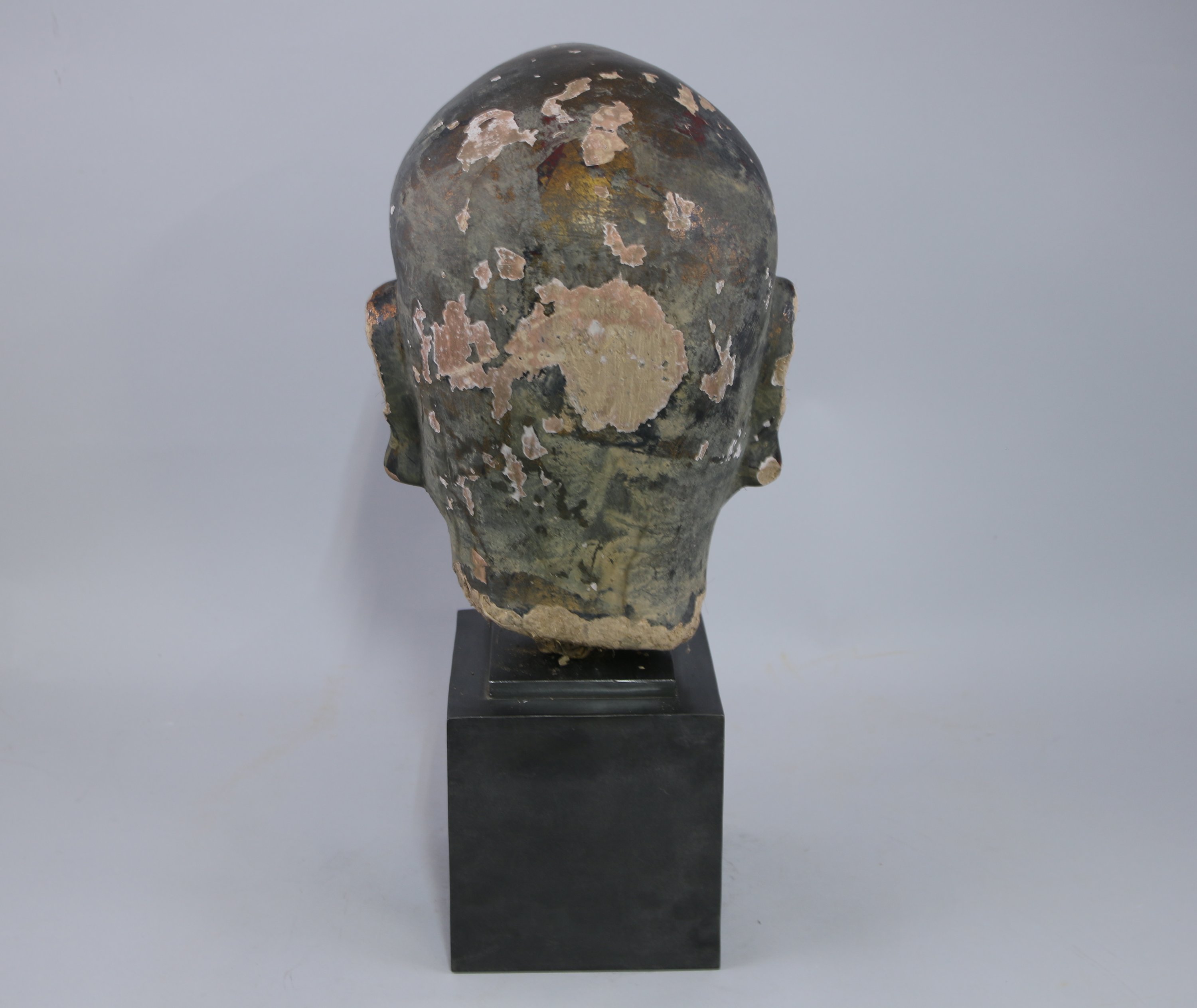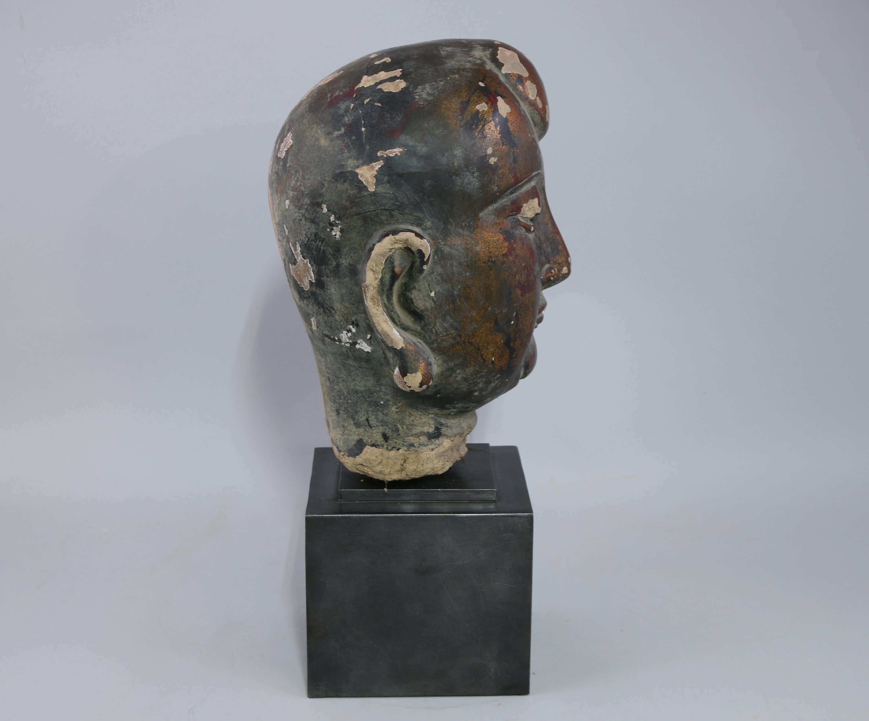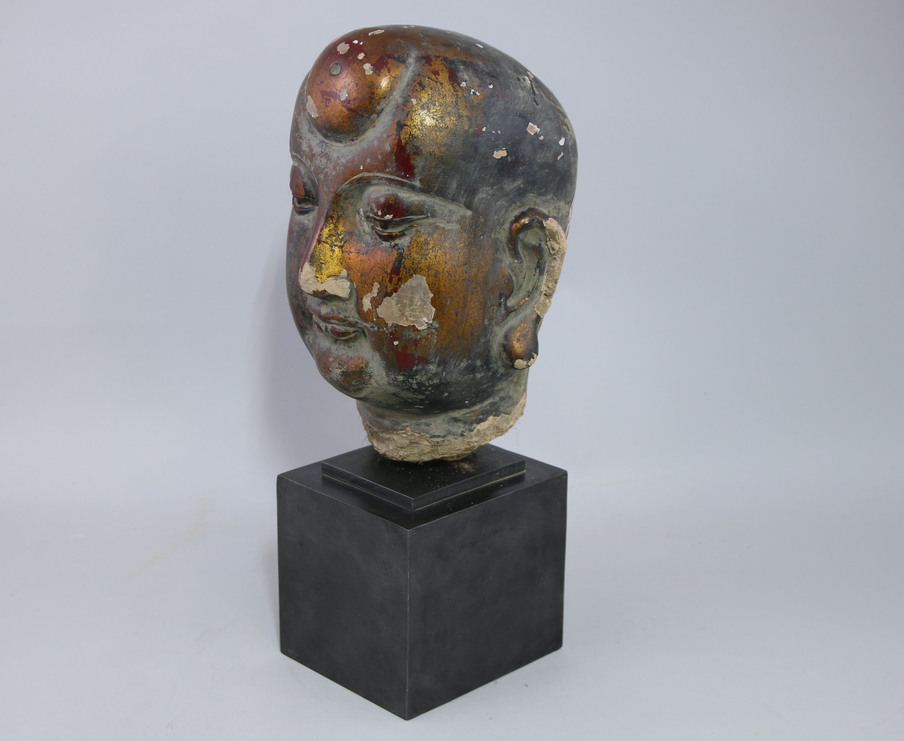 Importante TÊTE de LUOHAN en terre cuite et torchis laqué or et rouge, une protubérance au front, les yeux incrustés de verre.