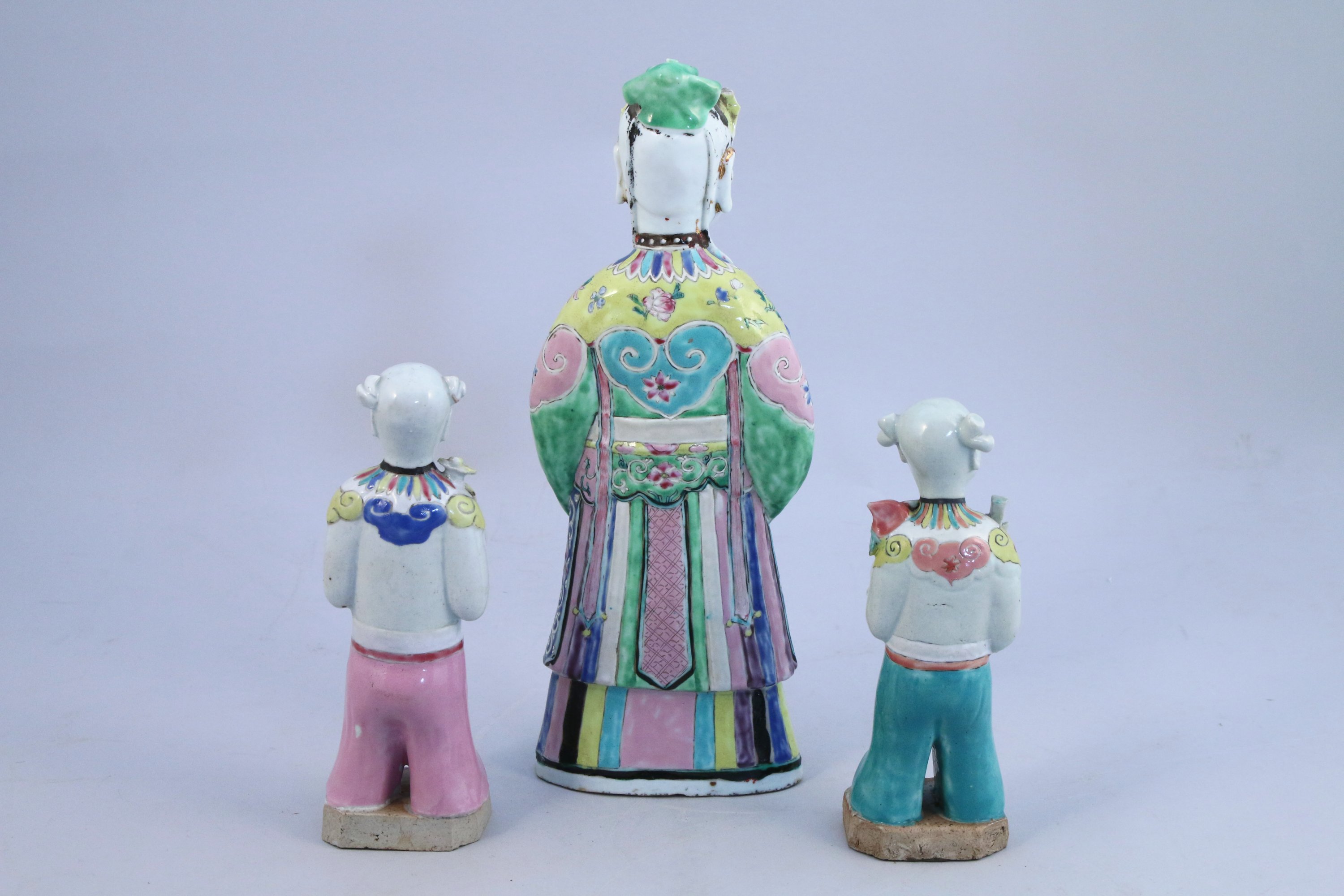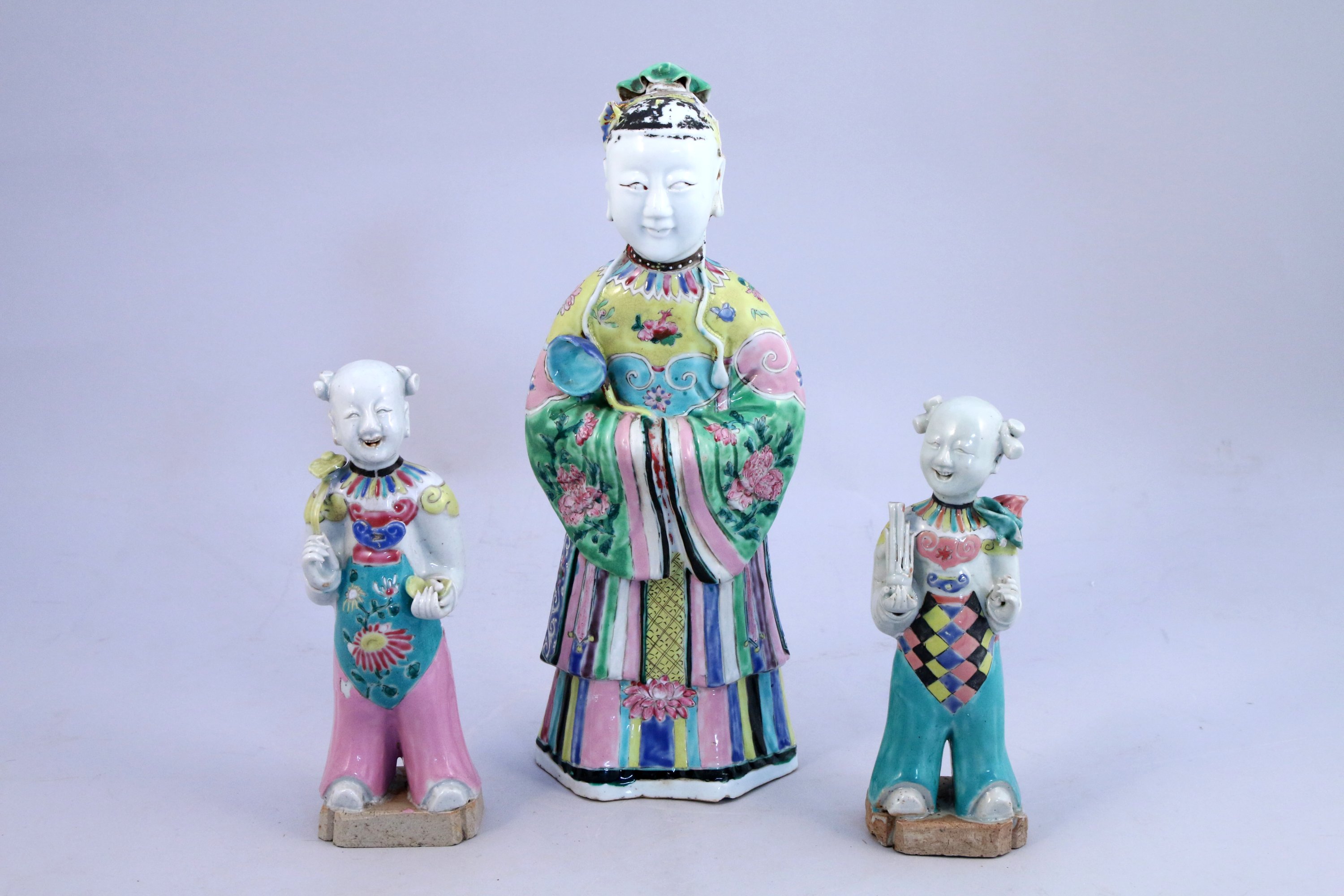 TROIS STATUETTES en porcelaine émaillée polychrome: lettré debout tenant un ruyi, sa robe ornée de rayures, ruyi et fleurs et deux petits enfants, l'un tenant un ruyi, l'autre un sheng, leurs vêtements à motif de fleurs et losanges.