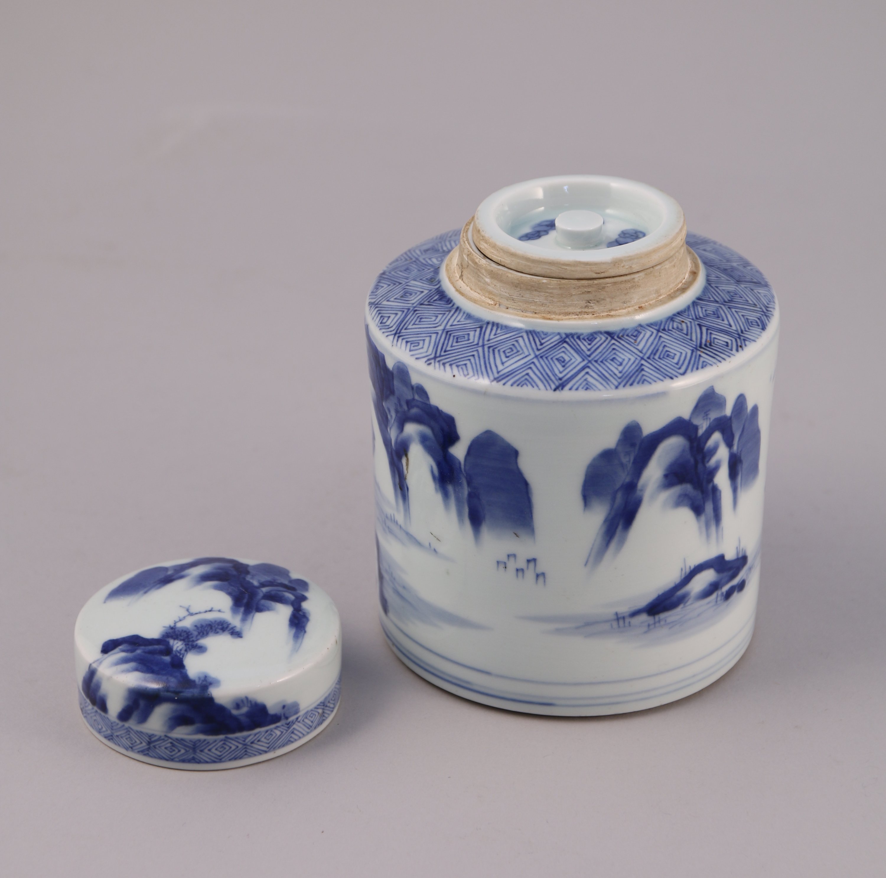 BOÎTE À THÉ en porcelaine à décor en bleu sous couverte de chaumières et de lacs à flanc de montagnes, l'épaule ornée de motifs géométriques.
