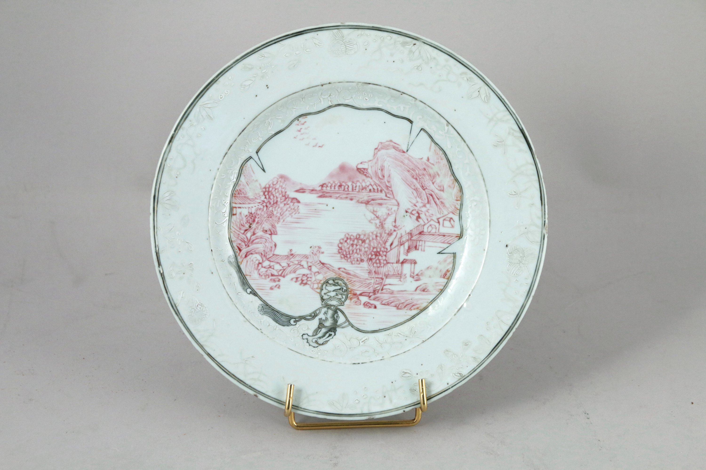 ASSIETTE en porcelaine, famille rose à décor, le marli décoré d'un motif de dentelles,
