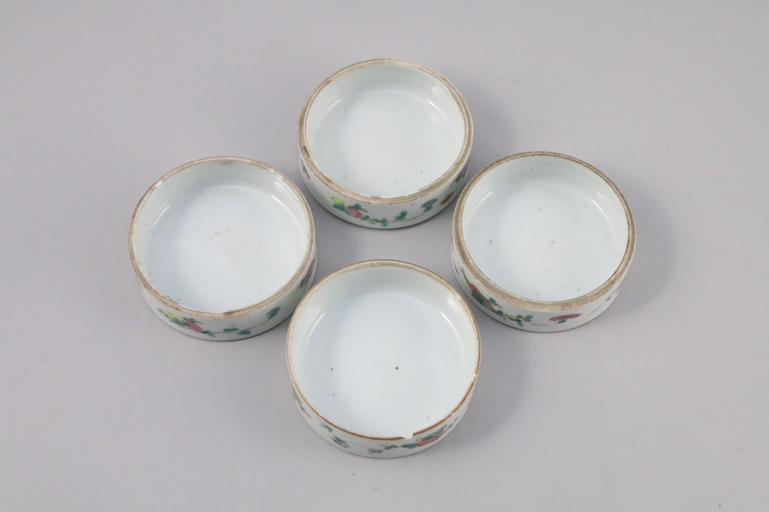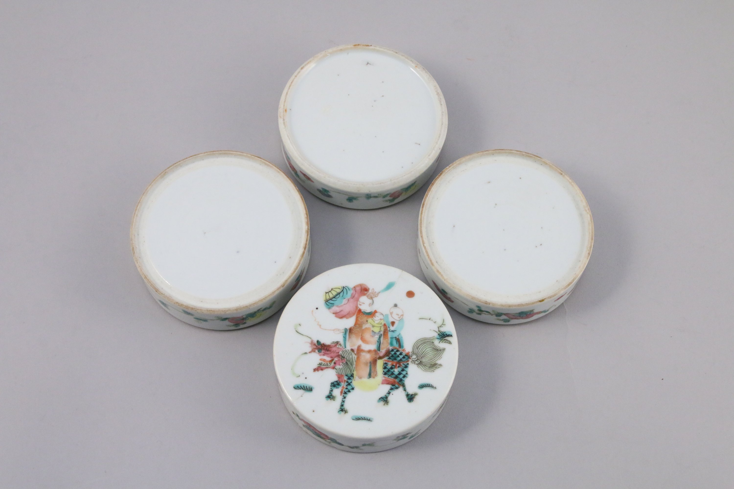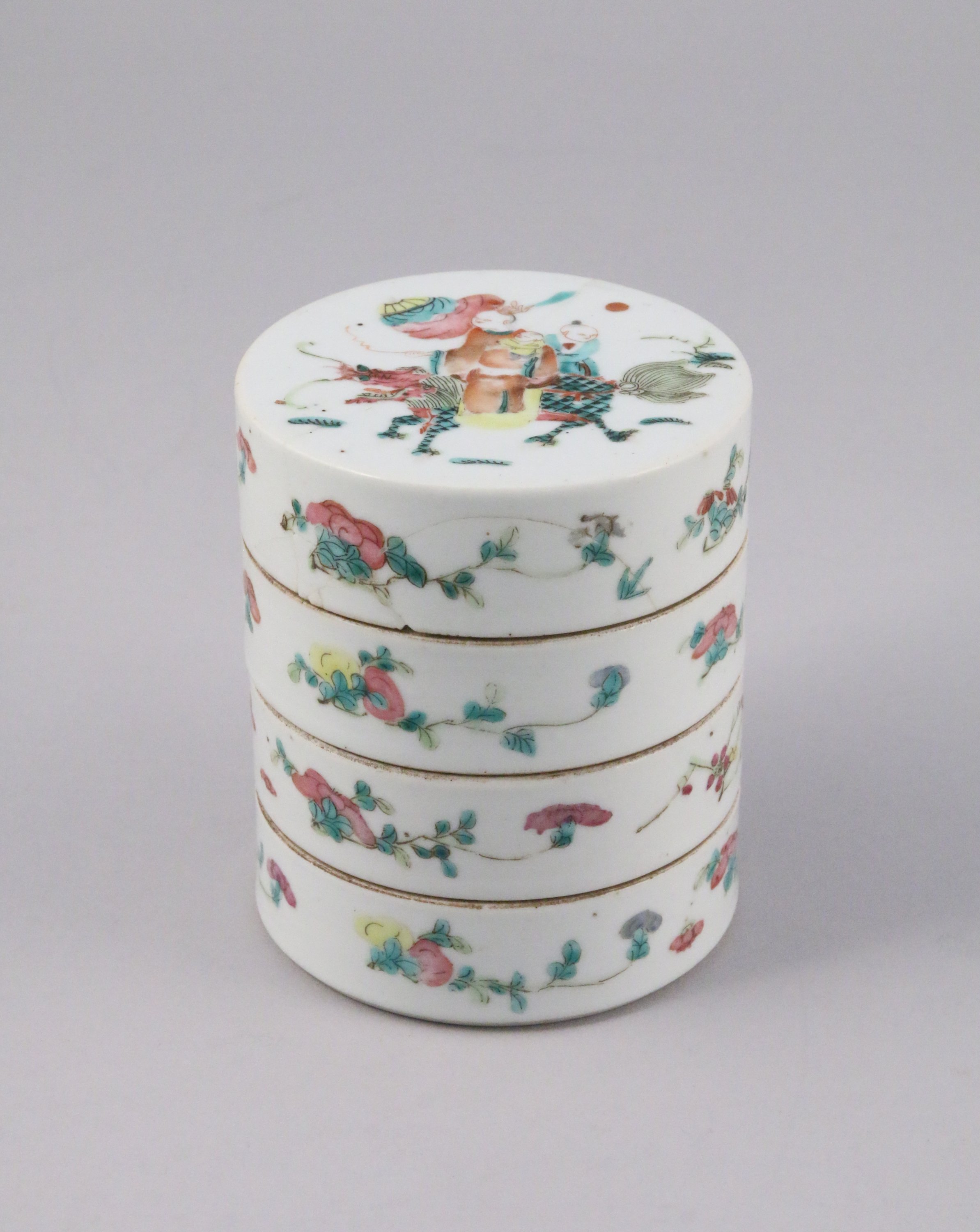 BOÎTE circulaire à quatre compartiments en porcelaine à décor polychrome de fleurs et d'un couple et leur enfant assis sur un dragon en marche.