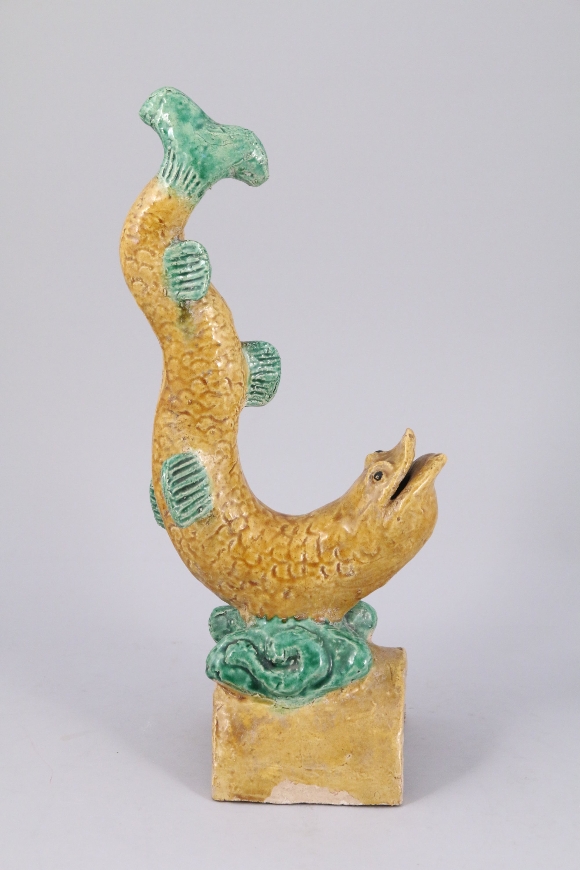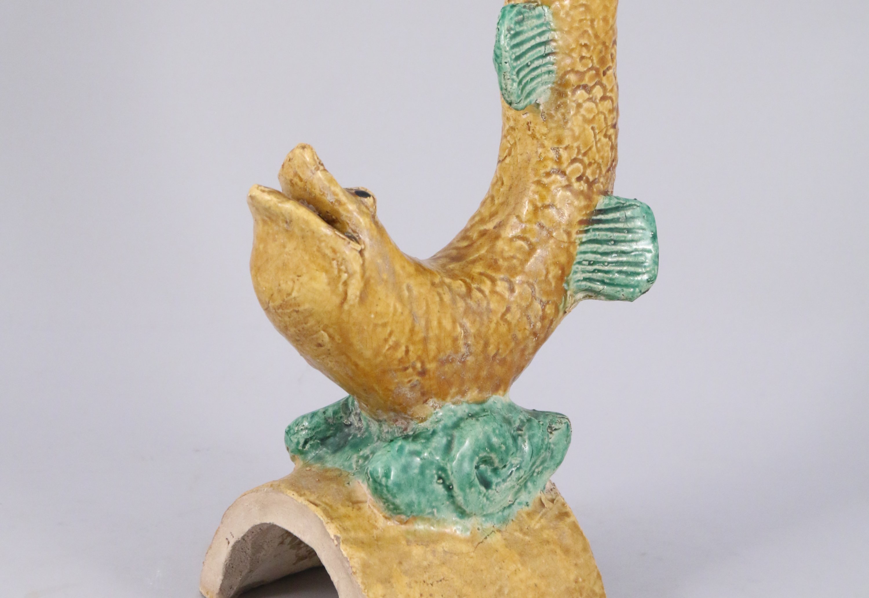 TUILE FAÎTIÈRE en grès émaillé jaune et vert représentant une carpe.