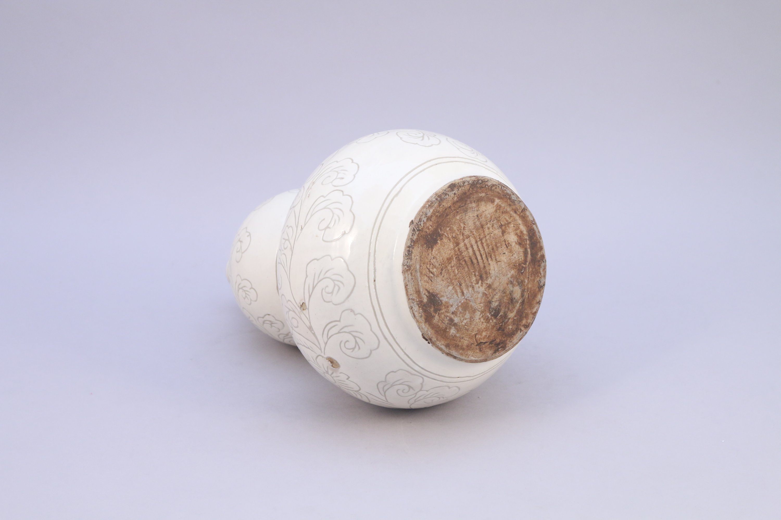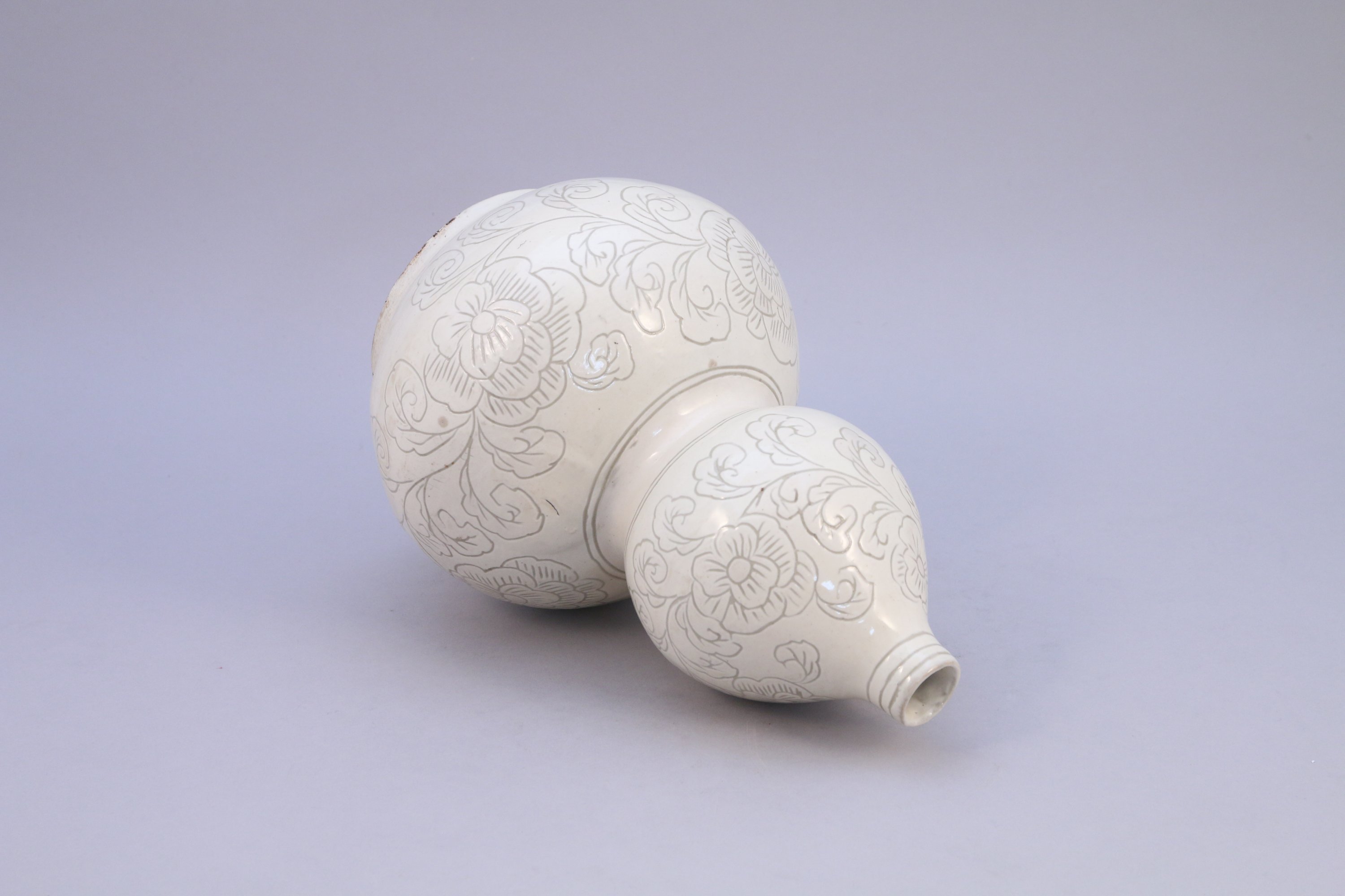 VASE de forme double gourde en grès émaillé blanc et incisé de pivoines dans leur feuillage.
