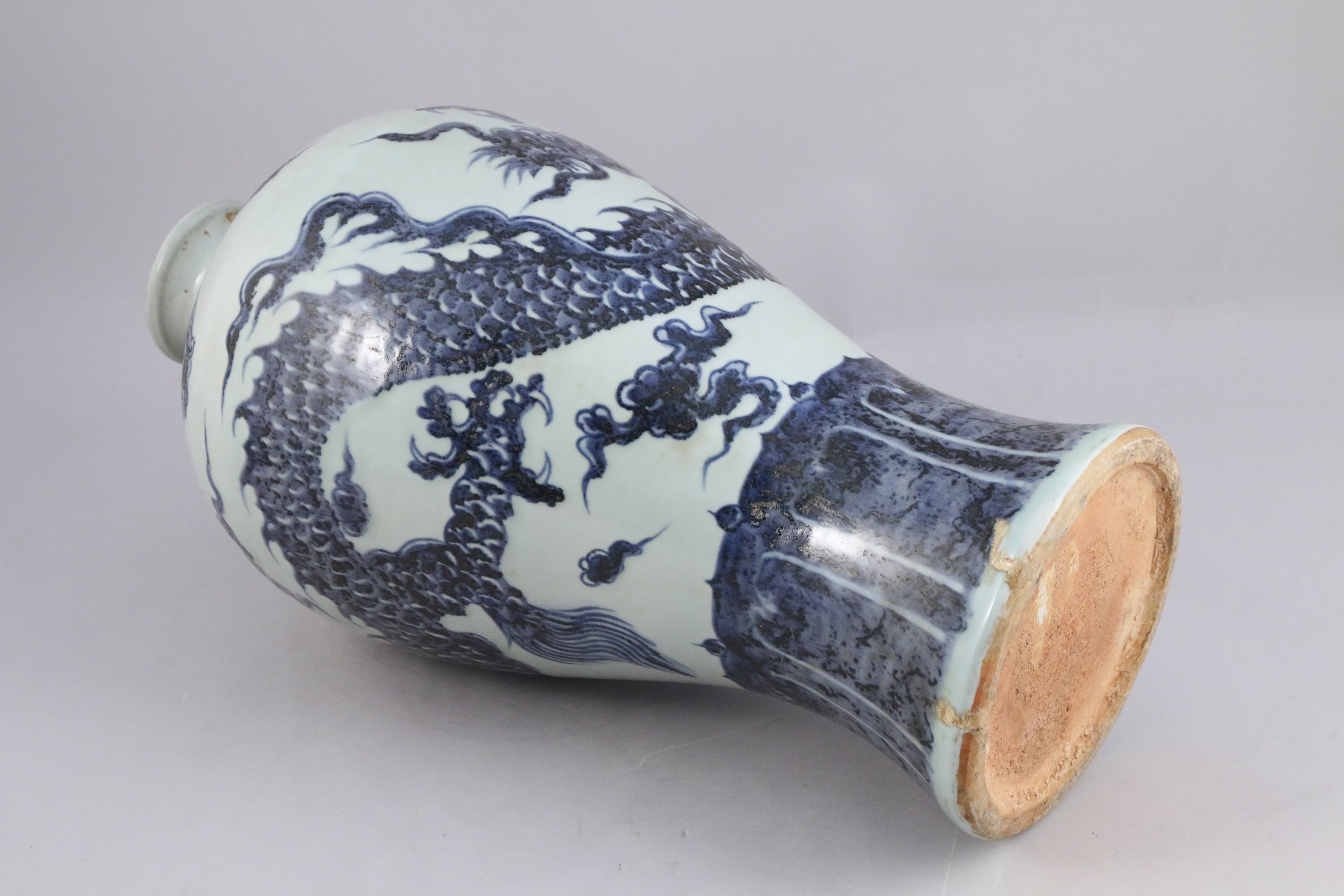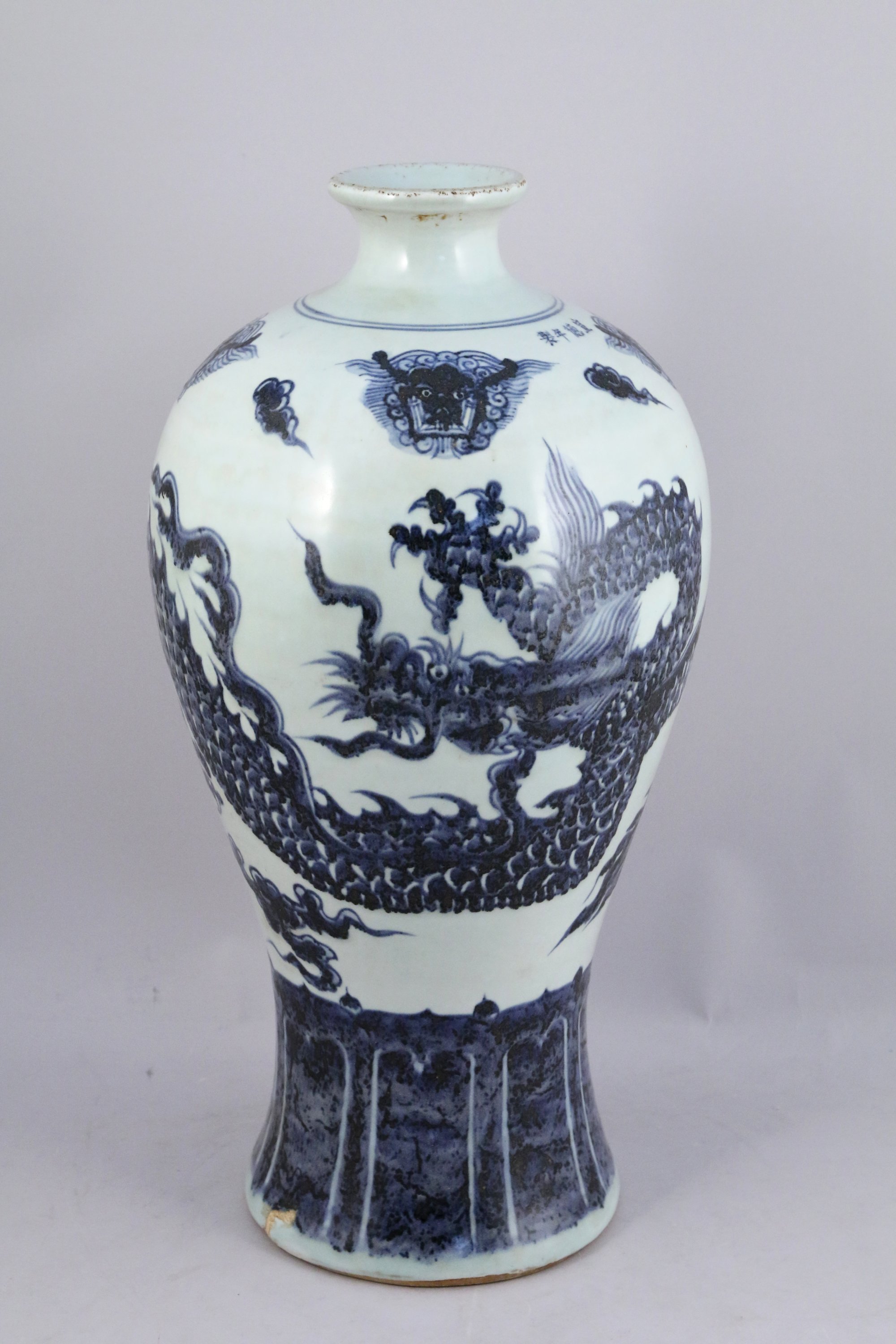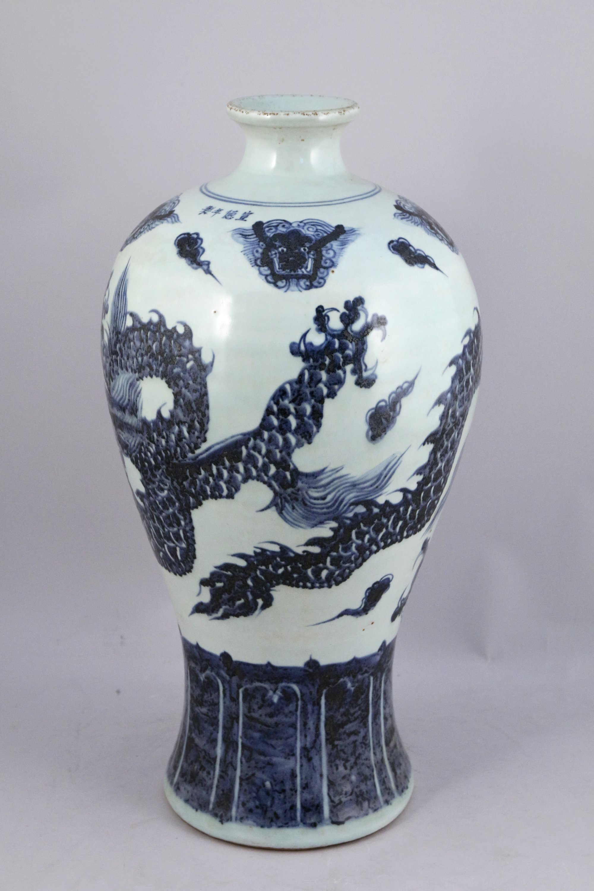 VASE Meiping en porcelaine bleu et blanc à décor d'un dragon à cinq griffes, marque à quatre caractères.